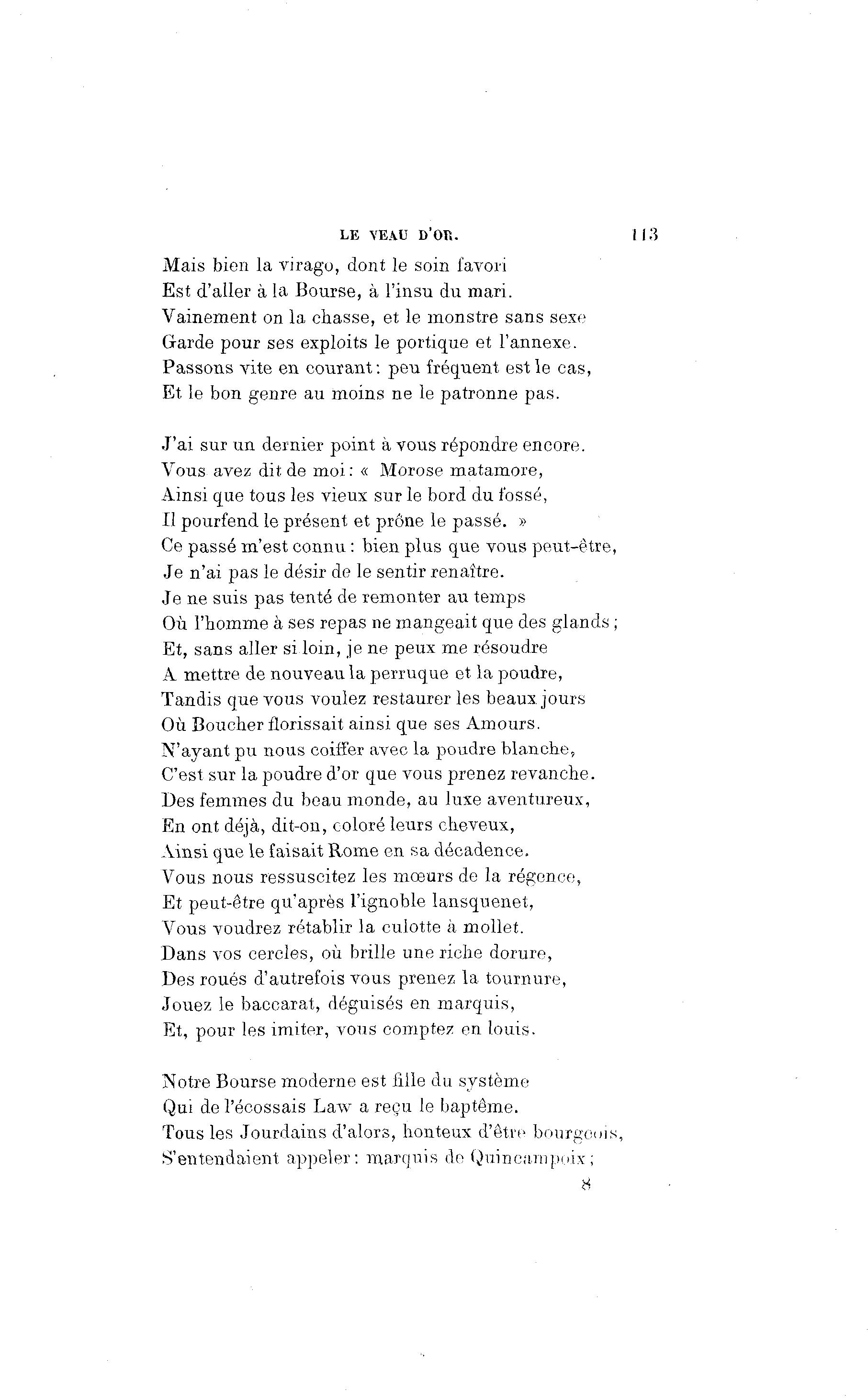 LE VEAU D'OR. II,'} Mais bien la virago, dont le soin favori Est d'aller à la Bourse, à l'insu du mari. Vainement on la chasse, et le monstre sans sexe Garde pour ses exploits le portique et l'annexe. Passons vite en courant: peu fréquent est le cas, Et le bon genre au moins ne le patronne pas. J'ai sur un dernier point à vous répondre encore. Vous avez dit de moi: « Morose matamore, Ainsi que tous les vieux sur le bord du fossé, Il pourfend le présent et prône le passé. » Ce passé m'est connu : bien plus que vous peut-être, Je n'ai pas le désir de le sentir renaître. Je ne suis pas tenté de remonter au temps Où l'homme à ses repas ne mangeait que des glands ; Et, sans aller si loin, je ne peux me résoudre A mettre de nouveau la perruque et la poudre, Tandis que vous voulez restaurer les beaux jours Où Boucher florissait ainsi que ses Amours. N'ayant pu nous coiffer avec la poudre blanche. C'est sur la poudre d'or que vous prenez revanche. Des femmes du beau monde, au luxe aventureux, En ont déjà , dit-on, coloré leurs cheveux, Ainsi que le faisait Rome en sa décadence. Vous nous ressuscitez les moeurs de la régence, Et peut-être qu'après l'ignoble lansquenet, Vous voudrez rétablir la culotte à mollet. Dans vos cercles, où brille une riche dorure, Des roués d'autrefois vous prenez la tournure, Jouez le baccarat, déguisés en marquis, Et, pour les imiter, vous comptez en louis. Notre Bourse moderne est fille du système Qui de l'écossais L a v a reçu le baptême. Tous les Jourdains d'alors, honteux d'être bourgeois, S'entendaient appeler: marquis de Quincampoix;