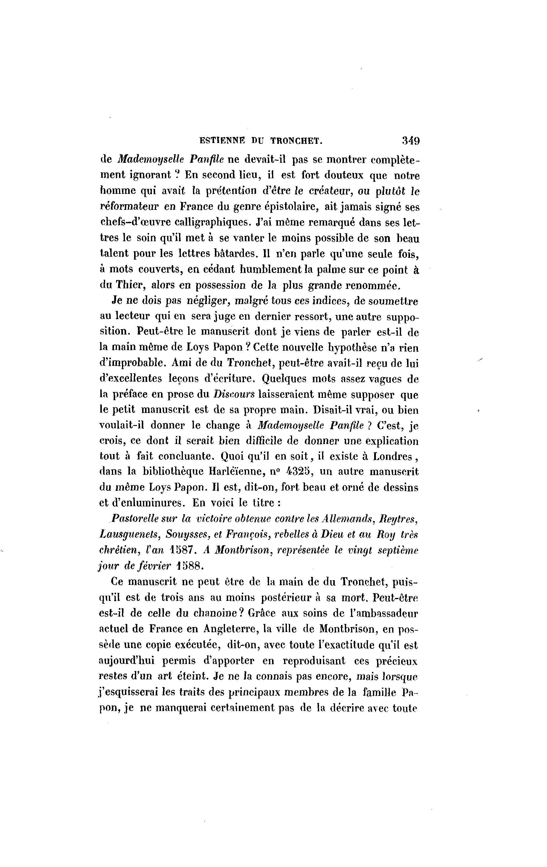 ESTIENNE DU TRONCHET. 349 de Mademoyselle Panftle ne devait-il pas se montrer complète- ment ignorant '.' En second lieu, il est fort douteux que notre homme qui avait la prétention d'être le créateur, ou plutôt le réformateur en France du genre epistolaire, ait jamais signé ses chefs-d'œuvre calligraphiques. J'ai même remarqué dans ses let- tres le soin qu'il met à se vanter le moins possible de son beau talent pour les lettres bâtardes. Il n'en parle qu'une seule fois, à mots couverts, en cédant humblement la palme sur ce point à du Thier, alors en possession de la plus grande renommée. Je ne dois pas négliger, malgré tous ces indices, de soumettre au lecteur qui en sera juge en dernier ressort, une autre suppo- sition. Peut-être le manuscrit dont je viens de parler est-il de la main même de Loys Papon ? Cette nouvelle hypothèse n'a rien d'improbable. Ami de du Tronehet, peut-être avait-il reçu de lui d'excellentes leçons d'écriture. Quelques mots assez vagues de la préface en prose du Discours laisseraient même supposer que le petit manuscrit est de sa propre main. Disait-il vrai, ou bien voulait-il donner le change à Mademoyselle Panfile ? C'est, je crois, ce dont il serait bien difficile de donner une explication tout à fait concluante. Quoi qu'il en soit, il existe à Londres, dans la bibliothèque Harléïenne, n° 4325, un autre manuscrit du même Loys Papon. Il est, dit-on, fort beau et orné de dessins et d'enluminures. En voici le titre : Pastorelle sur la victoire obtenue contre les Allemands, Reylres, Lausguenets, Souysses, et François, rebelles à Dieu et au Roy très chrétien, Van 1587. A Montbrison, représentée le vingt septième jour de février 1588. Ce manuscrit ne peut être de la main de du Tronehet, puis- qu'il est de trois ans au moins postérieur à sa mort. Peut-être est-il de celle du chanoine? Grâce aux soins de l'ambassadeur actuel de France en Angleterre, la ville de Montbrison, en pos- sède une copie exécutée, dit-on, avec toute l'exactitude qu'il est aujourd'hui permis d'apporter en reproduisant ces précieux restes d'un art éteint. Je ne la connais pas encore, mais lorsque j'esquisserai les traits des principaux membres de la famille Pa- pon, je ne manquerai certainement pas de la décrire avec toute