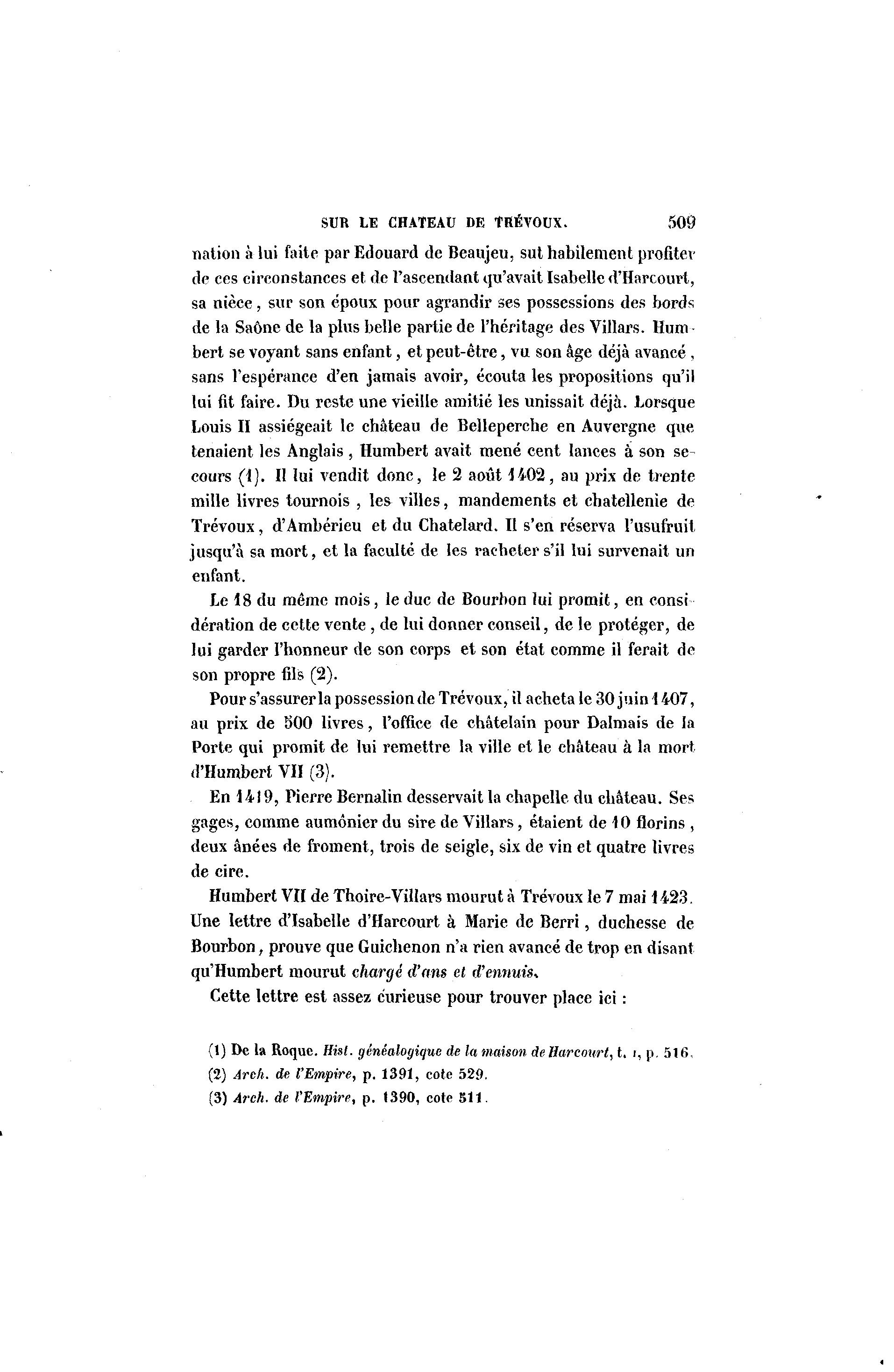 SUR LE CHATEAU DE tRÉVOUX. 509 nation à lui faite par Edouard de Beaujeu, sut habilement profiter de ces circonstances et de l'ascendant qu'avait Isabelle d'Harcourt, sa nièce, sur son époux pour agrandir ses possessions des bords de la Saône de la plus belle partie de l'héritage des Villars. Hum- bert se voyant sans enfant, et peut-être, vu son âge déjà avancé , sans l'espérance d'en jamais avoir, écouta les propositions qu'il lui fit faire. Du reste une vieille amitié les unissait déjà . Lorsque Louis II assiégeait le château de Belleperche en Auvergne que tenaient les Anglais , Humbert avait mené cent lances à son se- cours (1). Il lui vendit donc, le 2 août 4402, au prix de trente mille livres tournois , les villes, mandements et chatellenie de Trévoux, d'Ambérieu et du Chatelard. Il s'en réserva l'usufruit jusqu'à sa mort, et la faculté de les racheter s'il lui survenait un enfant. Le 18 du même mois, le duc de Bourbon lui promit, eu consi dération de cette vente , de lui donner conseil, de le protéger, de lui garder l'honneur de son corps et son état comme il ferait de son propre fils (2). Pour s'assurer la possession de Trévoux, il acheta le 30 juin 1 407, au prix de 800 livres, l'office de châtelain pour Dalmais de la Porte qui promit de lui remettre la ville et le château à la mort d'Humbert VII (3). En 1419, Pierre Bernalin desservait la chapelle du château. Ses gages, comme aumônier du sire de Villars, étaient de 10 florins , deux ânées de froment, trois de seigle, six de vin et quatre livres de cire. Humbert VII de Thoire-Villars mourut à Trévoux le 7 mai 1423. Une lettre d'Isabelle d'Harcourt à Marie de Berri, duchesse de Bourbon, prouve que Guichenon n'a rien avancé de trop en disant qu'Humbert mourut chargé d'am et d'ennuis* Cette lettre est assez curieuse pour trouver place ici : (1) De la Roque. Hist. généalogique de la maison de Harcourt, t. r, p. 516. (2) Arch. de l'Empire, p. 1391, cote 529. (3) Arch. de l'Empire, p. 1390, cote S U .