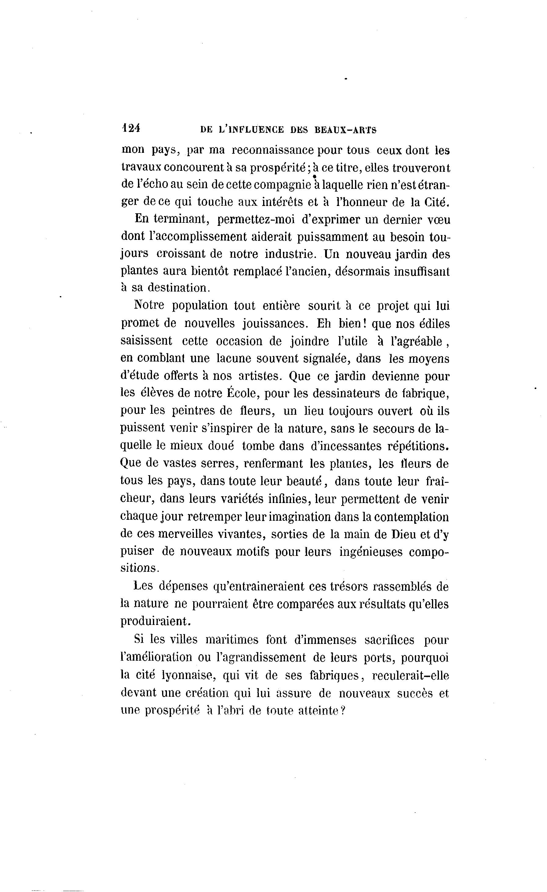 124 DE L'INFLUENCE DES BEAUX-ARTS mon pays, par ma reconnaissance pour tous ceux dont les travaux concourent a sa prospérité ; a ce titre, elles trouveront de l'écho au sein de cette compagnie a laquelle rien n'est étran- ger de ce qui touche aux intérêts et à l'honneur de la Cité. En terminant, permettez-moi d'exprimer un dernier vœu dont l'accomplissement aiderait puissamment au besoin tou- jours croissant de notre industrie. Un nouveau jardin des plantes aura bientôt remplacé l'ancien, désormais insuffisant à sa destination. Notre population tout entière sourit a ce projet qui lui promet de nouvelles jouissances. Eh bien ! que nos édiles saisissent cette occasion de joindre l'utile à l'agréable , en comblant une lacune souvent signalée, dans les moyens d'étude offerts à nos artistes. Que ce jardin devienne pour les élèves de notre École, pour les dessinateurs de fabrique, pour les peintres de fleurs, un lieu toujours ouvert où ils puissent venir s'inspirer de la nature, sans le secours de la- quelle le mieux doué tombe dans d'incessantes répétitions. Que de vastes serres, renfermant les plantes, les fleurs de tous les pays, dans toute leur beauté, dans toute leur fraî- cheur, dans leurs variétés infinies, leur permettent de venir chaque jour retremper leur imagination dans la contemplation de ces merveilles vivantes, sorties de la main de Dieu et d'y puiser de nouveaux motifs pour leurs ingénieuses compo- sitions. Les dépenses qu'entraîneraient ces trésors rassemblés de la nature ne pourraient être comparées aux résultats qu'elles produiraient. Si les villes maritimes font d'immenses sacrifices pour l'amélioration ou l'agrandissement de leurs ports, pourquoi la cité lyonnaise, qui vit de ses fabriques, reculerait-elle devant une création qui lui assure de nouveaux succès et une prospérité a l'abri de toute atteinte ?