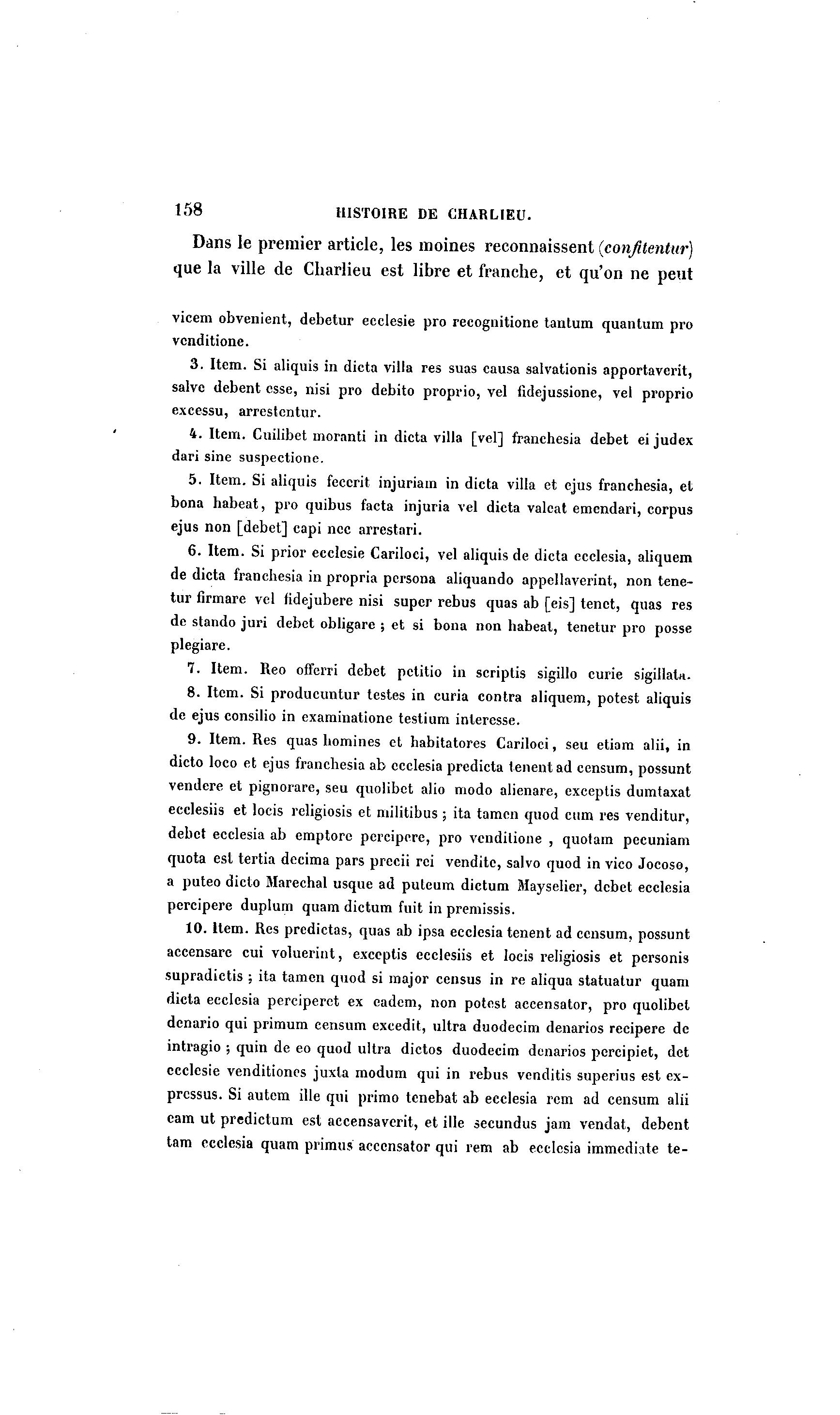 158 HISTOIRE DE CHARLIEU. Dans le premier article, les moines reconnaissent (confltentur) que la ville de Charlieu est libre et franche, et qu'on ne peut vicem obvenient, debetur ecclesie pro recognitione tantum quantum pro vcnditione. 3. Item. Si aliquis in dicta villa res suas causa salvationis apportaverit, salve debent esse, nisi pro debito proprio, vel iidejussione, vel proprio excessu, arrestentur. 4. Item. Cuilibet moranti in dicta villa [vel] franchesia débet ei judex dari sine suspectionc. 5. Item. Si aliquis feccrit injuriam in dicta villa et ejus franchesia, et bona habeat, pro quibus facta injuria vel dicta valcat emendari, corpus ejus non [débet] capi ncc arrestari. 6. Item. Si prior ecclesie Cariloci, vel aliquis de dicta ecclesia, aliquem de dicta franchesia in propria pcrsona aliquando appellaverint, non tene- tur firmare vel fidejubere nisi super rébus quas ab [eis] tenet, quas res de stando juri débet obligare ; et si bona non habeat, tenetur pro posse plegiare. 7. Item. Reo offerri débet pctitio in scriptis sigillo curie sigillala. 8. Item. Si producuntur testes in curia contra aliquem, potest aliquis de ejus consilio in examinatione testium intéresse. 9. Item. Res quas homines et habitatores Cariloci, seu etiam alii, in dicto loco et ejus franchesia ab ecclesia predicta tenentad censum, possunt vendere et pignorare, seu quolibet alio modo alienare, exceptis dumtaxat ecclesiis et locis religiosis et niilitibus ; ita tamcn quod cum res venditur, débet ecclesia ab emptore percipere, pro vcnditione , quotam pecuniam quota est tertia décima pars precii rei venditc, salvo quod in vico Jocoso, a puteo dicto Maréchal usque ad puleum dictum Mayselier, débet ecclesia percipere duplum quam dictum fuit in premissis. 10. Item. Res predictas, quas ab ipsa ecclesia tenent ad censum, possunt accensare cui voluerint, exceptis ecclesiis et locis religiosis et personis supradictis ; ita tamen quod si major census in re aliqua statuatur quam dicta ecclesia perciperet ex eadem, non potest aceensator, pro quolibet denario qui primum censum excedit, ultra duodecim denarios recipere de intragio ; quin de eo quod ultra dictos duodecim denarios percipiet, det ecclesie venditioncs juxla modum qui in rébus venditis superius est ex- pressus. Si autem ille qui primo tenebat ab ecclesia rem ad censum alii cam ut predictum est accensaverit, et ille secundus jam vendat, debent tam ecclesia quam primus aceensator qui rem ab ecclesia immédiate te-