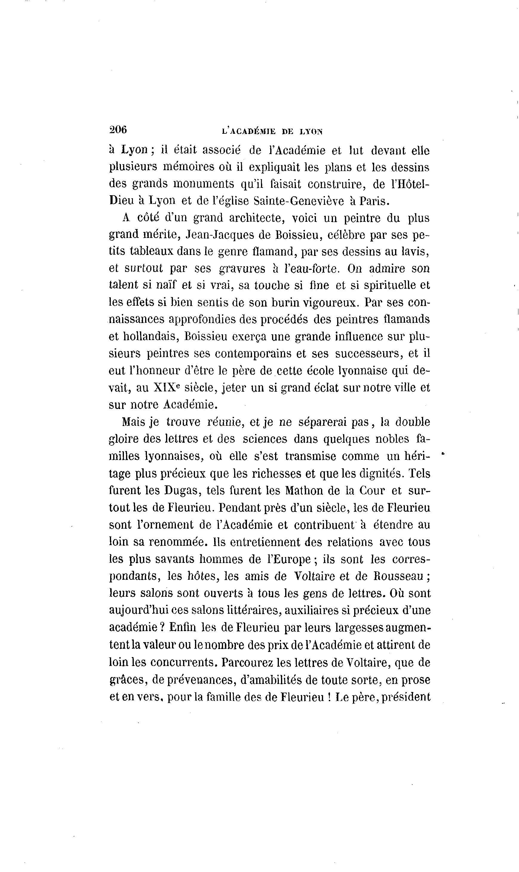 206 L'ACADÉMIE DE LYON à Lyon ; il était associé de l'Académie et lut devant elle plusieurs mémoires où il expliquait les plans et les dessins des grands monuments qu'il faisait construire, de l'Hôtel- Dieu a Lyon et de l'église Sainte-Geneviève a Paris. A côté d'un grand architecte, voici un peintre du plus grand mérite, Jean-Jacques de Boissieu, célèbre par ses pe- tits tableaux dans le genre flamand, par ses dessins au lavis, et surtout par ses gravures à l'eau-forte. On admire son talent si naïf et si vrai, sa touche si fine et si spirituelle et les effets si bien sentis de son burin vigoureux. Par ses con- naissances approfondies des procédés des peintres flamands et hollandais, Boissieu exerça une grande influence sur plu- sieurs peintres ses contemporains et ses successeurs, et il eut l'honneur d'être le père de cette école lyonnaise qui de- vait, au XIXe siècle, jeter un si grand éclat sur notre ville et sur notre Académie. Mais je trouve réunie, et je ne séparerai pas, la double gloire des lettres et des sciences dans quelques nobles fa- milles lyonnaises, où elle s'est transmise comme un héri- * tage plus précieux que les richesses et que les dignités. Tels furent les Dugas, tels furent les Mathon de la Cour et sur- tout les de Fleurieu. Pendant près d'un siècle, les de Fleurieu sont l'ornement de l'Académie et contribuent 'a étendre au loin sa renommée. Ils entretiennent des relations avec tous les plus savants hommes de l'Europe ; ils sont les corres- pondants, les hôtes, les amis de "Voltaire et de Rousseau ; leurs salons sont ouverts a tous les gens de lettres. Où sont aujourd'hui ces salons littéraires, auxiliaires si précieux d'une académie ? Enfin les de Fleurieu par leurs largesses augmen- tent la valeur ou le nombre des prix de l'Académie et attirent de loin les concurrents. Parcourez les lettres de Voltaire, que de grâces, de prévenances, d'amabilités de toute sorte, en prose et en vers, pour la famille des de Fleurieu ! Le père, président