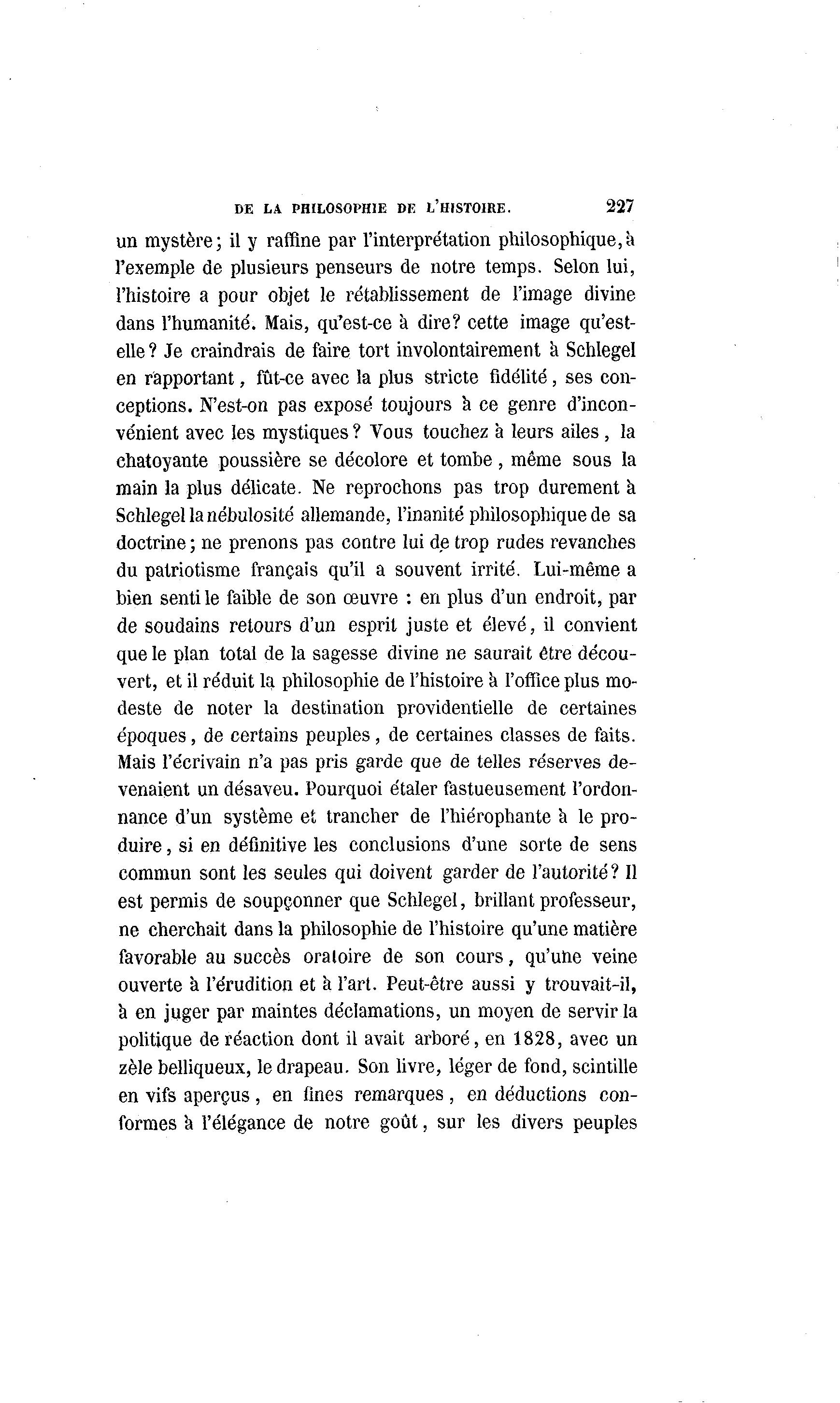 DE LA PHILOSOPHIE DE L'HISTOIRE. 227 un mystère; il y raffine par l'interprétation philosophique,à l'exemple de plusieurs penseurs de notre temps. Selon lui, l'histoire a pour objet le rétablissement de l'image divine dans l'humanité. Mais, qu'est-ce à dire? cette image qu'est- elle ? Je craindrais de faire tort involontairement à Schlegel en rapportant, fût-ce avec la plus stricte fidélité, ses con- ceptions. N'est-on pas exposé toujours a ce genre d'incon- vénient avec les mystiques ? Vous touchez à leurs ailes, la chatoyante poussière se décolore et tombe , même sous la main la plus délicate. Ne reprochons pas trop durement a Schlegel la nébulosité allemande, l'inanité philosophique de sa doctrine ; ne prenons pas contre lui de trop rudes revanches du patriotisme français qu'il a souvent irrité. Lui-même a bien senti le faible de son œuvre : en plus d'un endroit, par de soudains retours d'un esprit juste et élevé, il convient que le plan total de la sagesse divine ne saurait être décou- vert, et il réduit la philosophie de l'histoire a l'office plus mo- deste de noter la destination providentielle de certaines époques, de certains peuples, de certaines classes de faits. Mais l'écrivain n'a pas pris garde que de telles réserves de- venaient un désaveu. Pourquoi étaler fastueusement l'ordon- nance d'un système et trancher de l'hiérophante a le pro- duire , si en définitive les conclusions d'une sorte de sens commun sont les seules qui doivent garder de l'autorité? Il est permis de soupçonner que Schlegel, brillant professeur, ne cherchait dans la philosophie de l'histoire qu'une matière favorable au succès oraloire de son cours, qu'une veine ouverte à l'érudition et a l'art. Peut-être aussi y trouvait-il, à en juger par maintes déclamations, un moyen de servir la politique de réaction dont il avait arboré, en 1828, avec un zèle belliqueux, le drapeau. Son livre, léger de fond, scintille en vifs aperçus , en fines remarques , en déductions con- formes a l'élégance de notre goût, sur les divers peuples