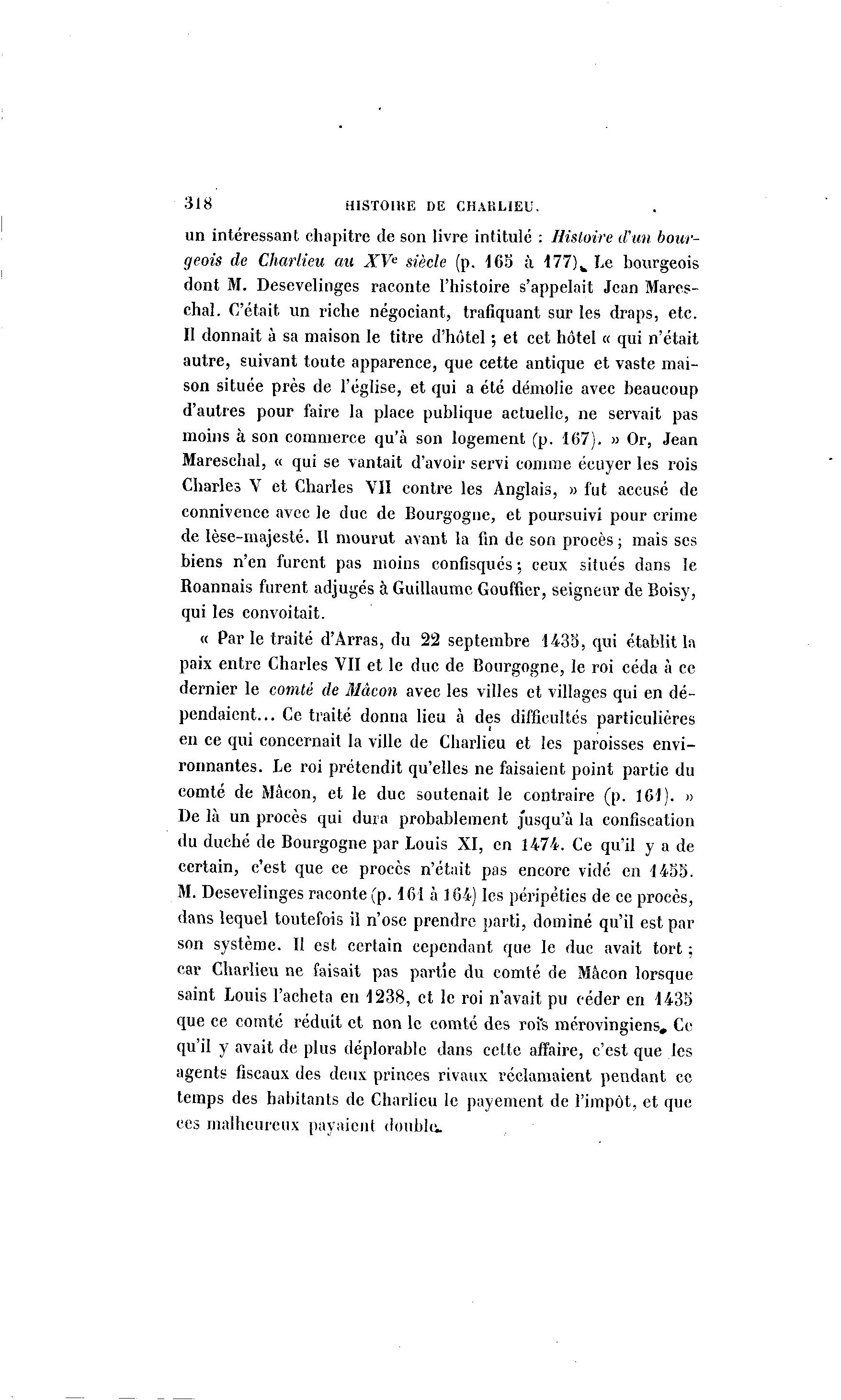 318 HISTOIKE DE CHARLIEU. un intéressant chapitre de son livre intitulé : Histoire d'un bour- geois de Chartieu an XVe siècle (p. 163 à I77) w Le bourgeois dont M. Desevelinges raconte l'histoire s'appelait Jean Mares- chal. C'était un riche négociant, trafiquant sur les draps, etc. II donnait à sa maison le titre d'hôtel ; et cet hôtel « qui n'était autre, suivant toute apparence, que cette antique et vaste mai- son située près de l'église, et qui a été démolie avec beaucoup d'autres pour faire la place publique actuelle, ne servait pas moins à son commerce qu'à son logement (p. 167). » Or, Jean Mareschal, « qui se vantait d'avoir servi comme écuyer les rois Charles V et Charles VII contre les Anglais, » fut accusé de connivence avec le duc de Bourgogne, et poursuivi pour crime de lèse-majesté. Il mourut avant la fin de son procès; mais ses biens n'en furent pas moins confisqués ; ceux situés dans le Roannais furent adjugés à Guillaume Gouffier, seigneur de Boisy, qui les convoitait. « Par le traité d'Arras, du 22 septembre 1438, qui établit la paix entre Charles VII et le duc de Bourgogne, le roi céda à ce dernier le comté de Mà con avec les villes et villages qui en dé- pendaient... Ce traité donna lieu à des difficultés particulières en ce qui concernait la ville de Charlieu et les paroisses envi- ronnantes. Le roi prétendit qu'elles ne faisaient point partie du comté de Mà con, et le duc soutenait le contraire (p. 161). » De là un procès qui dura probablement jusqu'à la confiscation du duché de Bourgogne par Louis XI, en 1474. Ce qu'il y a de certain, c'est que ce procès n'était pas encore vidé en 1455. M. Desevelinges raconte (p. 161 à 164) les péripéties de ce procès, dans lequel toutefois il n'ose prendre parti, dominé qu'il est par son système. Il est certain cependant que le duc avait tort ; car Charlieu ne faisait pas partie du comté de Mâcon lorsque saint Louis l'acheta en 1238, et le roi n'avait pu céder en 1435 que ce comté réduit et non le comté des roi's mérovingiens. Ce qu'il y avait de plus déplorable dans celte affaire, c'est que les agents fiscaux des deux princes rivaux réclamaient pendant ce temps des habitants de Charlieu le payement de l'impôt, et que ces malheureux payaient doublu.