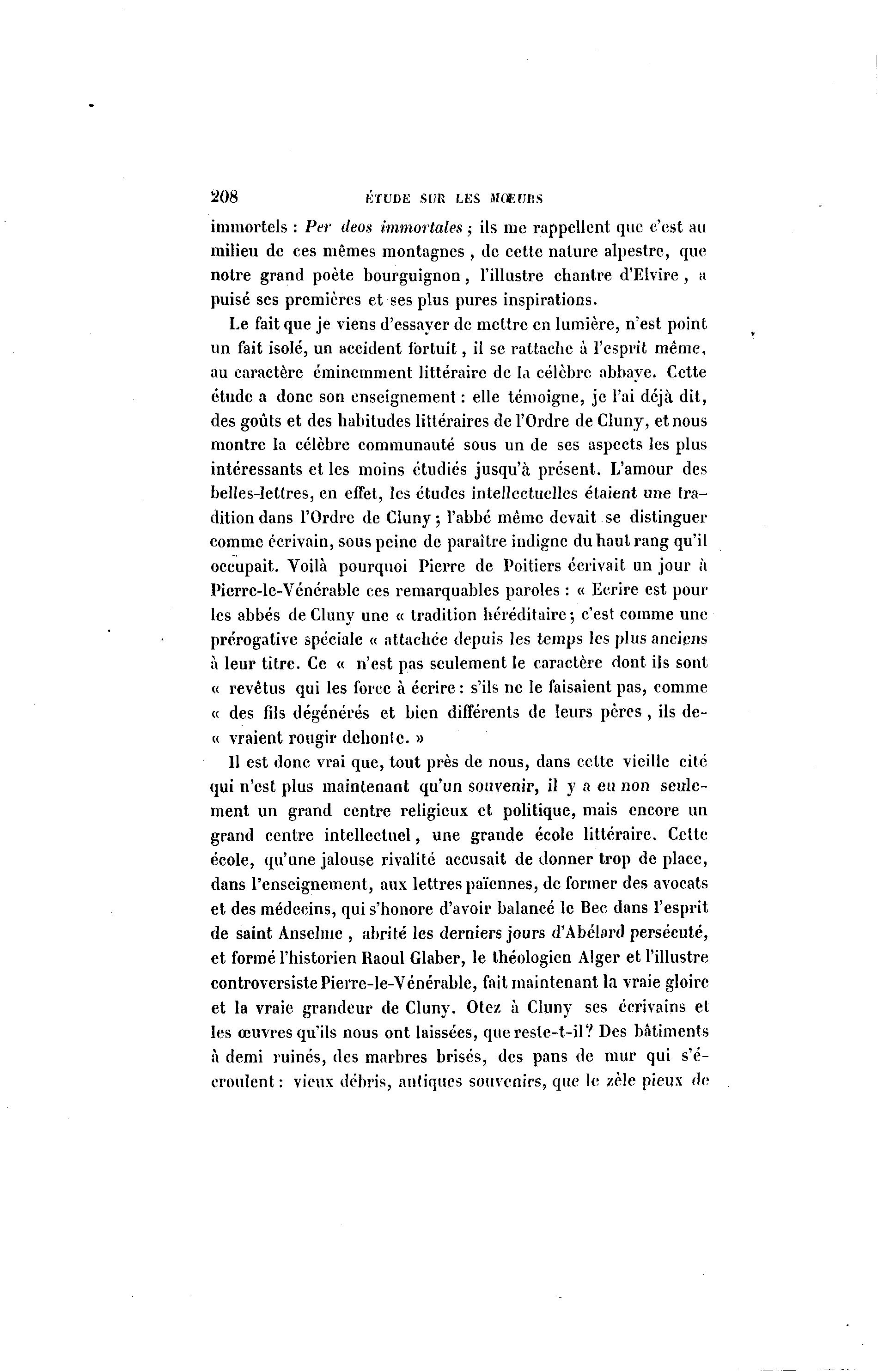 208 ÉTUDE SUR LUS MOEURS immortels : Per deos immortales ; ils me rappellent que c'est au milieu de ces mêmes montagnes , de ectte nature alpestre, que notre grand poète bourguignon, l'illustre chantre d'Elvire , a puisé ses premières et ses plus pures inspirations. Le fait que je viens d'essayer de mettre en lumière, n'est point un fait isolé, un accident fortuit, il se rattache à l'esprit même, au caractère éminemment littéraire de la célèbre abbaye. Cette étude a donc son enseignement : elle témoigne, je l'ai déjà dit, des goûts et des habitudes littéraires de l'Ordre de Cluny, et nous montre la célèbre communauté sous un de ses aspects les plus intéressants et les moins étudiés jusqu'à présent. L'amour des belles-lettres, en effet, les études intellectuelles étaient une tra- dition dans l'Ordre de Cluny; l'abbé même devait se distinguer comme écrivain, sous peine de paraître indigne du haut rang qu'il occupait. Voilà pourquoi Pierre de Poitiers écrivait un jour à Pierre-le-Vénérable ces remarquables paroles : « Ecrire est pour les abbés de Cluny une « tradition héréditaire ; c'est comme une prérogative spéciale « attachée depuis les temps les plus anciens à leur titre. Ce « n'est pas seulement le caractère dont ils sont « revêtus qui les force à écrire : s'ils ne le faisaient pas, comme « des fils dégénérés et bien différents de leurs pères , ils de- « vraient rougir dehonlc. » Il est donc vrai que, tout près de nous, dans celte vieille cité qui n'est plus maintenant qu'un souvenir, il y a eu non seule- ment un grand centre religieux et politique, mais encore un grand centre intellectuel, une grande école littéraire. Celte école, qu'une jalouse rivalité accusait de donner trop de place, dans l'enseignement, aux lettres païennes, de former des avocats et des médecins, qui s'honore d'avoir balancé le Bec dans l'esprit de saint Anselme , abrité les derniers jours d'Abélard persécuté, et formé l'historien Raoul Glaber, le théologien Alger et l'illustre controversistePierre-le-Vénérable, fait maintenant la vraie gloire et la vraie grandeur de Cluny. Otez à Cluny ses écrivains et les œuvres qu'ils nous ont laissées, queresle-t-il? Des bâtiments à demi ruinés, des marbres brisés, des pans de mur qui s'é- croulent : vieux débris, antiques souvenirs, que le zèle pieux de