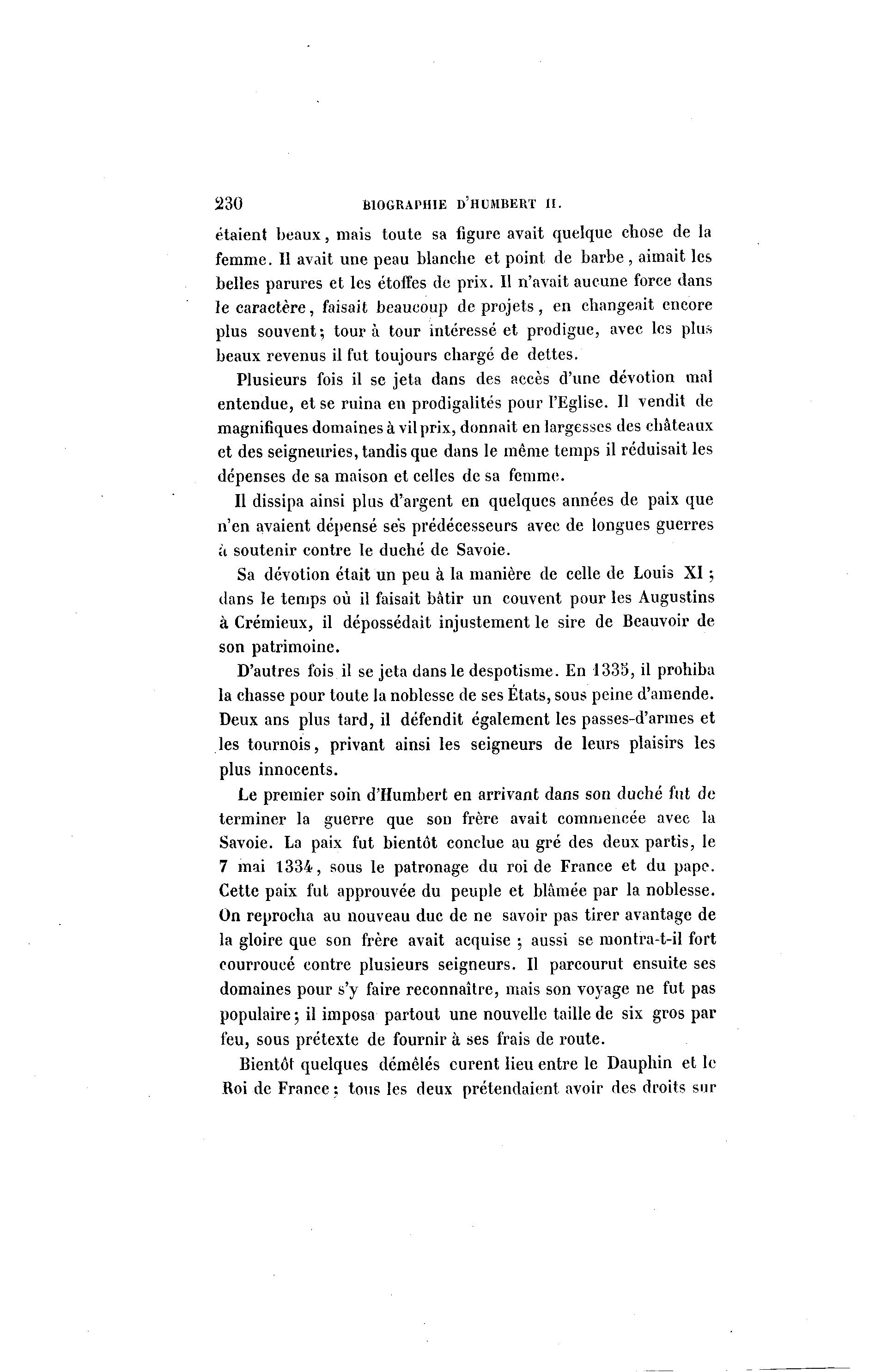 230 BIOGRAPHIE D'HUMBERT II. étaient beaux, mais toute sa figure avait quelque chose de la femme. Il avait une peau blanche et point de barbe , aimait les belles parures et les étoffes de prix. Il n'avait aucune force dans le caractère, faisait beaucoup de projets, en changeait encore plus souvent; tour à tour intéressé et prodigue, avec les plus beaux revenus il fut toujours chargé de dettes. Plusieurs fois il se jeta dans des accès d'une dévotion mal entendue, et se ruina en prodigalités pour l'Eglise. Il vendit de magnifiques domaines à vil prix, donnait en largesses des châteaux et des seigneuries, tandis que dans le même temps il réduisait les dépenses de sa maison et celles de sa femme. Il dissipa ainsi plus d'argent en quelques années de paix que n'en avaient dépensé ses prédécesseurs avec de longues guerres à soutenir contre le duché de Savoie. Sa dévotion était un peu à la manière de celle de Louis XI ; dans le temps où il faisait bâtir un couvent pour les Augustins à Crémieux, il dépossédait injustement le sire de Beauvoir de son patrimoine. D'autres fois il se jeta dans le despotisme. En 1333, il prohiba la chasse pour toute la noblesse de ses États, sous peine d'amende. Deux ans plus tard, il défendit également les passes-d'armes et les tournois, privant ainsi les seigneurs de leurs plaisirs les plus innocents. Le premier soin d'Humbert en arrivant dans son duché fut de terminer la guerre que son frère avait commencée avec la Savoie. La paix fut bientôt conclue au gré des deux partis, le 7 mai 1334, sous le patronage du roi de France et du pape. Cette paix fut approuvée du peuple et blâmée par la noblesse. On reprocha au nouveau duc de ne savoir pas tirer avantage de la gloire que son frère avait acquise ; aussi se montra-t-il fort courroucé contre plusieurs seigneurs. Il parcourut ensuite ses domaines pour s'y faire reconnaître, mais son voyage ne fut pas populaire ; il imposa partout une nouvelle taille de six gros par l'eu, sous prétexte de fournir à ses frais de route. Bientôt quelques démêlés curent lieu entre le Dauphin et le Roi de France: tous les deux prétendaient avoir des droits sur