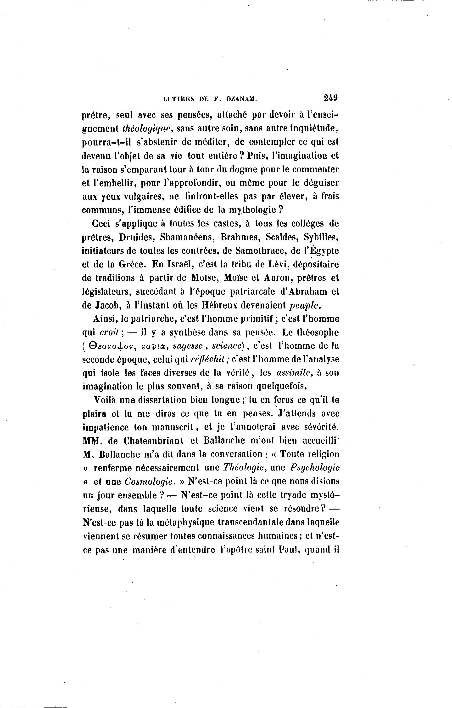 LETTRES DE F. OZANAM. 249 prêtre, seul avec ses pensées, attaché par devoir à l'ensei- gnement Ihéologique, sans autre soin, sans autre inquiétude, pourra-t-il s'abstenir de méditer, de contempler ce qui est devenu l'objet de sa vie tout entière? Puis, l'imagination et la raison s'emparant tour à tour du dogme pour le commenter et l'embellir, pour l'approfondir, ou même pour le déguiser aux yeux vulgaires, ne finiront-elles pas par élever, à frais communs, l'immense édifice de la mythologie ? Ceci s'applique à toutes les castes, à tous les collèges de prêtres, Druides, Shamanéens, Brahmes, Scaldes, Sybilles, initiateurs de toutes les contrées, de Samolhrace, de l'Egypte et de la Grèce. En Israël, c'est la tribu de Lèvi, dépositaire de traditions à partir de Moïse, Moïse et Aaron, prêtres et législateurs, succédant à l'époque patriarcale d'Abraham et de Jacob, à l'instant où les Hébreux devenaient peuple. Ainsi, le patriarche, c'est l'homme primitif; c'est l'homme qui croit ; — il y a synthèse dans sa pensée. Le théosophe ( &soso^.os, sotytx, sagesse, science), c'est l'homme de la seconde époque, celui qui réfléchit ; c'est l'homme de l'analyse qui isole les faces diverses de la vérité, les assimile, à son imagination le plus souvent, à sa raison quelquefois. Voilà une dissertation bien longue ; tu en feras ce qu'il te plaira et tu me diras ce que tu en penses. J'attends avec impatience ton manuscrit, et je l'annoterai avec sévérité. MM. de Chateaubriant et Ballanche m'ont bien accueilli. M. Ballanche m'a dit dans la conversation : « Toute religion « renferme nécessairement une Théologie, une Psychologie « et une Cosmologie. » N'est-ce point là ce que nous disions un jour ensemble ? — N'est-ce point là celte tryade mysté- rieuse, dans laquelle toute science vient se résoudre? — N'est-ce pas là la métaphysique transcendanlaledans laquelle viennent se résumer toutes connaissances humaines; et n'est- ce pas une manière d'entendre l'apotre saint Paul, quand il