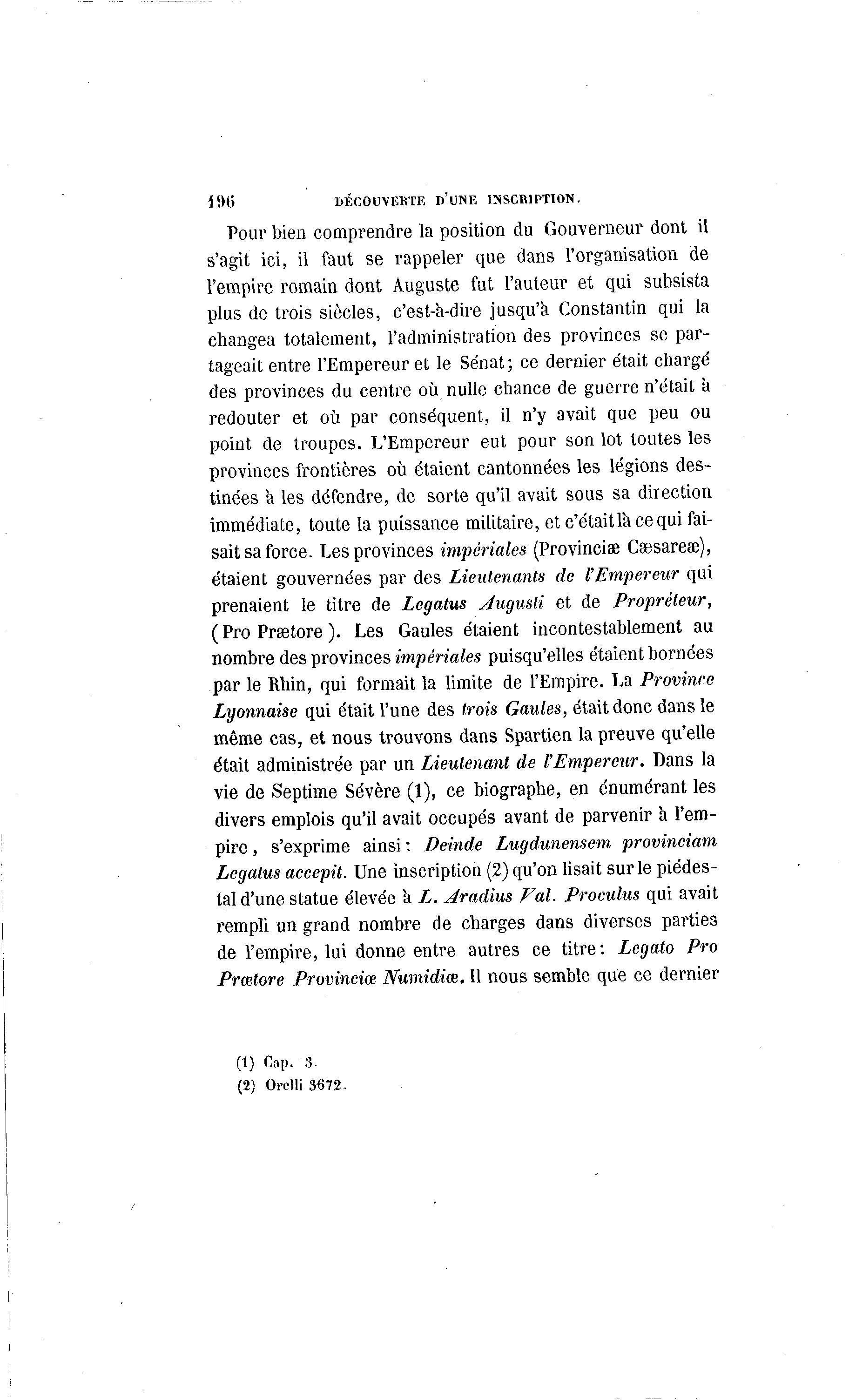 1% DÉCOUVERTE D'UNE INSCRIPTION. Pour bien comprendre la position du Gouverneur dont il s'agit ici, il faut se rappeler que dans l'organisation de l'empire romain dont Auguste fut l'auteur et qui subsista plus de trois siècles, c'est-h-dire jusqu'à Constantin qui la changea totalement, l'administration des provinces se par- tageait entre l'Empereur et le Sénat; ce dernier était chargé des provinces du centre où nulle chance de guerre n'était a redouter et où par conséquent, il n'y avait que peu ou point de troupes. L'Empereur eut pour son lot toutes les provinces frontières où étaient cantonnées les légions des- tinées à les défendre, de sorte qu'il avait sous sa direction immédiate, toute la puissance militaire, et c'étaitla ce qui fai- sait sa force. Les provinces impériales (Provinciae Csesareœ), étaient gouvernées par des Lieutenants de l'Empereur qui prenaient le titre de Legatus Augusti et de Propréteur, ( Pro Prsetore ). Les Gaules étaient incontestablement au nombre des provinces impériales puisqu'elles étaient bornées par le Rhin, qui formait la limite de l'Empire. La Province Lyonnaise qui était l'une des trois Gaules, était donc dans le même cas, et nous trouvons dans Spartien la preuve qu'elle était administrée par un Lieutenant de l'Empereur. Dans la vie de Septime Sévère (1), ce biographe, en énumérant les divers emplois qu'il avait occupés avant de parvenir à l'em- pire , s'exprime ainsi : Deinde Lugdunensem provinciam Legatus accepit. Une inscription (2) qu'on lisait sur le piédes- tal d'une statue élevée a L. Aradius Val. Proculus qui avait rempli un grand nombre de charges dans diverses parties de l'empire, lui donne entre autres ce titre: Legato Pro Prœtore Provinciœ Numidiœ. 11 nous semble que ce dernier (1) Cap. 3. (2) Orelli 3672.