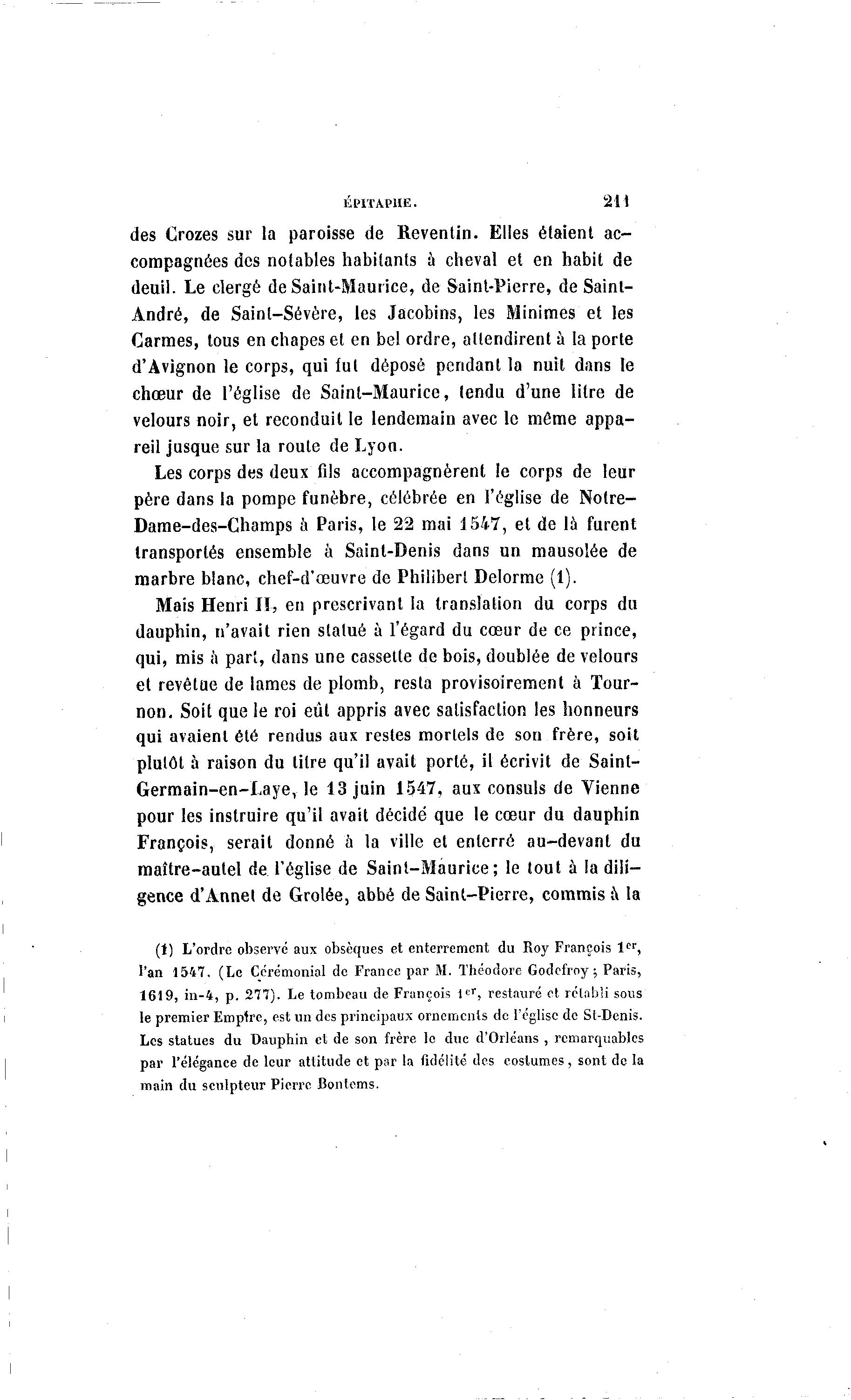 ÉPITAPHE. 2H des Crozes sur la paroisse de Reventin. Elles étaient ac- compagnées des notables habitants à cheval et en habit de deuil. Le clergé de Saint-Maurice, de Saint-Pierre, de Saint- André, de Saint-Sévère, les Jacobins, les Minimes et les Carmes, tous en chapes et en bel ordre, attendirent à la porte d'Avignon le corps, qui fut déposé pendant la nuit dans le chœur de l'église de Saint-Maurice, tendu d'une litre de velours noir, et reconduit le lendemain avec le môme appa- reil jusque sur la route de Lyon. Les corps des deux fils accompagnèrent le corps de leur père dans la pompe funèbre, célébrée en l'église de Notre- Dame-des-Champs à Paris, le 22 mai 1547, et de là furent transportés ensemble à Saint-Denis dans un mausolée de marbre blanc, chef-d'œuvre de Philibert Delorme (1). Mais Henri II-, en prescrivant la translation du corps du dauphin, n'avait rien statué à l'égard du cœur de ce prince, qui, mis à part, dans une cassette de bois, doublée de velours et revêtue de lames de plomb, resta provisoirement à Tour- non. Soit que le roi eût appris avec satisfaction les honneurs qui avaient été rendus aux restes mortels de son frère, soit plutôt à raison du titre qu'il avait porté, il écrivit de Saint- Germain-en-Laye, le 13 juin 1547, aux consuls de Vienne pour les instruire qu'il avait décidé que le cœur du dauphin François, serait donné à la ville et enterré au-devant du maître-autel de l'église de Saint-Maurice; le tout à la dili- gence d'Annet de Grolée, abbé de Saint-Pierre, commis à la (1) L'ordre observé aux obsèques et enterrement du Roy François 1 e r , l'an 1547. (Le Cérémonial de France par M. Théodore Godefroy ; Paris, 1619, in-4, p. 277). Le tombeau de François 1 e r , restauré et rétabli sous le premier Empire, est un des principaux ornements de l'église de St-Denis. Les statues du Dauphin et de son frère le duc d'Orléans , remarquables par l'élégance de leur atlitude et par la fidélité des costumes, sont de la main du sculpteur Pierre Bontems.