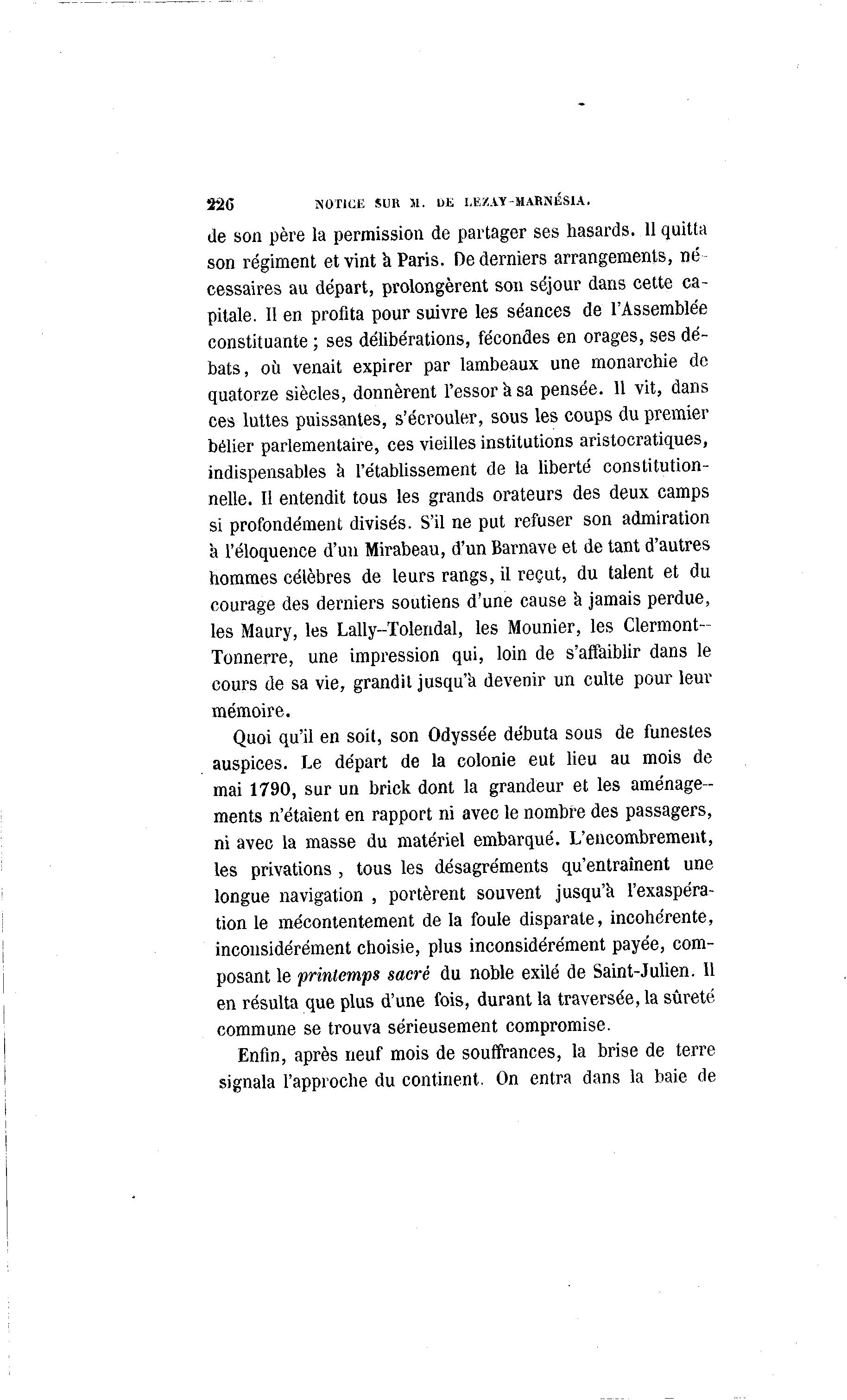 226 NOTICE SUR M. DE I.EZ.VY-MARNËSIA. de son père la permission de partager ses hasards. 11 quitta son régiment et vint à Paris. De derniers arrangements, né cessaires au départ, prolongèrent son séjour dans cette ca- pitale. 11 en profita pour suivre les séances de l'Assemblée constituante ; ses délibérations, fécondes en orages, ses dé- bats, où venait expirer par lambeaux une monarchie de quatorze siècles, donnèrent l'essor a sa pensée. 11 vit, dans ces luttes puissantes, s'écrouler, sous les coups du premier bélier parlementaire, ces vieilles institutions aristocratiques, indispensables à l'établissement de la liberté constitution- nelle. Il entendit tous les grands orateurs des deux camps si profondément divisés. S'il ne put refuser son admiration à l'éloquence d'un Mirabeau, d'un Barnave et de tant d'autres hommes célèbres de leurs rangs, il reçut, du talent et du courage des derniers soutiens d'une cause a jamais perdue, les Maury, les Lally-Tolendal, les Mounier, les Clermont- Tonnerre, une impression qui, loin de s'affaiblir dans le cours de sa vie, grandit jusqu'à devenir un culte pour leur mémoire. Quoi qu'il en soit, son Odyssée débuta sous de funestes auspices. Le départ de la colonie eut lieu au mois de mai 1790, sur un brick dont la grandeur et les aménage- ments n'étaient en rapport ni avec le nombre des passagers, ni avec la masse du matériel embarqué. L'encombrement, les privations , tous les désagréments qu'entraînent une longue navigation , portèrent souvent jusqu'à l'exaspéra- tion le mécontentement de la foule disparate, incohérente, inconsidérément choisie, plus inconsidérément payée, com- posant le printemps sacré du noble exilé de Saint-Julien. 11 en résulta que plus d'une fois, durant la traversée, la sûreté commune se trouva sérieusement compromise. Enfin, après neuf mois de souffrances, la brise de terre signala l'approche du continent. On entra dans la baie de