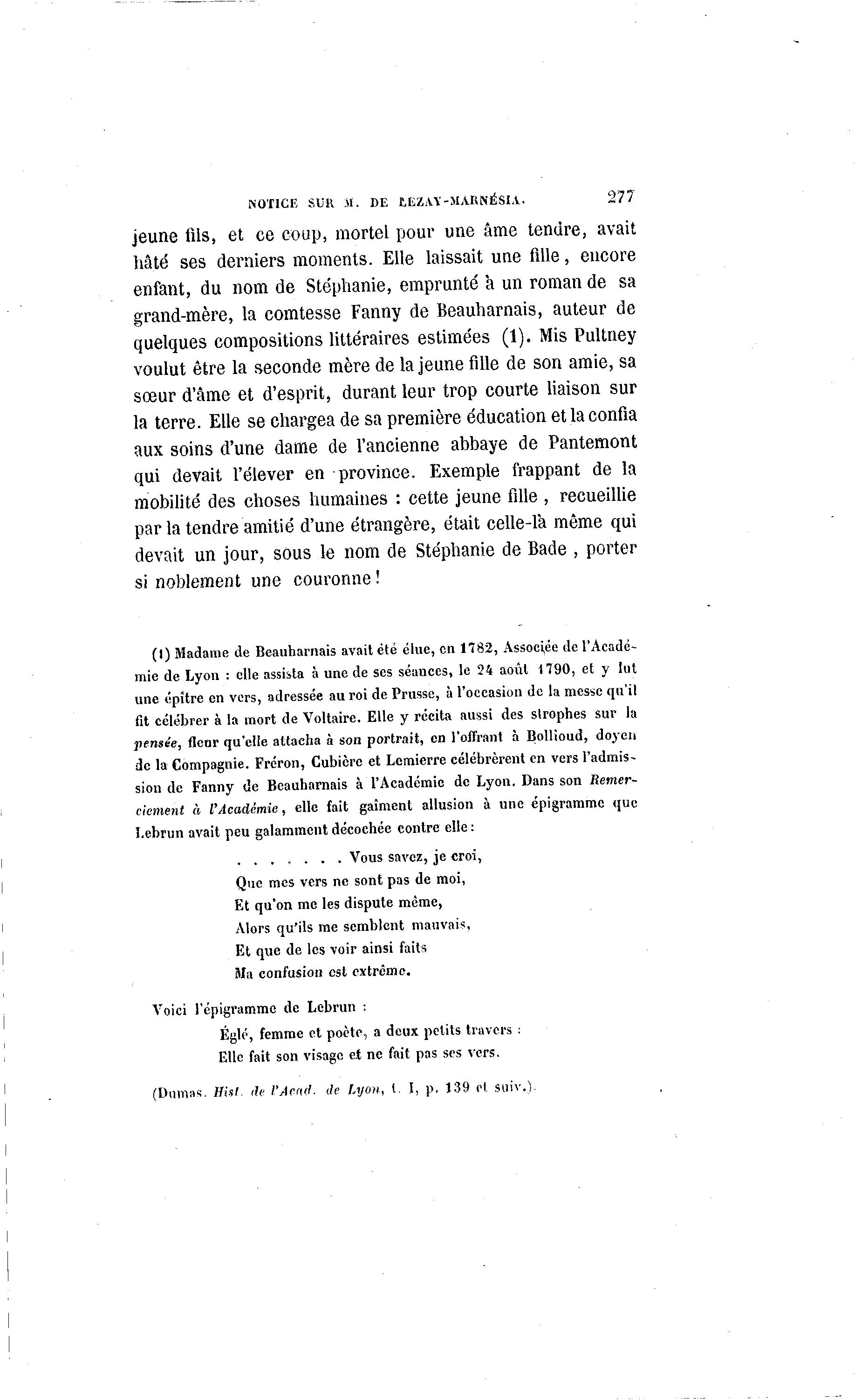 sion de Fanny de Beauharnais à l'Académie de Lyon. Dans son Remer-