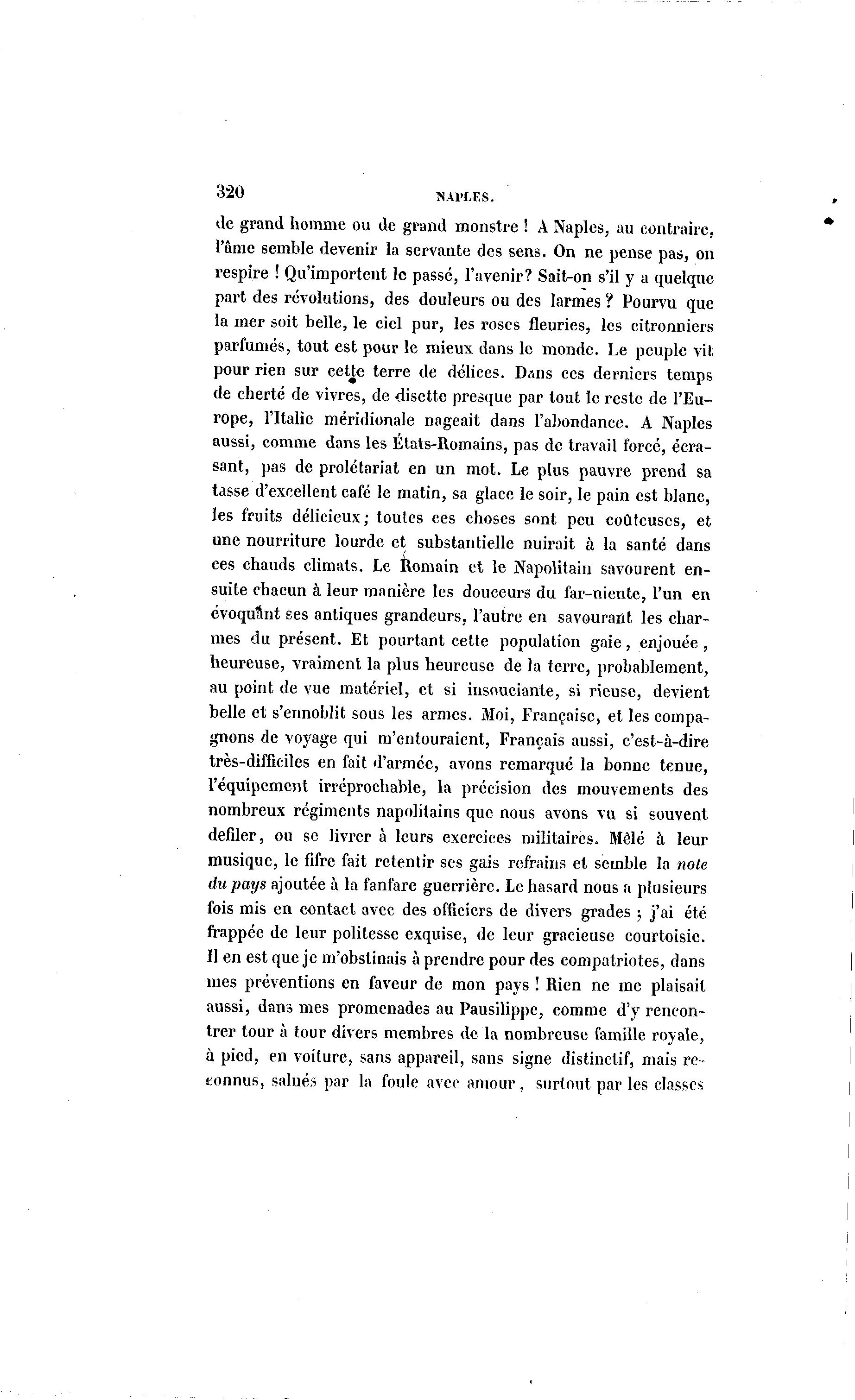 320 NAPLES. de grand homme ou de grand monstre ! A Naples, au contraire, l'âme semble devenir la servante des sens. On ne pense pas, on respire ! Qu'importent le passé, l'avenir? Sait-on s'il y a quelque part des révolutions, des douleurs ou des larmes ? Pourvu que la mer soit belle, le ciel pur, les roses fleuries, les citronniers parfumés, tout est pour le mieux dans le monde. Le peuple vit pour rien sur cette terre de délices. Dans ces derniers temps de cherté de vivres, de disette presque par tout le reste de l'Eu- rope, l'Italie méridionale nageait dans l'abondance. A Naples aussi, comme dans les États-Romains, pas de travail forcé, écra- sant, pas de prolétariat en un mot. Le plus pauvre prend sa tasse d'excellent café le matin, sa glace le soir, le pain est blanc, les fruits délicieux; toutes ces choses sont peu coûteuses, et une nourriture lourde et substantielle nuirait à la santé dans ces chauds climats. Le Romain et le Napolitain savourent en- suite chacun à leur manière les douceurs du far-niente, l'un en évoquant ses antiques grandeurs, l'autre en savourant les char- mes du présent. Et pourtant cette population gaie, enjouée , heureuse, vraiment la plus heureuse de la terre, probablement, au point de vue matériel, et si insouciante, si rieuse, devient belle et s'ennoblit sous les armes. Moi, Française, et les compa- gnons de voyage qui m'entouraient, Français aussi, c'est-à -dire très-difficiles en fait d'armée, avons remarqué la bonne tenue, l'équipement irréprochable, la précision des mouvements des nombreux régiments napolitains que nous avons vu si souvent défiler, ou se livrer à leurs exercices militaires. Mêlé à leur musique, le fifre fait retentir ses gais refrains et semble la note du pays ajoutée à la fanfare guerrière. Le hasard nous a plusieurs fois mis en contact avec des officiers de divers grades ; j'ai été frappée de leur politesse exquise, de leur gracieuse courtoisie. II en est que je m'obstinais à prendre pour des compatriotes, dans mes préventions en faveur de mon pays ! Rien ne me plaisait aussi, dans mes promenades au Pausilippe, comme d'y rencon- trer tour à tour divers membres de la nombreuse famille royale, à pied, en voiture, sans appareil, sans signe distinclif, mais re- connus, salués par la foule avec amour, surtout par les classes