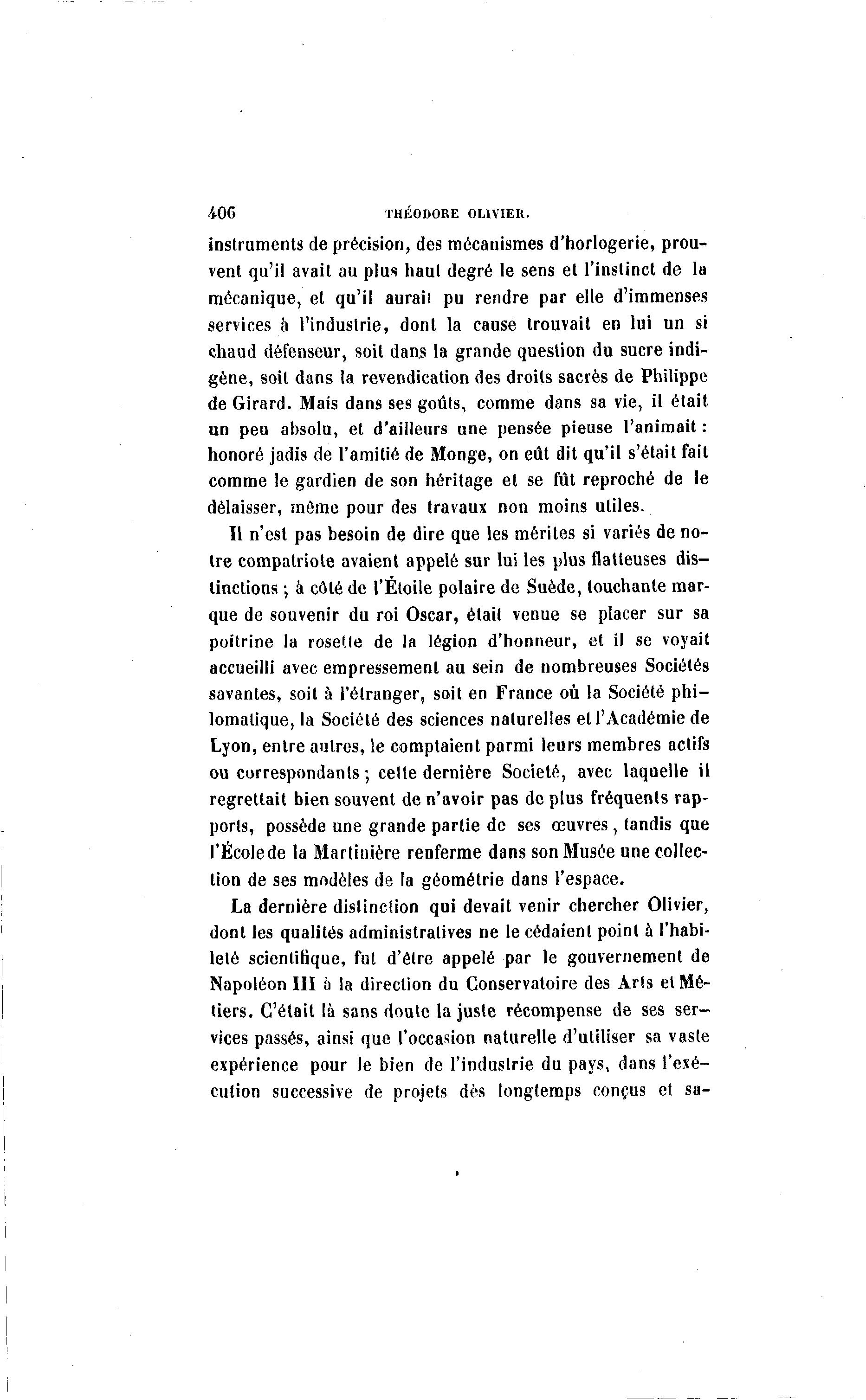 40C THEODORE OLIVIER. instruments de précision, des mécanismes d'horlogerie, prou- vent qu'il avait au plus haut degré le sens et l'instinct de la mécanique, et qu'il aurai! pu rendre par elle d'immenses services à l'industrie, dont la cause trouvait en lui un si chaud défenseur, soit dans la grande question du sucre indi- gène, soit dans la revendication des droits sacrés de Philippe de Girard. Mais dans ses goûts, comme dans sa vie, il était un peu absolu, et d'ailleurs une pensée pieuse l'animait : honoré jadis de l'amitié de Monge, on eût dit qu'il s'était fait comme le gardien de son héritage et se fût reproché de le délaisser, môme pour des travaux non moins utiles. 11 n'est pas besoin de dire que les mérites si variés de no- tre compatriote avaient appelé sur lui les plus flatteuses dis- tinctions ; à côté de l'Étoile polaire de Suède, louchante mar- que de souvenir du roi Oscar, était venue se placer sur sa poitrine la rosette de la légion d'honneur, et il se voyait accueilli avec empressement au sein de nombreuses Sociétés savantes, soit à l'étranger, soit en France où la Société phi— lomalique, la Société des sciences naturelles et l'Académie de Lyon, entre autres, le comptaient parmi leurs membres actifs ou correspondants-, cette dernière Société, avec laquelle il regrettait bien souvent de n'avoir pas de plus fréquents rap- ports, possède une grande partie de ses œuvres , tandis que l'Ëcolede la Martinière renferme dans son Musée une collec- tion de ses modèles de la géométrie dans l'espace. La dernière distinction qui devait venir chercher Olivier, dont les qualités administratives ne le cédaient point à l'habi- leté scientifique, fut d'être appelé par le gouvernement de Napoléon III à la direction du Conservatoire des Arts et Mé- tiers. C'était là sans doute la juste récompense de ses ser- vices passés, ainsi que l'occasion naturelle d'utiliser sa vaste expérience pour le bien de l'industrie du pays, dans l'exé- cution successive de projets dès longtemps conçus et sa-