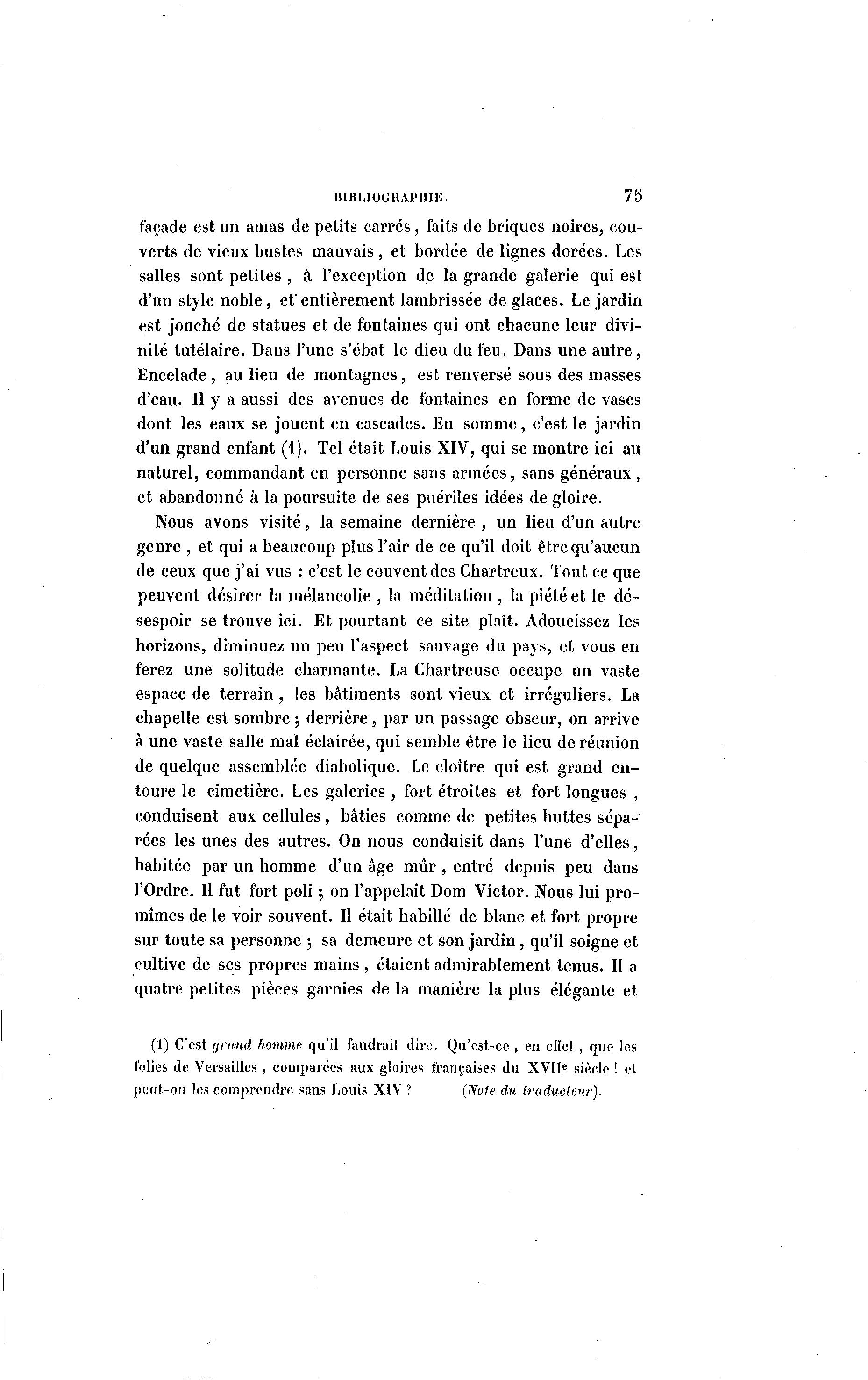 BIBLIOGRAPHIE. 75 façade est un amas de petits carrés, faits de briques noires, cou- verts de vieux bustes mauvais , et bordée de lignes dorées. Les salles sont petites , à l'exception de la grande galerie qui est d'un style noble, ef entièrement lambrissée de glaces. Le jardin est jonché de statues et de fontaines qui ont chacune leur divi- nité tutélaire. Daus l'une s'ébat le dieu du feu. Dans une autre, Encelade , au lieu de montagnes, est renversé sous des masses d'eau. Il y a aussi des avenues de fontaines en forme de vases dont les eaux se jouent en cascades. En somme, c'est le jardin d'un grand enfant (1). Tel était Louis XIV, qui se montre ici au naturel, commandant en personne sans armées, sans généraux, et abandonné à la poursuite de ses puériles idées de gloire. Nous avons visité, la semaine dernière , un lieu d'un autre genre , et qui a beaucoup plus l'air de ce qu'il doit être qu'aucun de ceux que j'ai vus : c'est le couvent des Chartreux. Tout ce que peuvent désirer la mélancolie , la méditation , la piété et le dé- sespoir se trouve ici. Et pourtant ce site plaît. Adoucissez les horizons, diminuez un peu l'aspect sauvage du pays, et vous en ferez une solitude charmante. La Chartreuse occupe un vaste espace de terrain , les bâtiments sont vieux et irréguliers. La chapelle est sombre ; derrière, par un passage obscur, on arrive à une vaste salle mal éclairée, qui semble être le lieu de réunion de quelque assemblée diabolique. Le cloître qui est grand en- toure le cimetière. Les galeries , fort étroites et fort longues , conduisent aux cellules , bâties comme de petites huttes sépa- rées les unes des autres. On nous conduisit dans l'une d'elles, habitée par un homme d'un âge mûr , entré depuis peu dans l'Ordre. Il fut fort poli ; on l'appelait Dom Victor. Nous lui pro- mîmes de le voir souvent. Il était habillé de blanc et fort propre sur toute sa personne ; sa demeure et son jardin, qu'il soigne et cultive de ses propres mains, étaient admirablement tenus. II a quatre petites pièces garnies de la manière la plus élégante et (1) C'est grand homme qu'il faudrait dire. Qu'est-ce , en effet , que les folies de Versailles , comparées aux gloires françaises du XVIIe siècle ! et peut-on les comprendre sans Louis XIV ? (Noie du traducteur).