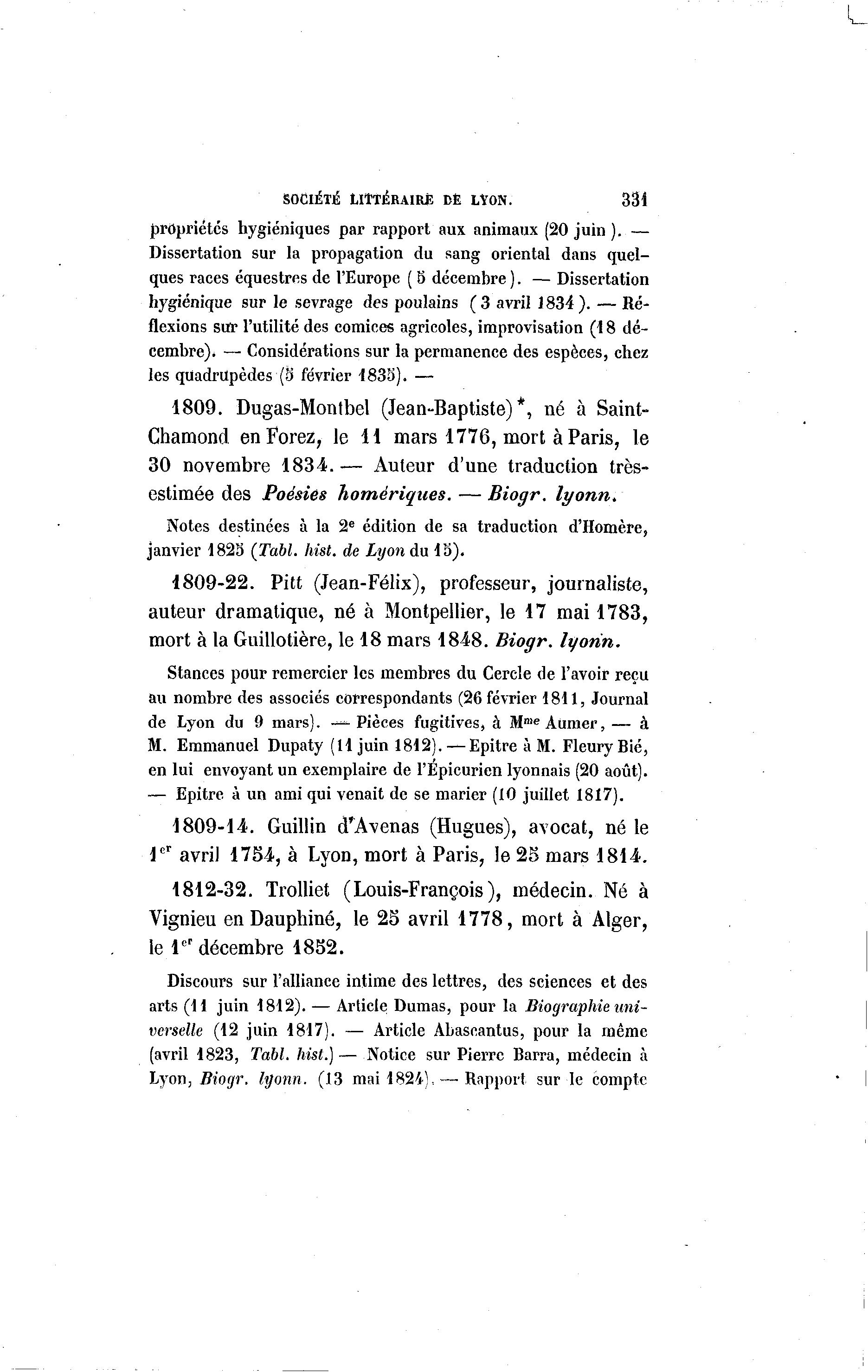 SOCIÉTÉ LITTÉRAIRE DE LYON. 331 propriétés hygiéniques par rapport aux animaux (20 juin ). — Dissertation sur la propagation du sang oriental dans quel- ques races équestres de l'Europe ( 8 décembre ). — Dissertation hygiénique sur le sevrage des poulains ( 3 avril 1834 ). — Ré- flexions sur l'utilité des comices agricoles, improvisation (18 dé- cembre). — Considérations sur la permanence des espèces, chez les quadrupèdes (3 février 1835). — 1809. Dugas-Montbel (Jean-Baptiste)*, né à Saint- Chamond en Forez, le 11 mars 1776, mort à Paris, le 30 novembre 1834.— Auteur d'une traduction très- estimée des Poésies homériques. — Biogr. lyonn. Notes destinées à la 2 e édition de sa traduction d'Homère, janvier 1823 (Tabl. hist. de Lyon du 1S). 1809-22. Pitt (Jean-Félix), professeur, journaliste, auteur dramatique, né à Montpellier, le 17 mai 1783, mort à la Guillotière, le 18 mars 1848. Biogr. lyorin. Stances pour remercier les membres du Cercle de l'avoir reçu au nombre des associés correspondants (26 février 1811, Journal de Lyon du 9 mars). — Pièces fugitives, à Mme Aumer, — à M. Emmanuel Dupaty (11 juin 1812). — Epitre à M. FleuryBié, en lui envoyant un exemplaire de l'Epicurien lyonnais (20 août). — Epitre à un ami qui venait de se marier (10 juillet 1817). 1809-14. Guillin d*Avenas (Hugues), avocat, né le er 1 avril 1754, à Lyon, mort à Paris, le 25 mars 1814. 1812-32. Trolliet (Louis-François), médecin. Né à Vignieu en Dauphiné, le 25 avril 1778, mort à Alger, le 1er décembre 1852. Discours sur l'alliance intime des lettres, des sciences et des arts (11 juin 1812). — Article Dumas, pour la Biographie uni- verselle (12 juin 1817). — Article Abascantus, pour la même (avril 1823, Tabl. hist.) — Notice sur Pierre Barra, médecin à Lyon, Biogr. tyonn. (13 mai 1824),—-Rapport sur le compte