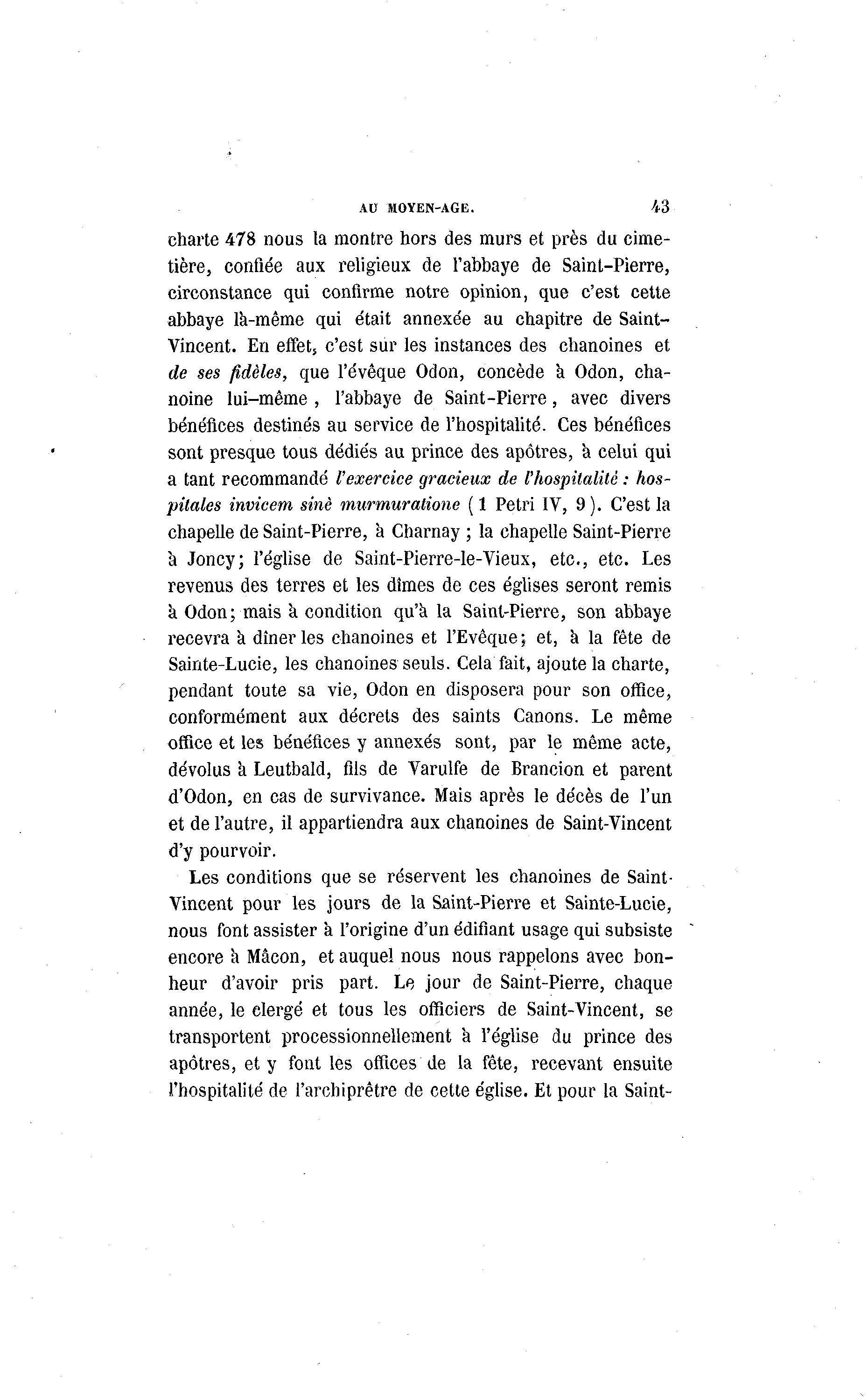 AU MOYEN-AGE. 43 charte 478 nous la montre hors des murs et près du cime- tière, confiée aux religieux de l'abbaye de Saint-Pierre, circonstance qui confirme notre opinion, que c'est cette abbaye la-même qui était annexée au chapitre de Saint- Vincent. En effet, c'est sur les instances des chanoines et de ses fidèles, que l'évêque Odon, concède a Odon, cha- noine lui-même , l'abbaye de Saint-Pierre, avec divers bénéfices destinés au service de l'hospitalité. Ces bénéfices sont presque tous dédiés au prince des apôtres, a celui qui a tant recommandé l'exercice gracieux de l'hospitalité : hos- pitales invicem sine murmuratione ( 1 Pétri IV, 9 ). C'est la chapelle de Saint-Pierre, à Charnay ; la chapelle Saint-Pierre a Joncy; l'église de Saint-Pierre-le-Vieux, etc., etc. Les revenus des terres et les dîmes de ces églises seront remis à Odon; mais a condition qu'à la Saint-Pierre, son abbaye recevra a dîner les chanoines et l'Evêque; et, a la fête de Sainte-Lucie, les chanoines seuls. Cela fait, ajoute la charte, pendant toute sa vie, Odon en disposera pour son office, conformément aux décrets des saints Canons. Le même office et les bénéfices y annexés sont, par le même acte, dévolus a Leutbald, fils de Varulfe de Brancion et parent d'Odon, en cas de survivance. Mais après le décès de l'un et de l'autre, il appartiendra aux chanoines de Saint-Vincent d'y pourvoir. Les conditions que se réservent les chanoines de Saint- Vincent pour les jours de la Saint-Pierre et Sainte-Lucie, nous font assister à l'origine d'un édifiant usage qui subsiste encore a Mâcon, et auquel nous nous rappelons avec bon- heur d'avoir pris part. Le jour de Saint-Pierre, chaque année, le clergé et tous les officiers de Saint-Vincent, se transportent processionnellement a l'église du prince des apôtres, et y font les offices de la fête, recevant ensuite l'hospitalité de l'archiprêtre de cette église. Et pour la Saint-