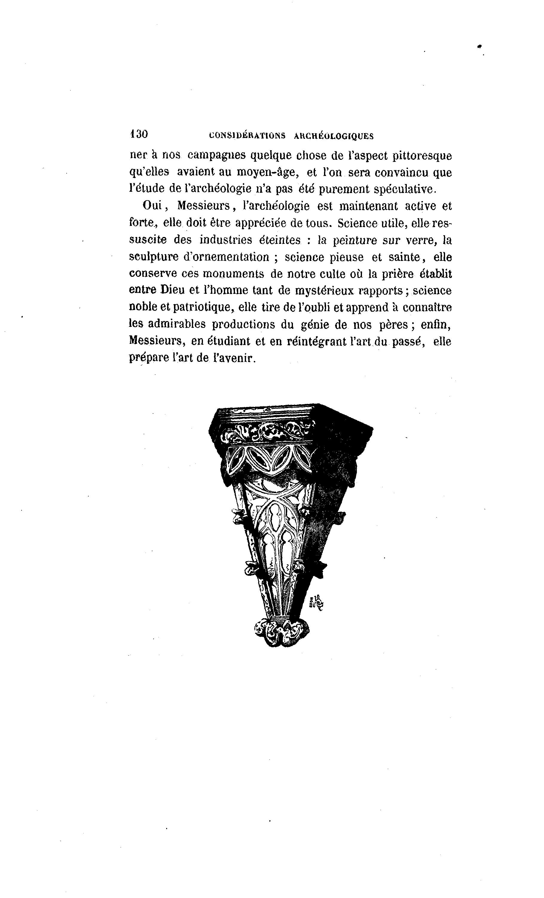 430 CONSIDÉRATIONS ARCHÉOLOGIQUES ner à nos campagnes quelque chose de l'aspect pittoresque qu'elles avaient au moyen-âge, et l'on sera convaincu que l'étude de l'archéologie n'a pas été purement spéculative. Oui, Messieurs, l'archéologie est maintenant active et forte., elle doit être appréciée de tous. Science utile, elle res- suscite des industries éteintes : la peinture sur verre, la sculpture d'ornementation ; science pieuse et sainte, elle conserve ces monuments de notre culte où la prière établit entre Dieu et l'homme tant de mystérieux rapports ; science noble et patriotique, elle tire de l'oubli et apprend a connaître les admirables productions du génie de nos pères ; enfin, Messieurs, en étudiant et en réintégrant l'art du passé, elle prépare l'art de l'avenir.