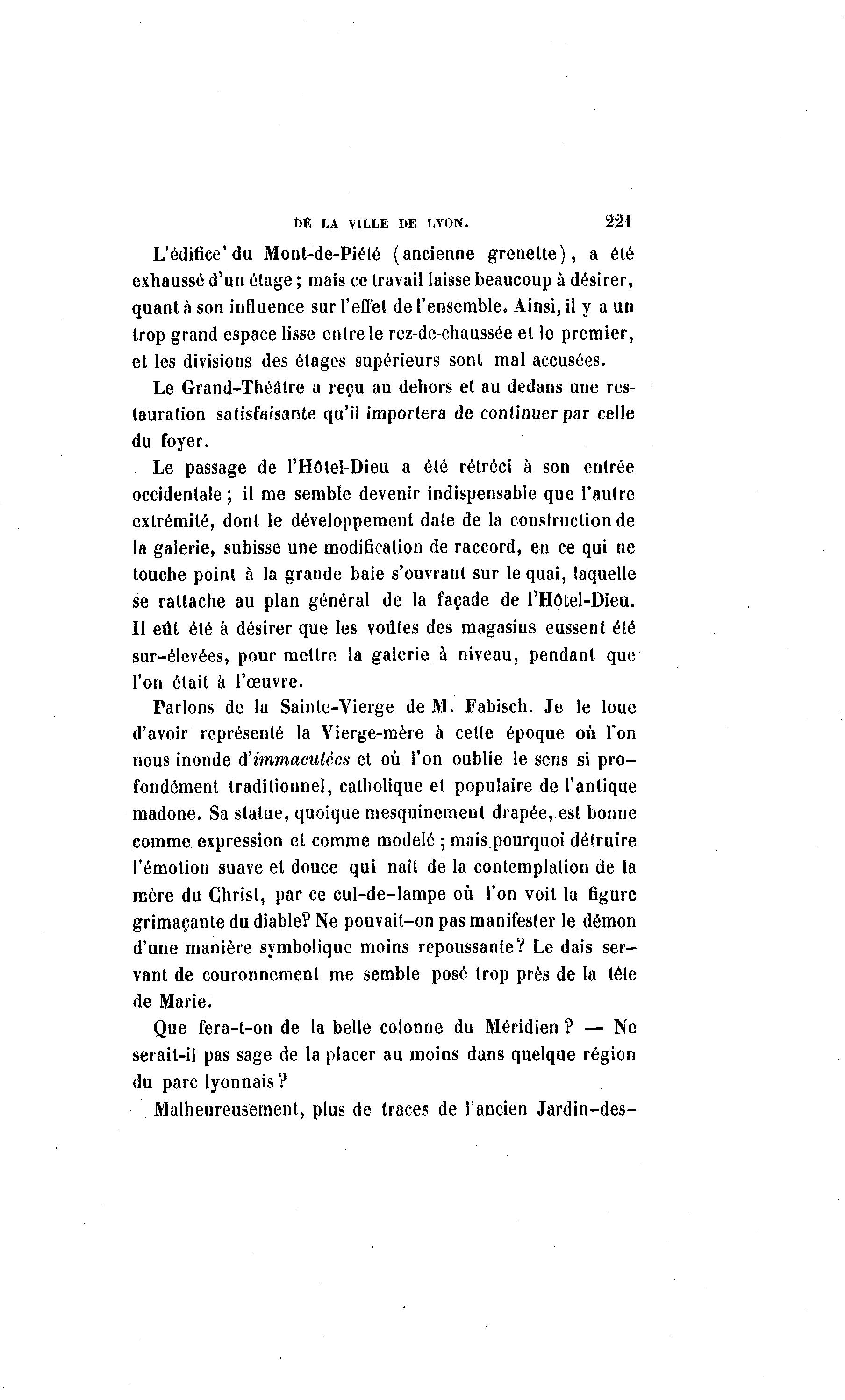 fcÊ LA VILLE DE LYON. 221 L'édifice'du Mont-de-Piété (ancienne grenette), a été exhaussé d'un étage ; mais ce travail laisse beaucoup à désirer, quant à son influence sur l'effet de l'ensemble. Ainsi, il y a un trop grand espace lisse entre le rez-de-chaussée et le premier, et les divisions des étages supérieurs sont mal accusées. Le Grand-Théâtre a reçu au dehors et au dedans une res- tauration satisfaisante qu'il importera de continuer par celle du foyer. Le passage de l'Hôtel-Dieu a été rétréci à son entrée occidentale; il me semble devenir indispensable que l'autre extrémité, dont le développement date de la construction de la galerie, subisse une modification de raccord, en ce qui ne touche point à la grande baie s'ouvrant sur le quai, laquelle se rattache au plan général de la façade de l'Hôtel-Dieu. Il eût été à désirer que les voûtes des magasins eussent été sur-élevées, pour mettre la galerie à niveau, pendant que l'on était à l'œuvre. Parlons de la Sainte-Vierge de M. Fabisch. Je le loue d'avoir représenté la Vierge-mère à cette époque où l'on nous inonde d'immaculées et où l'on oublie le sens si pro- fondément traditionnel, catholique et populaire de l'antique madone. Sa statue, quoique mesquinement drapée, est bonne comme expression et comme modelé ; mais pourquoi détruire l'émotion suave et douce qui naît de la contemplation de la mère du Christ, par ce cul-de-lampe où l'on voit la figure grimaçante du diable? Ne pouvait-on pas manifester le démon d'une manière symbolique moins repoussante? Le dais ser- vant de couronnement me semble posé trop près de la tête de Marie. Que fera-l-on de la belle colonne du Méridien ? — Ne serait-il pas sage de la placer au moins dans quelque région du parc lyonnais? Malheureusement, plus de traces de l'ancien Jardin-des-