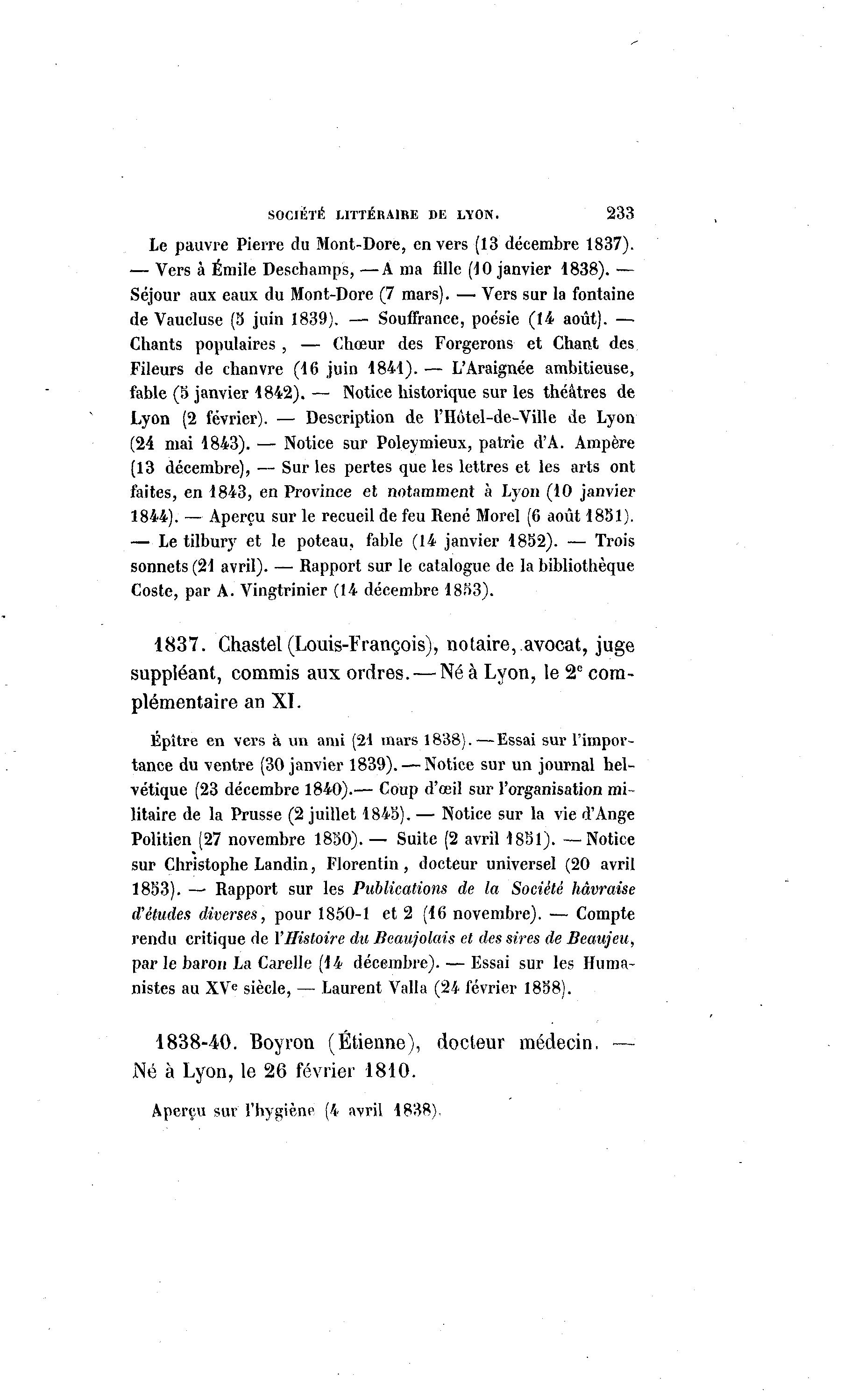 SOCIÉTÉ LITTÉRAIRE DE LYON. 233 Le pauvre Pierre du Mont-Dore, envers (13 décembre 1837). — Vers à Emile Deschamps, —A ma fille (10 janvier 1838). — Séjour aux eaux du Mont-Dore (7 mars). — Vers sur la fontaine de Vaucluse (5 juin 1839). — Souffrance, poésie (14 août). — Chants populaires , — Chœur des Forgerons et Chant des Fileurs de chanvre (16 juin 1841). — L'Araignée ambitieuse, fable (5 janvier 1842). — Notice historique sur les théâtres de Lyon (2 février). — Description de l'Hôtel-de-Ville de Lyon (24 niai 1843). — Notice sur Poleymieux, patrie d'A. Ampère (13 décembre), — Sur les pertes que les lettres et les arts ont faites, en 1843, en Province et notamment à Lyon (10 janvier 1844). — Aperçu sur le recueil de feu René Morel (6 août 1831). — Le tilbury et le poteau, fable (14 janvier 1852). — Trois sonnets (21 avril). — Rapport sur le catalogue de la bibliothèque Coste, par A. Vingtrinier (14 décembre 1833). 1837. Chastel(Louis-François), notaire,.avocat, juge suppléant, commis aux ordres. — Né à Lyon, le 2e com- plémentaire an XI. Épître en vers à un ami (21 mars 1838).—Essai sur l'impor- tance du ventre (30 janvier 1839). — Notice sur un journal hel- vétique (23 décembre 1840).— Coup d'œil sur l'organisation mi- litaire de la Prusse (2 juillet 1843). — Notice sur la vie d'Ange Politien (27 novembre 1830). — Suite (2 avril 1831). —Notice sur Christophe Landin, Florentin, docteur universel (20 avril 1833). — Rapport sur les Publications de la Société hâvraise d'études diverses, pour 1850-1 et 2 (16 novembre). — Compte rendu critique de l'Histoire du Beaujolais et des sires de Beaujeu, par le baron La Carelle (14 décembre). — Essai sur les Huma- nistes au XVe siècle, — Laurent Valla (24 février 1838). 1838-40. Boyron (Etienne), docteur médecin, — Né à Lyon, le 26 février 1810. Aperçu sur l'hygiène (4 avril 1838).