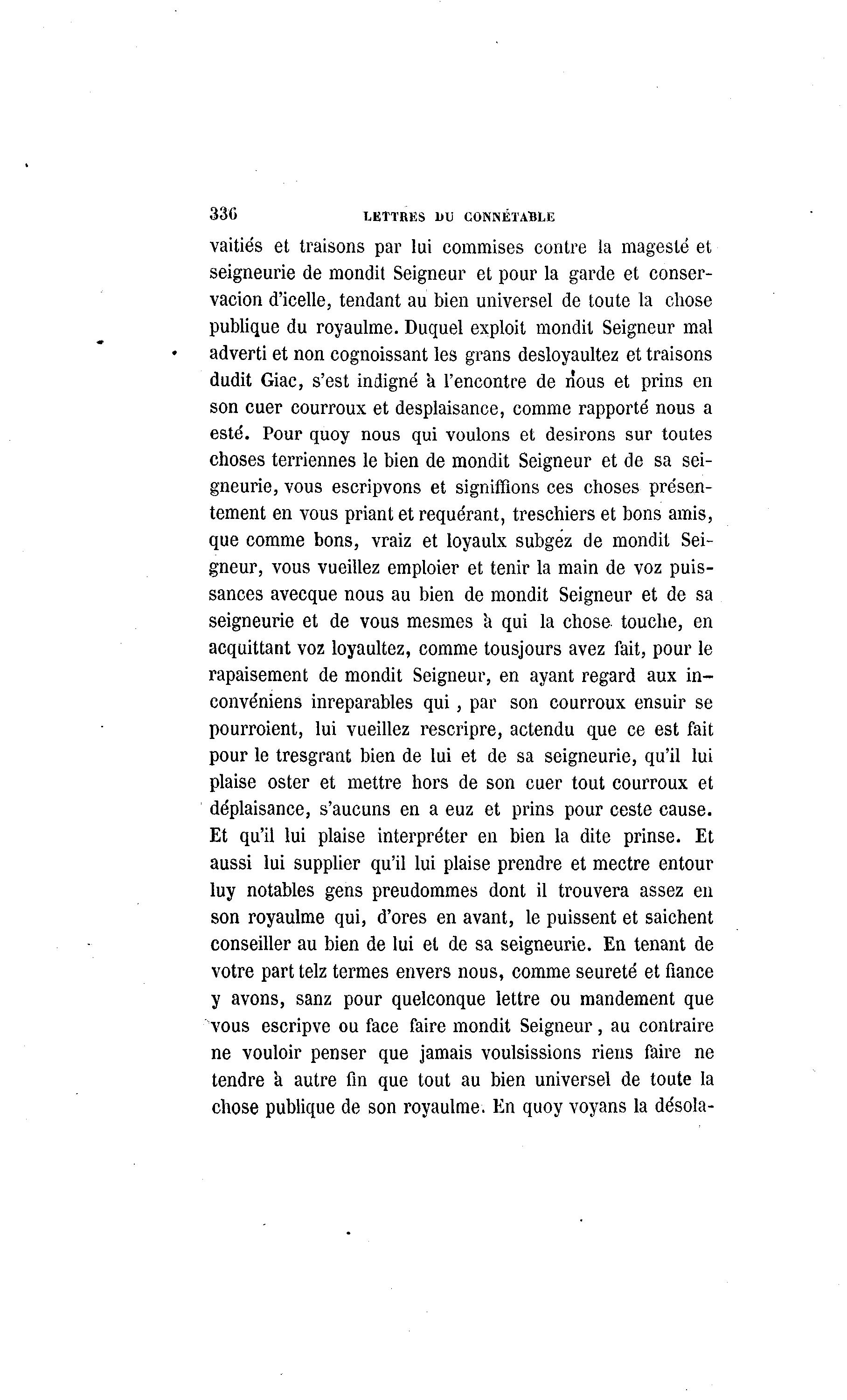 330 LETTRES 1)V CONNÉTABLE vaitiés et traisons par lui commises contre la magesté et seigneurie de mondit Seigneur et pour la garde et conser- vacion d'icelle, tendant au bien universel de toute la chose publique du royaulme. Duquel exploit mondit Seigneur mal adverti et non cognoissant les grans desloyaultez et traisons dudit Giac, s'est indigné a rencontre de nous et prins en son cuer courroux et desplaisance, comme rapporté nous a esté. Pour quoy nous qui voulons et desirons sur toutes choses terriennes le bien de mondit Seigneur et de sa sei- gneurie, vous escripvons et signifiions ces choses présen- tement en vous priant et requérant, treschiers et bons amis, que comme bons, vraiz et loyaulx subgez de mondit Sei- gneur, vous vueillez emploier et tenir la main de voz puis- sances avecque nous au bien de mondit Seigneur et de sa seigneurie et de vous mesmes a qui la chose touche, en acquittant voz loyaultez, comme tousjours avez fait, pour le rapaisement de mondit Seigneur, en ayant regard aux in- convéniens inreparables qui, par son courroux ensuir se pourroient, lui vueillez rescripre, actendu que ce est fait pour le tresgrant bien de lui et de sa seigneurie, qu'il lui plaise oster et mettre hors de son cuer tout courroux et déplaisance, s'aucuns en a euz et prins pour ceste cause. Et qu'il lui plaise interpréter en bien la dite prinse. Et aussi lui supplier qu'il lui plaise prendre et mectre entour luy notables gens preudommes dont il trouvera assez en son royaulme qui, d'ores en avant, le puissent et saichent conseiller au bien de lui et de sa seigneurie. En tenant de votre part telz termes envers nous, comme seureté et fiance y avons, sanz pour quelconque lettre ou mandement que vous escripve ou face faire mondit Seigneur, au contraire ne vouloir penser que jamais voulsissions riens faire ne tendre a autre fin que tout au bien universel de toute la chose publique de son royaulme. En quoy voyans la désola-