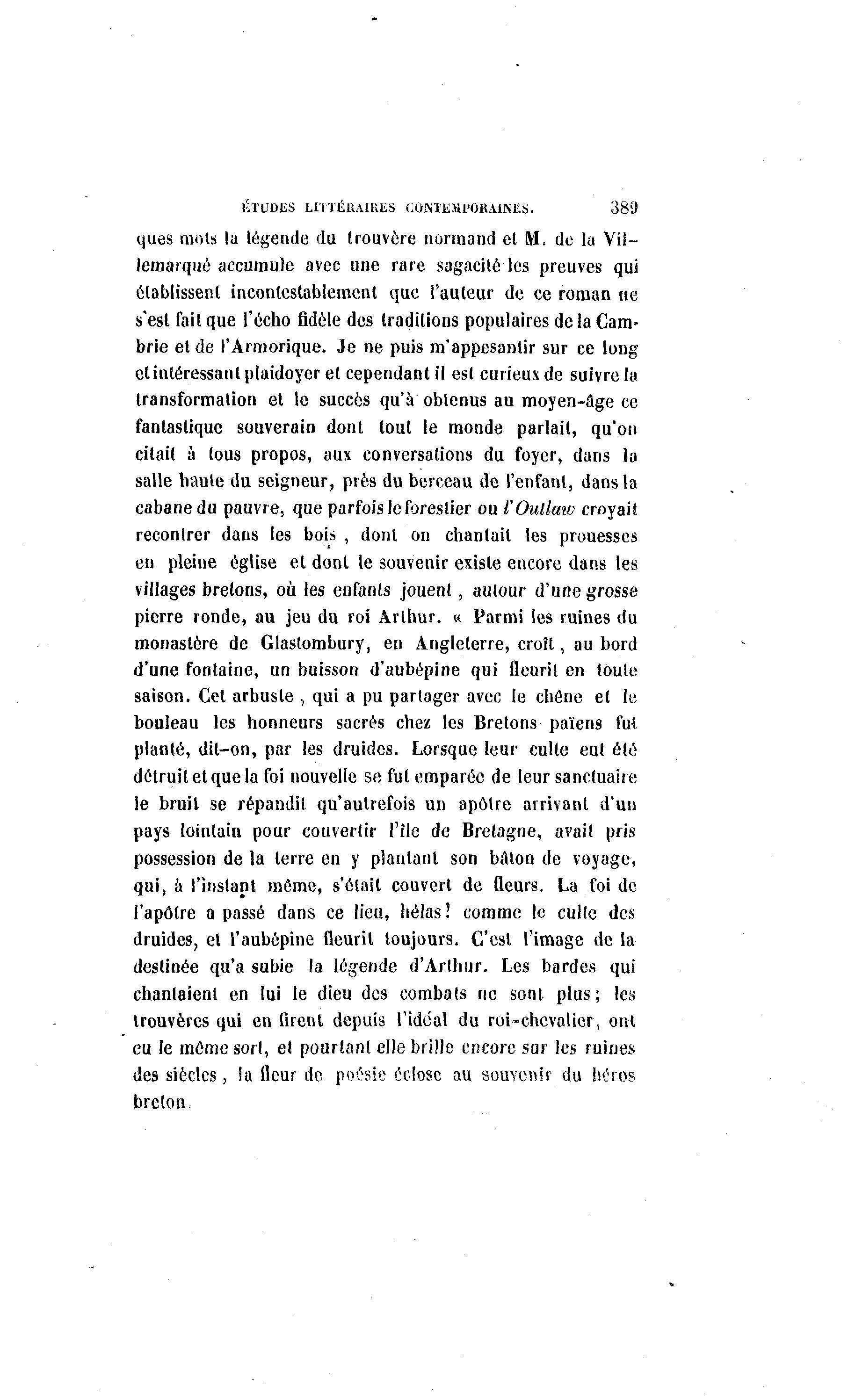 ÉTUDES LITTÉfiAIRliS CONTEMPORAINES. 38!) ques mots la légende du trouvère normand et M. de la Vil- lemarquè accumule avec une rare sagacité les preuves qui établissent incontestablement que l'auteur de ce roman ne s'est fait que l'écho fidèle des traditions populaires de la Cam- brie et de l'Armorique. Je ne puis m'appesanlir sur ce long et intéressant plaidoyer et cependant il est curieux de suivre la transformation et le succès qu'à obtenus au moyen-âge ce fantastique souverain dont tout le monde parlait, qu'on citait à tous propos, aux conversations du foyer, dans la salle haute du seigneur, près du berceau de l'enfant, dans la cabane du pauvre, que parfois le forestier ou l'Oullaw croyait recontrer dans les bois , dont on chantait les prouesses en pleine église el dont le souvenir existe encore dans les villages bretons, où les enfants jouent, autour d'une grosse pierre ronde, au jeu du roi Arthur. « Parmi les ruines du monastère de Glastombury, en Angleterre, croît, au bord d'une fontaine, un buisson d'aubépine qui fleurit en toute saison. Cet arbuste , qui a pu partager avec le chêne el le bouleau les honneurs sacrés chez les Bretons païens fui planté, dit-on, par les druides. Lorsque leur culte eut été détruit et que la foi nouvelle se fut emparée de leur sanctuaire le bruit se répandit qu'autrefois un apôtre arrivant d'un pays lointain pour convertir l'île de Bretagne, avait pris possession de la terre en y plantant son bûton de voyage, qui, â l'instant môme, s'ôlail couvert de fleurs. La foi de l'apôtre a passé dans ce lieu, hélas! comme le culte des druides, et l'aubépine fleurit toujours. C'est l'image de la destinée qu'a subie la légende d'Arthur. Les bardes qui chantaient en lui le dieu des combats ne sont plus; les trouvères qui en firent depuis l'idéal du roi-chevalier, ont eu le même sort, et pourtant elle brille encore sur les ruines des siècles, !a fleur de poésie éclosc au souvenir du héros breton,