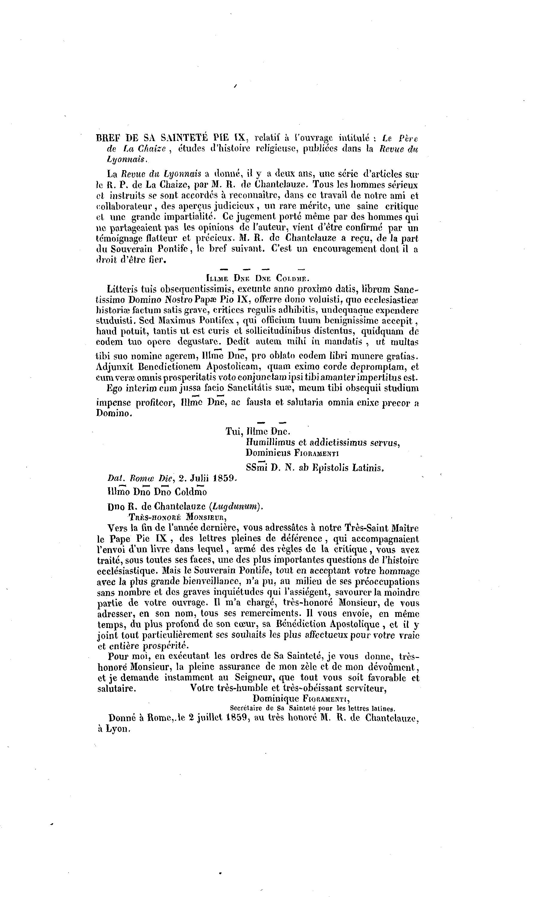 Donné à Rome,.le 2 juillet, 1859, au très honoré M. R. de Chantclauze,