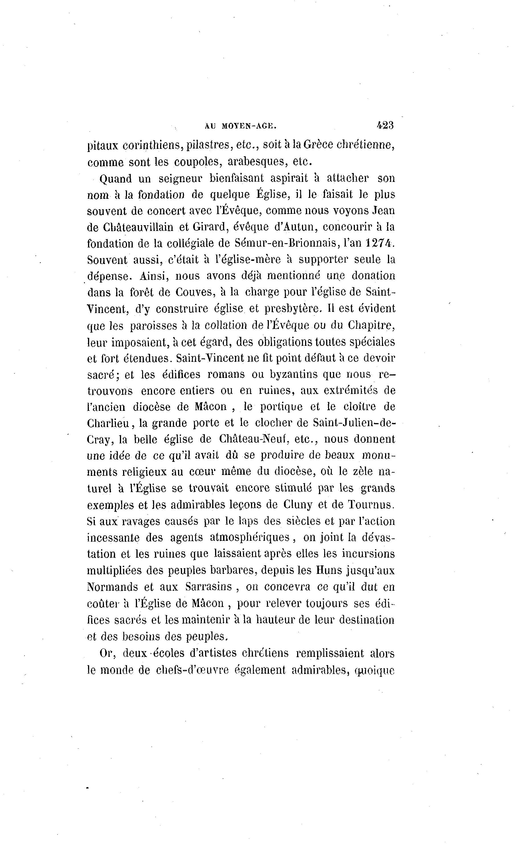 AU MOYEN-AGE. 423 pitaux corinthiens, pilastres, etc., soit à la Grèce chrétienne, comme sont les coupoles, arabesques, etc. Quand un seigneur bienfaisant aspirait a attacher son nom à la fondation de quelque Église, il le faisait le plus souvent de concert avec l'Évêque, comme nous voyons Jean de Cbâteauvillain et Girard, évêque d'Autun, concourir à la fondation de la collégiale de Sémur-en-Brionnais, l'an 1274. Souvent aussi, c'était a l'église-mère a supporter seule la dépense. Ainsi, nous avons déjà mentionné une donation dans la forêt de Couves, a la charge pour l'église de Saint- Vincent, d'y construire église et presbytère. Il est évident que les paroisses à la collation de l'Évêque ou du Chapitre, leur imposaient, a cet égard, des obligations toutes spéciales et fort étendues. Saint-Vincent ne fit point défaut a ce devoir sacré; et les édifices romans ou byzantins que nous re- trouvons encore entiers ou en ruines, aux extrémités de l'ancien diocèse de Mâcon , le portique et le cloître de Charlieu, la grande porte et le clocher de Saint-Julien-de- Cray, la belle église de Château-Neuf, etc., nous donnent une idée de ce qu'il avait dû se produire de beaux monu- ments religieux au cœur même du diocèse, où le zèle na- turel a l'Église se trouvait encore stimulé par les grands exemples et les admirables leçons de Cluny et de Tournus. Si aux ravages causés par le laps des siècles et par l'action incessante des agents atmosphériques, on joint la dévas- tation et les ruines que laissaient après elles les incursions multipliées des peuples barbares, depuis les Huns jusqu'aux Normands et aux Sarrasins , on concevra ce qu'il dut en coûter a l'Église de Mâcon , pour relever toujours ses édi- fices sacrés et les maintenir a la hauteur de leur destination et des besoins des peuples. Or, deux écoles d'artistes chrétiens remplissaient alors le monde de chefs-d'œuvre également admirables, quoique