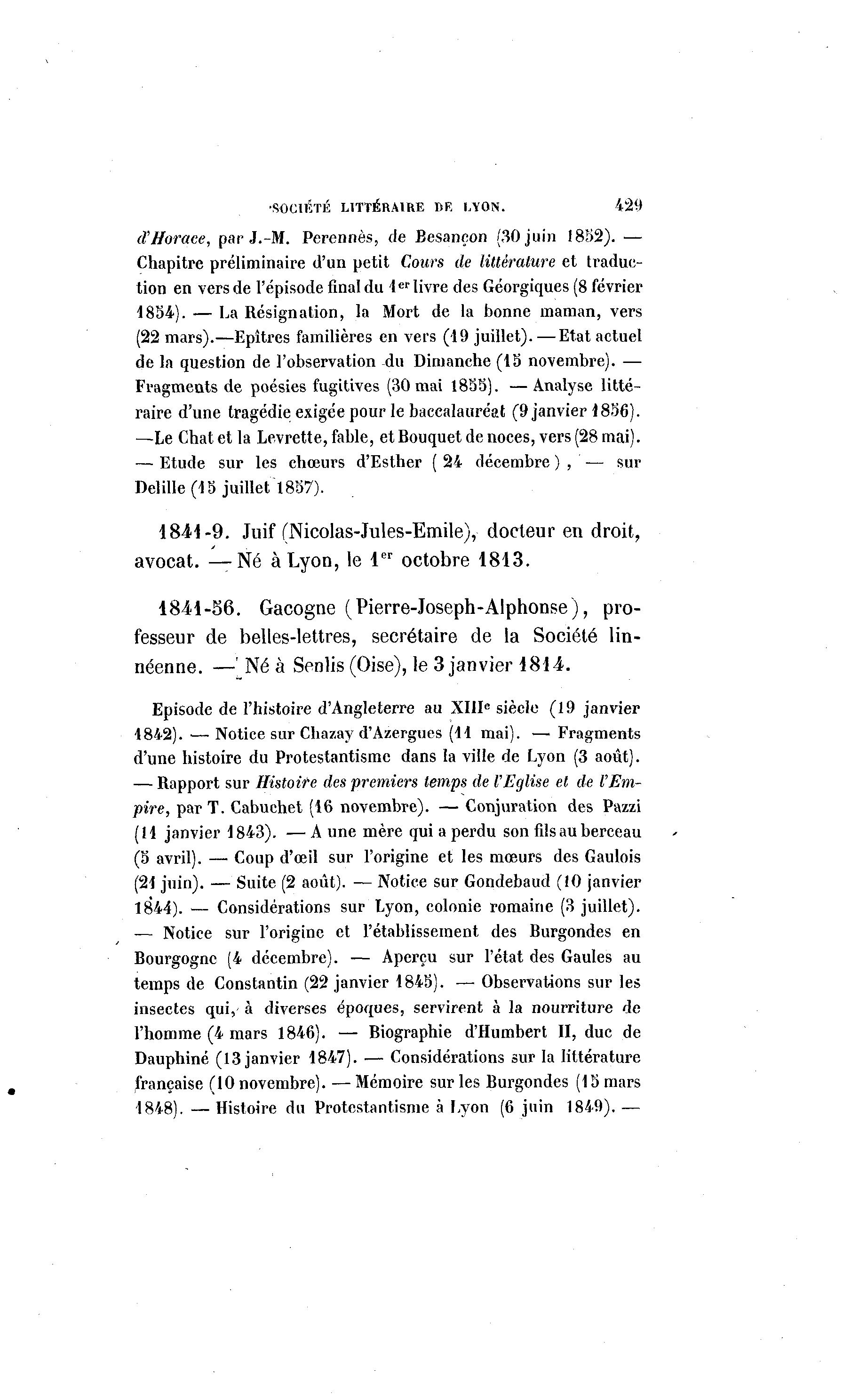 •SOCIÉTÉ LITTÉRAIRE DR LYON. 429 d'Horace, par J.-M. Perennès, de Besançon (30 juin 1852). — Chapitre préliminaire d'un petit Cours de littérature et traduc- tion en vers de l'épisode final du 1 er livre des Georgiques (8 février •1854). — La Résignation, la Mort de la bonne maman, vers (22 mars).—Epîtres familières en vers (19 juillet). —Etat actuel de la question de l'observation du Dimanche (15 novembre). — Fragments de poésies fugitives (30 mai 1833). — Analyse litté- raire d'une tragédie exigée pour le baccalauréat (9 janvier 1836). —Le Chat et la Levrette, fable, et Bouquet de noces, vers (28 mai). — Etude sur les chœurs d'Esther ( 24 décembre ) , — sur Delille (i 5 juillet 1857). 1841-9. Juif (Nicolas-Jules-Emile), docteur en droit, avocat. —Né à Lyon, le 1 er octobre 1813. 1841-56. Gacogne (Pierre-Joseph-Alphonse), pro- fesseur de belles-lettres, secrétaire de la Société lin- néenne. —' Né à Senlis (Oise), le 3 janvier 1814. Episode de l'histoire d'Angleterre au XIIIe siècle (19 janvier 4842). —Notice sur Chazay d'Azergues (11 mai). — Fragments d'une histoire du Protestantisme dans la ville de Lyon (3 août). — Rapport sur Histoire des premiers temps de l'Eglise et de l'Em- pire, par T. Cabuchet (16 novembre). — Conjuration des Pazzi (11 janvier 1843). — A une mère qui a perdu son fils au berceau (5 avril). — Coup d'œil sur l'origine et les mœurs des Gaulois (21 juin). — Suite (2 août). — Notice sur Gondebaud (10 janvier 1844). — Considérations sur Lyon, colonie romaine (3 juillet). — Notice sur l'origine et l'établissement des Burgondes en Bourgogne (4 décembre). — Aperçu sur l'état des Gaules au temps de Constantin (22 janvier 1845). — Observations sur les insectes qui, à diverses époques, servirent à la nourriture de l'homme (4 mars 1846). — Biographie d'Humbert II, duc de Dauphiné (13 janvier 1847). — Considérations sur la littérature française (10 novembre). —Mémoire sur les Burgondes (15 mars 1848). — Histoire du Protestantisme à Lyon (6 juin 1849). —