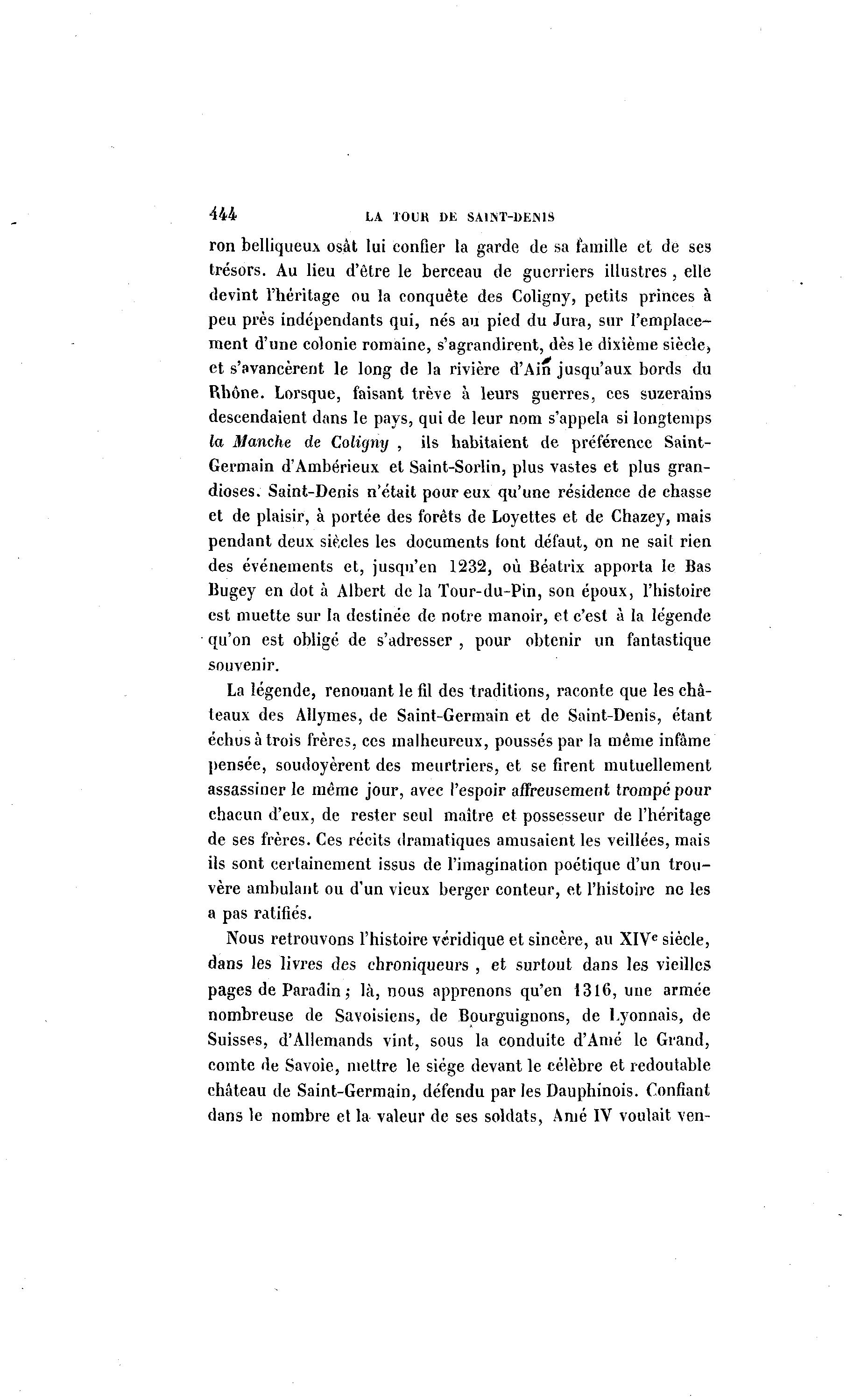 444 LA TOUK 1)K SAINT-DENIS ron belliqueux osât lui confier la garde de sa famille et de ses trésors. Au lieu d'être le berceau de guerriers illustres, elle devint l'héritage ou la conquête des Coligny, petits princes à peu près indépendants qui, nés au pied du Jura, sur l'emplace- ment d'une colonie romaine, s'agrandirent, dès le dixième siècle, et s'avancèrent le long de la rivière d'Ain jusqu'aux bords du Rhône. Lorsque, faisant trêve à leurs guerres, ces suzerains descendaient dans le pays, qui de leur nom s'appela si longtemps la Manche de Coligny , ils habitaient de préférence Saint- Germain d'Ambérieux et Saint-Sorlin, plus vastes et plus gran- dioses. Saint-Denis n'était pour eux qu'une résidence de chasse et de plaisir, à portée des forêts de Loyettes et de Chazey, mais pendant deux siècles les documents font défaut, on ne sail rien des événements et, jusqu'en 1232, où Béatrix apporta le Bas Bugey en dot à Albert de la Tour-du-Pin, son époux, l'histoire est muette sur la destinée de notre manoir, et c'est à la légende qu'on est obligé de s'adresser , pour obtenir un fantastique souvenir. La légende, renouant le fil des traditions, raconte que les châ- teaux des Allymes, de Saint-Germain et de Saint-Denis, étant échus à trois frères, ces malheureux, poussés par la même infâme pensée, soudoyèrent des meurtriers, et se firent mutuellement assassiner le même jour, avec l'espoir affreusement trompé pour chacun d'eux, de rester seul maître et possesseur de l'héritage de ses frères. Ces récits dramatiques amusaient les veillées, mais ils sont certainement issus de l'imagination poétique d'un trou- vère ambulant ou d'un vieux berger conteur, et l'histoire ne les a pas ratifiés. Nous retrouvons l'histoire véridique et sincère, au XIVe siècle, dans les livres des chroniqueurs , et surtout dans les vieilles pages de Paradin ,• là , nous apprenons qu'en 1316, une armée nombreuse de Savoisiens, de Bourguignons, de Lyonnais, de Suisses, d'Allemands vint, sous la conduite d'Ame le Grand, comte de Savoie, mettre le siège devant le célèbre et redoutable château de Saint-Germain, défendu par les Dauphinois. Confiant dans le nombre et la valeur de ses soldats, Anié IV voulait ven-