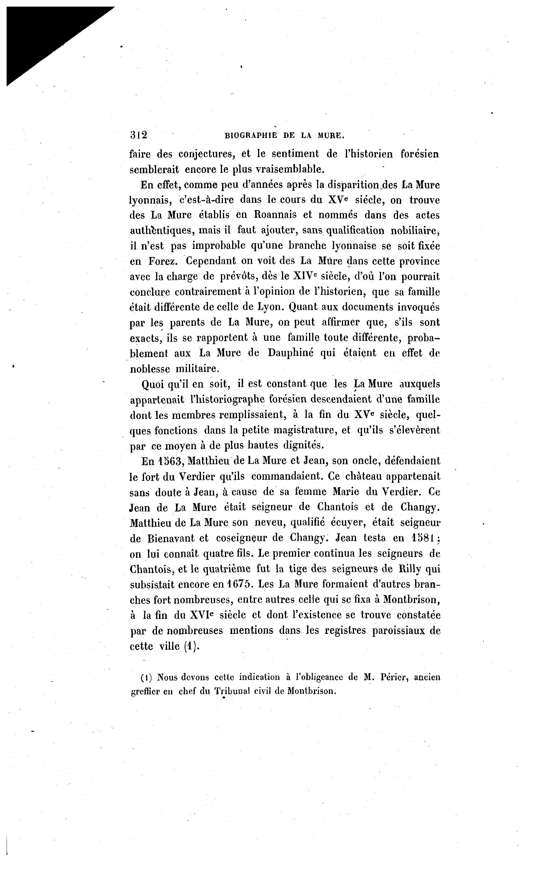 312 BIOGRAPHIE DE LA MURE. faire des conjectures, et le sentiment de l'historien forésien semblerait encore le plus vraisemblable. En effet, comme peu d'années après la disparition.des La Mure lyonnais, c'est-à -dire dans le cours du XVe siècle, on trouve des La Mure établis en Roannais et nommés dans des actes authentiques, mais il faut ajouter, sans qualification nobiliaire, il n'est pas improbable qu'une branche lyonnaise se soit fixée en Forez. Cependant on voit des La Mure dans cette province avec la charge de prévôts, dès le XIV E siècle, d'où l'on pourrait conclure contrairement à l'opinion de l'historien, que sa famille était différente de celle de Lyon. Quant aux documents invoqués par les parents de La Mure, on peut affirmer que, s'ils sont exacts, ils se rapportent à une famille toute différente, proba- blement aux La Mure de Dauphiné qui étaient en effet de noblesse militaire. Quoi qu'il en soit, il est constant que les La Mure auxquels appartenait l'historiographe forésien descendaient d'une famille dont les membres remplissaient, à la fin du XVe siècle, quel- ques fonctions dans la petite magistrature, et qu'ils s'élevèrent par ce moyen à de plus hautes dignités. En 1363, Matthieu de La Mure et Jean, son oncle, défendaient le fort du Verdier qu'ils commandaient. Ce château appartenait sans doute à Jean, à cause de sa femme Marie du Verdier. Ce Jean de La Mure était seigneur de Chantois et de Changy. Matthieu de La Mure son neveu, qualifié écuyer, était seigneur de Bienavant et coseigneur de Changy. Jean testa en 1381 : on lui connaît quatre fils. Le premier continua les seigneurs de Chantois, et le quatrième fut la tige des seigneurs de Rilly qui subsistait encore en 1675. Les La Mure formaient d'autres bran- ches fort nombreuses, entre autres celle qui se fixa à Montbrison, à la fin du XVIe siècle et dont l'existence se trouve constatée par de noffibreuses mentions dans les registres paroissiaux de cette ville (1). (1) Nous devons cette indication à l'obligeance de M. Périer, ancien greffier en chef du Tribunal civil de Montbrison.