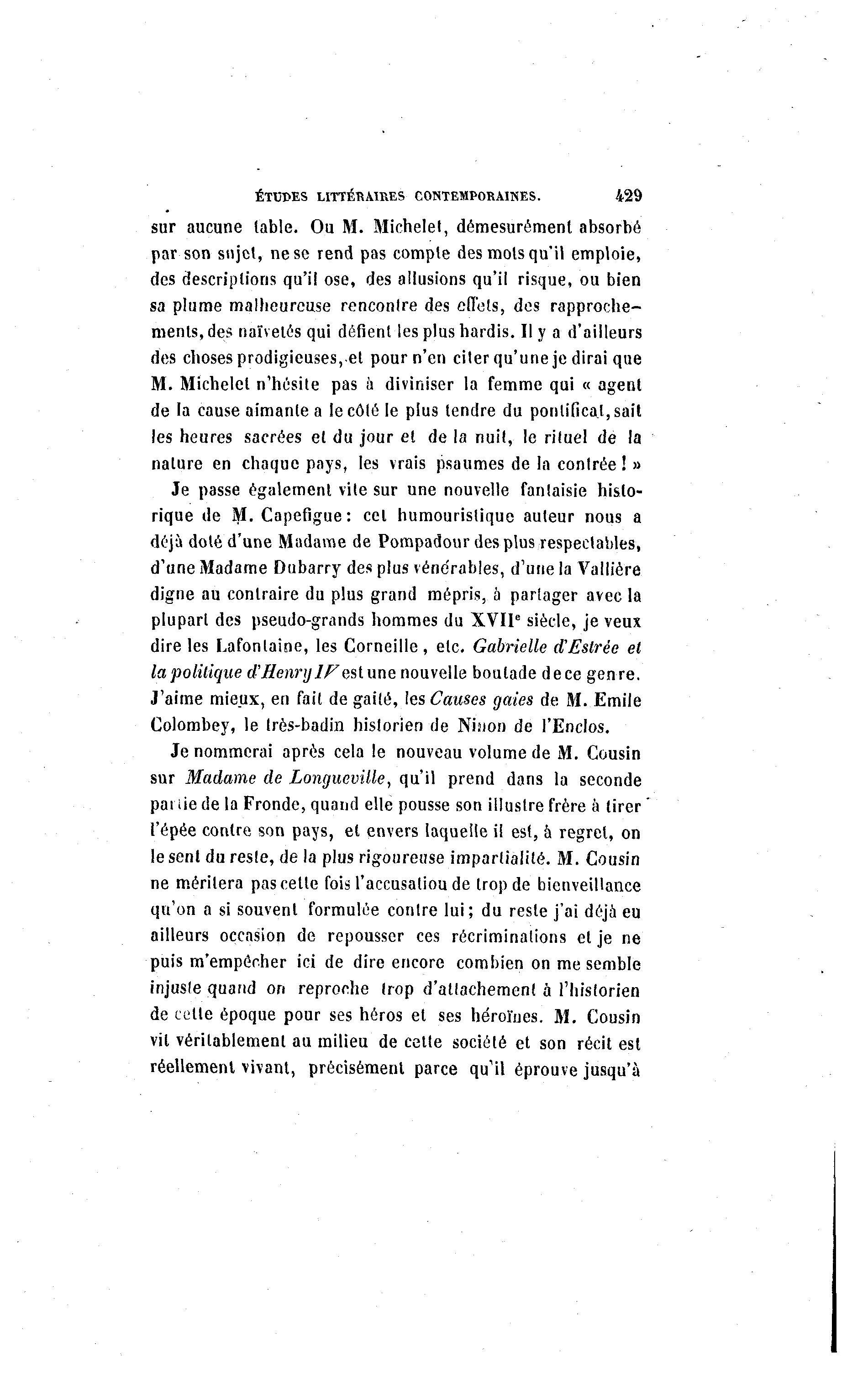 ÉTCPES LITTÉRAIRES CONTEMPORAINES. 429 sur aucune table. Ou M. Michelel, démesurément absorbé par son sujet, ne se rend pas compte des mots qu'il emploie, des descriptions qu'il ose, des allusions qu'il risque, ou bien sa plume malheureuse rencontre des effets, des rapproche- ments, des naïvetés qui défient les plus hardis. Il y a d'ailleurs des choses prodigieuses, et pour n'en citer qu'une je dirai que M. Michelel n'hésite pas à diviniser la femme qui « agent de la cause aimante a le côté le plus tendre du pontifical, sait les heures sacrées et du jour et de la nuit, le rituel de la nature en chaque pays, les vrais psaumes de la contrée ! » Je passe également vite sur une nouvelle fantaisie histo- rique de M. Capefigue: cel humourislique auteur nous a déjà doté d'une Madame de Pompadour des plus respectables, d'une Madame Dubarry des plus vénérables, d'une la Vallière digne au contraire du plus grand mépris, à partager avec la plupart des pseudo-grands hommes du XVIIe siècle, je veux dire les Lafonlaine, les Corneille , etc. Gabrielle cTEstrée et la politique d'Henry J F asl une nouvelle boutade de ce genre. J'aime mieux, en fait de gailé, les Causes gaies de M. Emile Colombey, le très-badin historien de Nhion de l'Enclos. Je nommerai après cela le nouveau volume de M. Cousin sur Madame de Longueville, qu'il prend dans la seconde pai iie de la Fronde, quand elle pousse son illustre frère à tirer l'épée contre son pays, et envers laquelle il est, à regret, on le sent du reste, de la plus rigoureuse impartialité. M. Cousin ne méritera pas cette fois l'accusatioude trop de bienveillance qu'on a si souvent formulée contre lui; du reste j'ai déjà eu ailleurs occasion de repousser ces récriminations et je ne puis m'empôcher ici de dire encore combien on me semble injuste quand on reproche trop d'atlachement à l'historien de cette époque pour ses héros et ses héroïnes. M. Cousin vil véritablement au milieu de cette société et son récit est réellement vivant, précisément parce qu'il éprouve jusqu'Ã