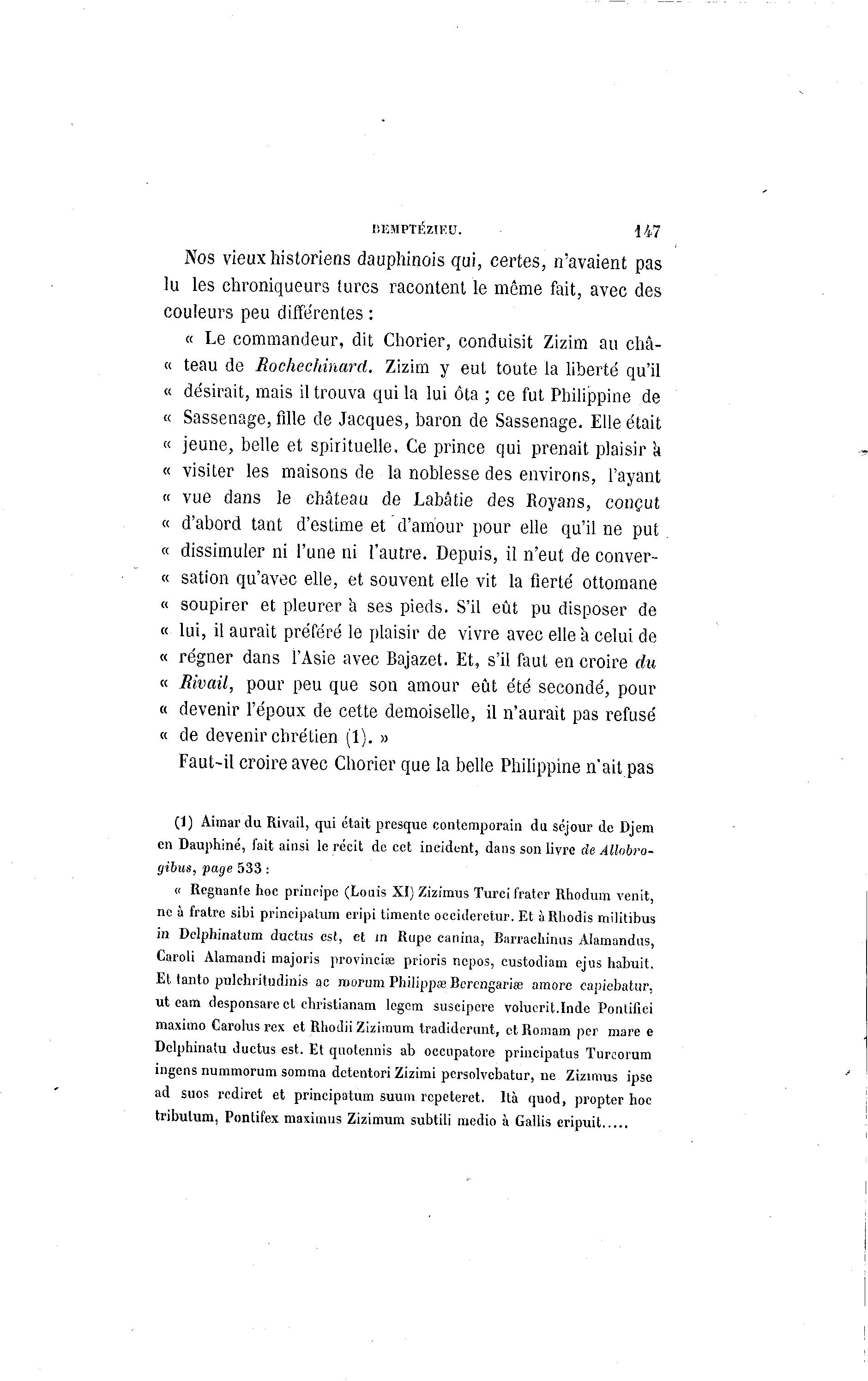rsEMPTÉziF.u. -147 Nos vieux historiens dauphinois qui, certes, n'avaient pas lu les chroniqueurs turcs racontent le même fait, avec des couleurs peu différentes : « Le commandeur, dit Chorier, conduisit Zizim au châ- « teau de Rochechinard. Zizim y eut toute la liberté qu'il « désirait, mais il trouva qui la lui ôta ; ce fut Philippine de « Sassenage, fille de Jacques, baron de Sassenage. Elle était « jeune, belle et spirituelle. Ce prince qui prenait plaisir à « visiter les maisons de la noblesse des environs, l'ayant « vue dans le château de Labâtie des Royans, conçut « d'abord tant d'estime et d'amour pour elle qu'il ne put « dissimuler ni l'une ni l'autre. Depuis, il n'eut de conver- « sation qu'avec elle, et souvent elle vit la fierté ottomane « soupirer et pleurer a ses pieds. S'il eût pu disposer de « lui, il aurait préféré le plaisir de vivre avec elle a celui de « régner dans l'Asie avec Bajazet. Et, s'il faut en croire du « Rivail, pour peu que son amour eût été secondé, pour « devenir l'époux de cette demoiselle, il n'aurait pas refusé « de devenir chrétien (1). » Faut-il croire avec Chorier que la belle Philippine n'ait pas (1) Aimardu Rivail, qui était presque contemporain du séjour de Djem en Dauphiné, fait ainsi le récit de cet incident, dans son livre de Allobro- gibus, page 533 : « Régnante hoc principe (Louis XI) Zizimus Turci frater Rhodum venit, ne à fratre sibi principalum eripi timente occideretur. Et à Rliodis militibus in Delphinatum ductus est, et m Rupe canina, Barrachinus Alamandns, Caroli Alamandi majoris provincial prioris ncpos, custodiam ejus habuit. Et tanto pulchritudinis ac roorum Philippse Bcrcngariœ amore capiebatur, ut eam desponsare cl christianam legcm suscipcre volucrit.Inde Pontifiei maximo Carolus rex et Rliodii Zizirnum tradiderunt, etRomam per mare e Dclphinatu ductus esl. Et quotennis ab occupatore principatus Tureorum ingens nummorum somma detentori Zizimi persolvcbatur, ne Zizimus ipse ad suos rcdiret et principatum suum rcpeteret. ltà quod, propter hoc tribulum, Pontifex maximus Zizirnum subtili medio à Gallis cripuit