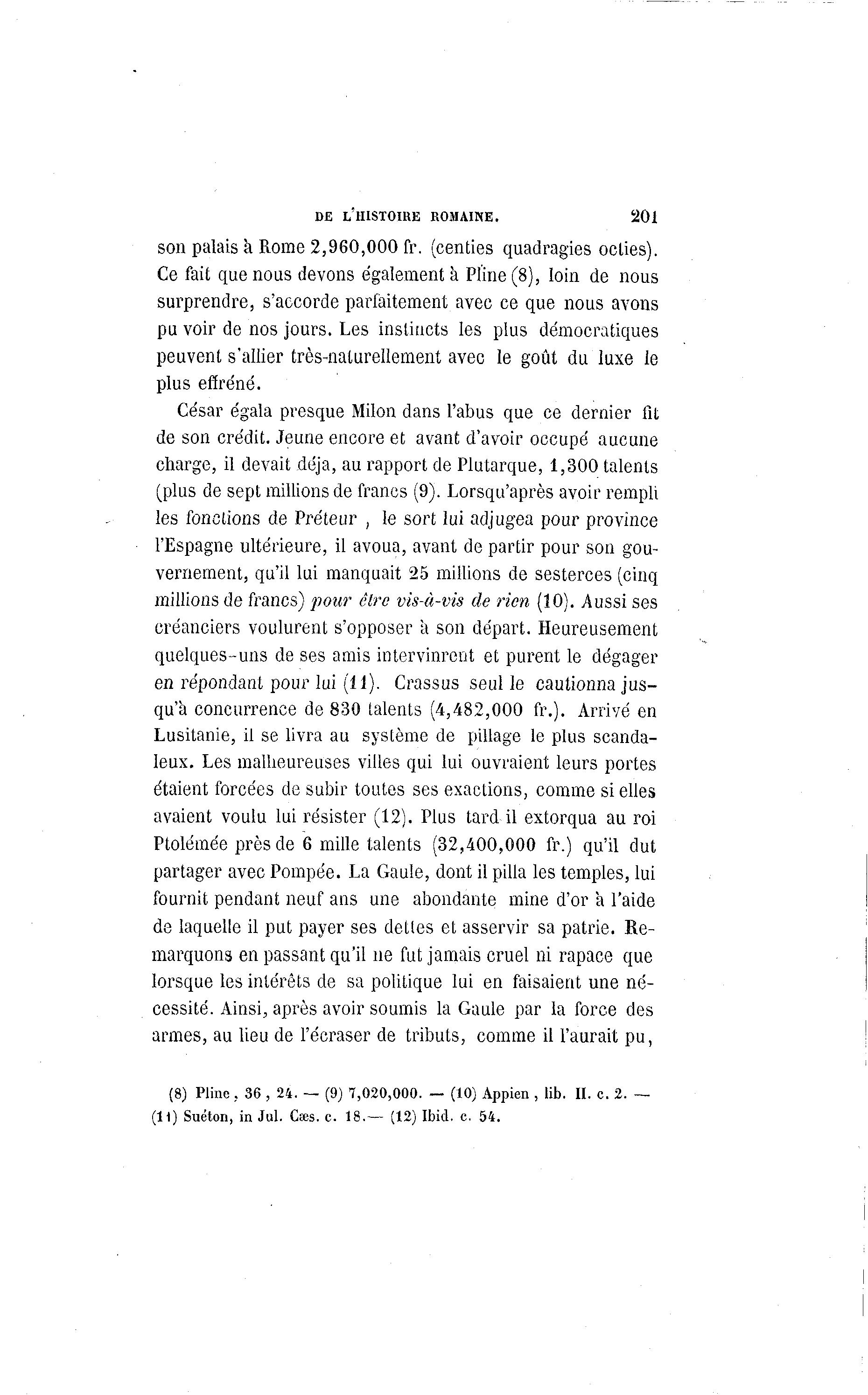 DE L'HISTOIRE ROMAINE. 201 son palais à Rome 2,960,000 fr. (centies quadragies oclies). Ce fait que nous devons également à Pline (8), loin de nous surprendre, s'accorde parfaitement avec ce que nous avons pu voir de nos jours. Les instincts les plus démocratiques peuvent s'allier très-naturellement avec le goût du luxe le plus effréné. César égala presque Milon dans l'abus que ce dernier fit de son crédit. Jeune encore et avant d'avoir occupé aucune charge, il devait déjà , au rapport de Plutarque, 1,300 talents (plus de sept millions de francs (9). Lorsqu'après avoir rempli les fonctions de Préteur , le sort lui adjugea pour province l'Espagne ultérieure, il avoua, avant de partir pour son gou- vernement, qu'il lui manquait 25 millions de sesterces (cinq millions de francs) pour être vis-à -vis de rien (10). Aussi ses créanciers voulurent s'opposer a son départ. Heureusement quelques-uns de ses amis intervinrent et purent le dégager en répondant pour lui (11). Crassus seul le cautionna jus- qu'à concurrence de 830 talents (4,482,000 fr.). Arrivé en Lusitanie, il se livra au système de pillage le plus scanda- leux. Les mallieureuses villes qui lui ouvraient leurs portes étaient forcées de subir toutes ses exactions, comme si elles avaient voulu lui résister (12). Plus tard il extorqua au roi Ptolémée près de 6 mille talents (32,400,000 fr.) qu'il dut partager avec Pompée. La Gaule, dont il pilla les temples, lui fournit pendant neuf ans une abondante mine d'or a l'aide de laquelle il put payer ses dettes et asservir sa patrie. Re- marquons en passant qu'il ne fut jamais cruel ni rapace que lorsque les intérêts de sa politique lui en faisaient une né- cessité. Ainsi, après avoir soumis la Gaule par la force des armes, au lieu de l'écraser de tributs, comme il l'aurait pu, (8) Pline, 36 , 24. — (9) 7,020,000. — (10) Appien , lib. II. c. 2. — (11) Suéton, in Jul. Cœs. c. 18.— (12) Ibid. c. 54.