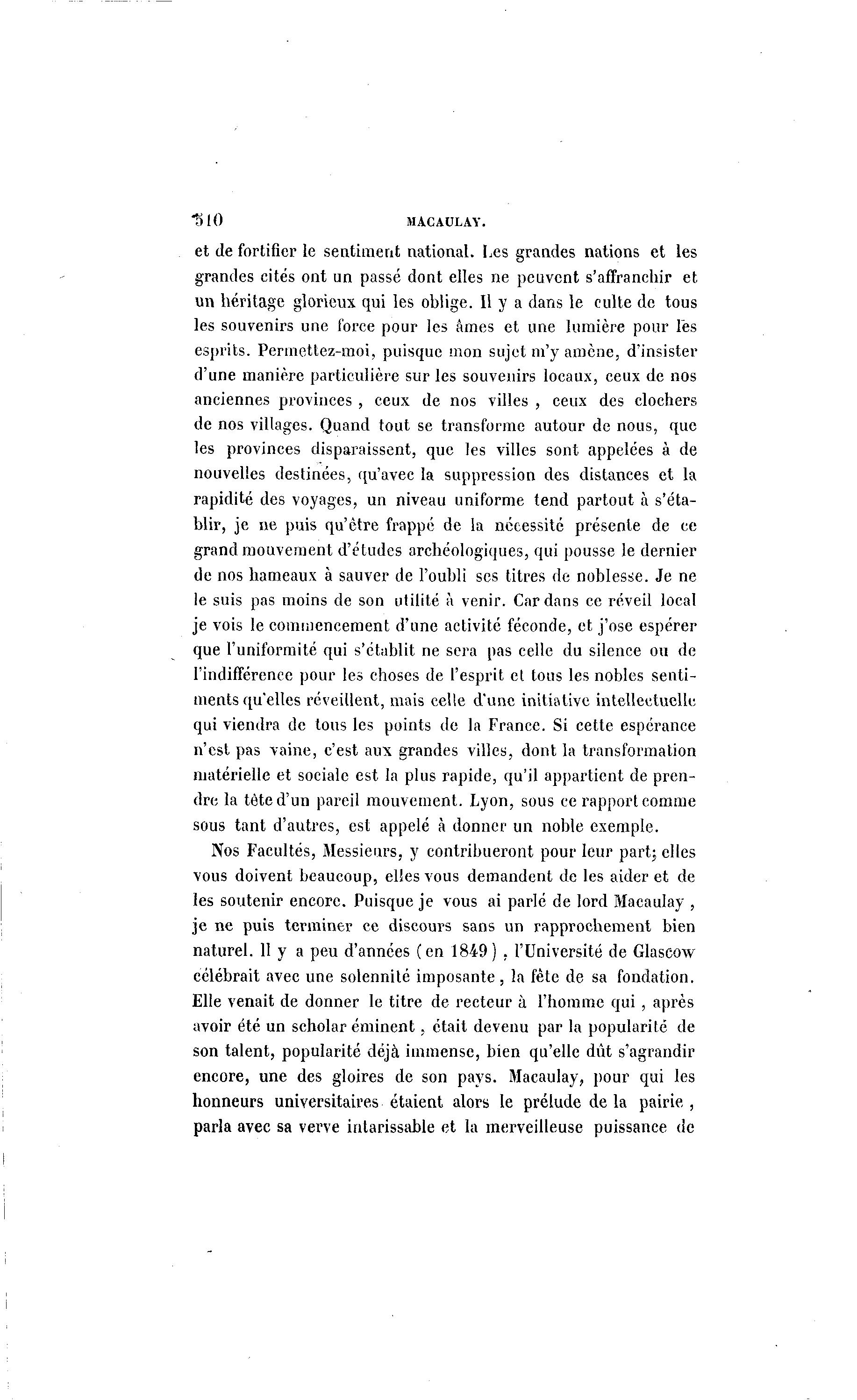 "510 MACAULAY. et de fortifier le sentiment national. Les grandes nations et les grandes cités ont un passé dont elles ne peuvent s'affranchir et un héritage glorieux qui les oblige. Il y a dans le culte de tous les souvenirs une force pour les âmes et une lumière pour les esprits. Permettez-moi, puisque mon sujet m'y amène, d'insister d'une manière particulière sur les souvenirs locaux, ceux de nos anciennes provinces , ceux de nos villes , ceux des clochers de nos villages. Quand tout se transforme autour de nous, que les provinces disparaissent, que les villes sont appelées à de nouvelles destinées, qu'avec la suppression des distances et la rapidité des voyages, un niveau uniforme tend partout à s'éta- blir, je ne puis qu'être frappé de la nécessité présente de ce grand mouvement d'études archéologiques, qui pousse le dernier de nos hameaux à sauver de l'oubli ses titres de noblesse. Je ne le suis pas moins de son utilité à venir. Cardans ce réveil local je vois le comiiiencement d'une activité féconde, et j'ose espérer que l'uniformité qui s'établit ne sera pas celle du silence ou de l'indifférence pour les choses de l'esprit et tous les nobles senti- ments qu'elles réveillent, mais celle d'une initiative intellectuelle qui viendra de tous les points de la France. Si cette espérance n'est pas vaine, c'est aux grandes villes, dont la transformation matérielle et sociale est la plus rapide, qu'il appartient de pren- dre la tête d'un pareil mouvement. Lyon, sous ce rapport comme sous tant d'autres, est appelé à donner un noble exemple. Nos Facultés, Messieurs, y contribueront pour leur part; elles vous doivent beaucoup, elles vous demandent de les aider et de les soutenir encore. Puisque je vous ai parlé de lord Macaulay , je ne puis terminer ce discours sans un rapprochement bien naturel. 11 y a peu d'années (en 1849) , l'Université de Glascow célébrait avec une solennité imposante , la fête de sa fondation. Elle venait de donner le titre de recteur à l'homme qui , après avoir été un scholar éminent, était devenu par la popularité de son talent, popularité déjà immense, bien qu'elle dût s'agrandir encore, une des gloires de son pays. Macaulay, pour qui les honneurs universitaires étaient alors le prélude de la pairie,, parla avec sa verve intarissable et la merveilleuse puissance de