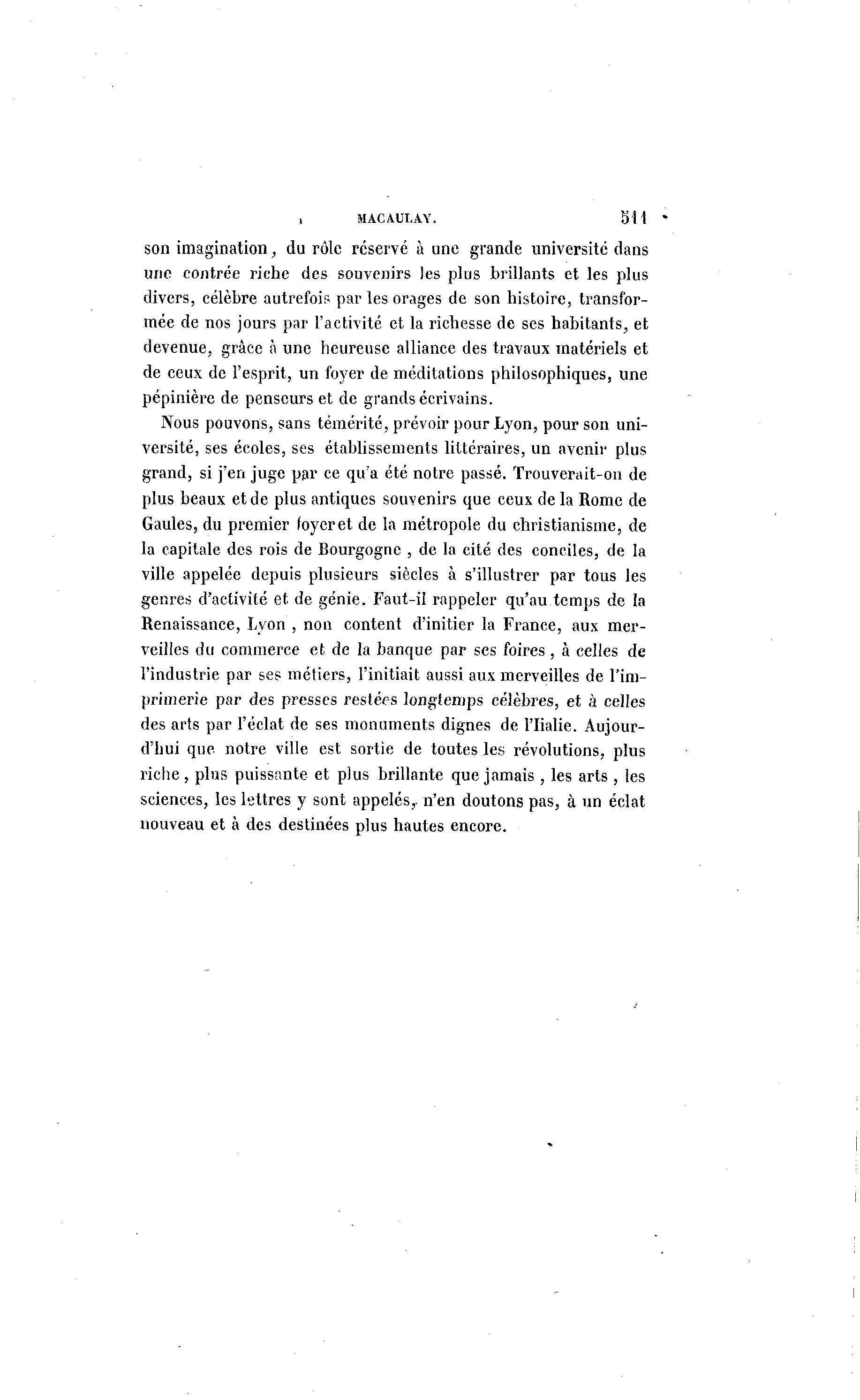, MACAULAY. S! 1 son imagination, du rôle réservé à une grande université dans une contrée riche des souvenirs les plus brillants et les plus divers, célèbre autrefois par les orages de son histoire, transfor- mée de nos jours par l'activité et la richesse de ses habitants, et devenue, grâce à une heureuse alliance des travaux matériels et de ceux de l'esprit, un foyer de méditations philosophiques, une pépinière de penseurs et de grands écrivains. Nous pouvons, sans témérité, prévoir pour Lyon, pour son uni- versité, ses écoles, ses établissements littéraires, un avenir plus grand, si j'en juge par ce qu'a été notre passé. Trouverait-on de plus beaux et de plus antiques souvenirs que ceux de la Rome de Gaules, du premier foyer et de la métropole du christianisme, de la capitale des rois de Bourgogne , de la cité des conciles, de la ville appelée depuis plusieurs siècles à s'illustrer par tous les genres d'activité et de génie. Faut-il rappeler qu'au temps de la Renaissance, Lyon , non content d'initier la France, aux mer- veilles du commerce et de la banque par ses foires , à celles de l'industrie par ses métiers, l'initiait aussi aux merveilles de l'im- primerie par des presses restées longtemps célèbres, et à celles des arts par l'éclat de ses monuments dignes de l'Iialie. Aujour- d'hui que notre ville est sortie de toutes les révolutions, plus riche, plus puissante et plus brillante que jamais , les arts , les sciences, les lettres y sont appelés,, n'en doutons pas, à un éclat nouveau et à des destinées plus hautes encore.