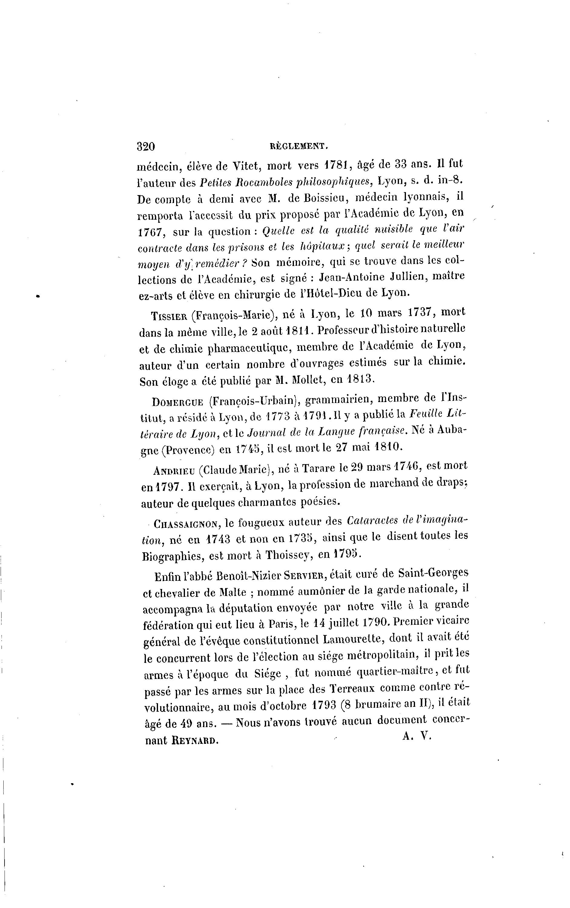 320 RÈGLEMENT. médecin, élève de Vitet, mort vers 1781, âgé de 33 ans. Il fut l'auteur des Petites Rocamboles philosophiques, Lyon, s. d. in-8. De compte à demi avec M. de Boissicu, médecin lyonnais, il remporta l'accessit du prix proposé par l'Académie de Lyon, en 1767, sur la question : Quelle est la qualité nuisible que l'air contracte dans les prisons et les hôpitaux; quel serait le meilleur moyen d'y] remédier ? Son mémoire, qui se trouve dans les col- lections de l'Académie, est signé : Jean-Antoine Jullien, maître ez-aiis et élève en chirurgie de l'Hôtel-Dieu de Lyon. TISSIER (François-Marie), né à Lyon, le 10 mars 1737, mort dans la même ville, le 2 août 1811. Professeur d'histoire naturelle et de chimie pharmaceutique, membre de l'Académie de Lyon, auteur d'un certain nombre d'ouvrages estimés sur la chimie. Son éloge a été publié par M. Mollet, en 1813. DOMERGUE (François-Urbain), grammairien, membre de l'Ins- titut, a résidé à Lyon, de 1773 à 4791.11 y a publié la Feuille Lit- téraire de Lyon, et le Journal de la Langue française. Né à Auba- gne (Provence) en 1745, il est mort le 27 luai 1810. ANDIUEU (ClaudeMarie), né à Tarare le 29 mars 174G, est mort en 1797. Il exerçait, à Lyon, la profession de marchand de draps; auteur de quelques charmantes poésies. CHASSAIGNON, le fougueux auteur des Cataractes de l'imagina- tion, né en 1743 et non en 1735, ainsi que le disent toutes les Biographies, est mort à Thoissey, en 1795. Enfin l'abbé Benoît-Nizier SERVIER, était curé de Saint-Georges et chevalier de Malte ; nommé aumônier de la garde nationale, il accompagna la députation envoyée par notre ville à la grande fédération qui eut lieu à Paris, le 14 juillet 1790. Premier vicaire général de l'évèque constitutionnel Lamourelte, dont il avait été le concurrent lors de l'élection au siège métropolitain, il prit les armes à l'époque du Siège , fut nommé quartier-maître, et fut passé par les armes sur la place des Terreaux comme contre ré- volutionnaire, au mois d'octobre 1793 (8 brumaire an II), il était âgé de 49 ans. — Nous n'avons trouvé aucun document concer- nant REYNARD. A. V.