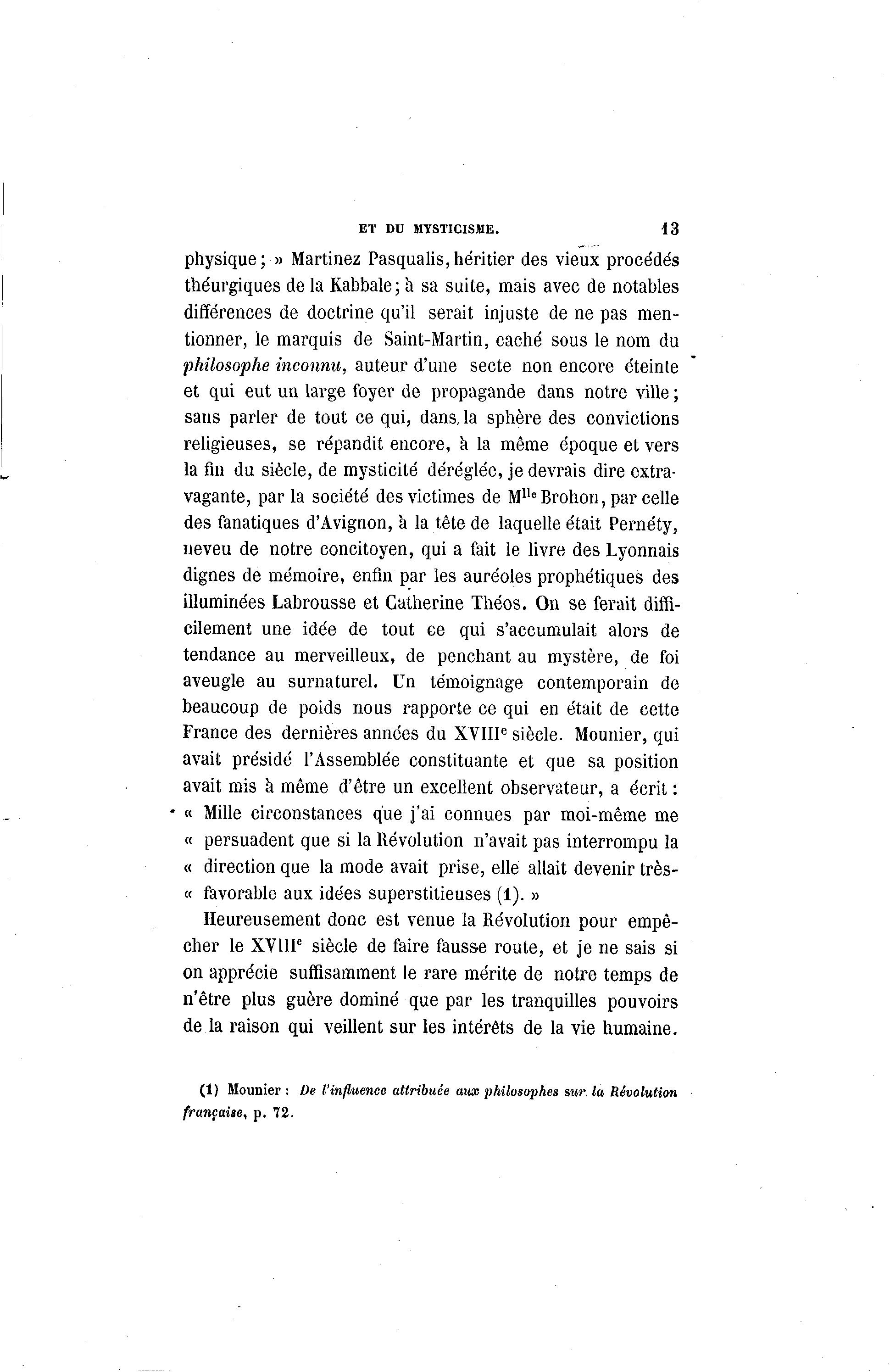 ET DU MYSTICISME. 13 physique; » Martinez Pasqualis,héritier des vieux procédés théurgiques de la Kabbale; à sa suite, mais avec de notables différences de doctrine qu'il serait injuste de ne pas men- tionner, le marquis de Saint-Martin, caché sous le nom du philosophe inconnu, auteur d'une secte non encore éteinte et qui eut un large foyer de propagande dans notre ville ; sans parler de tout ce qui, dans, la sphère des convictions religieuses, se répandit encore, a la même époque et vers la fin du siècle, de mysticité déréglée, je devrais dire extra- vagante, parla société des victimes de Mlle Brohon, par celle des fanatiques d'Avignon, à la tête de laquelle était Pernéty, neveu de notre concitoyen, qui a fait le livre des Lyonnais dignes de mémoire, enfin par les auréoles prophétiques des illuminées Labrousse et Catherine Théos. On se ferait diffi- cilement une idée de tout ce qui s'accumulait alors de tendance au merveilleux, de penchant au mystère, de foi aveugle au surnaturel. Un témoignage contemporain de beaucoup de poids nous rapporte ce qui en était de cette France des dernières années du XVIIIe siècle. Mounier, qui avait présidé l'Assemblée constituante et que sa position avait mis à même d'être un excellent observateur, a écrit : « Mille circonstances que j'ai connues par moi-même me « persuadent que si la Révolution n'avait pas interrompu la « direction que la mode avait prise, elle allait devenir très- « favorable aux idées superstitieuses (1). » Heureusement donc est venue la Révolution pour empê- cher le XVIIIe siècle de faire fausse route, et je ne sais si on apprécie suffisamment le rare mérite de notre temps de n'être plus guère dominé que par les tranquilles pouvoirs de la raison qui veillent sur les intérêts de la vie humaine. (1) Mounier : De l'influence attribuée aux philosophes sur. la Révolution française, p. 72.