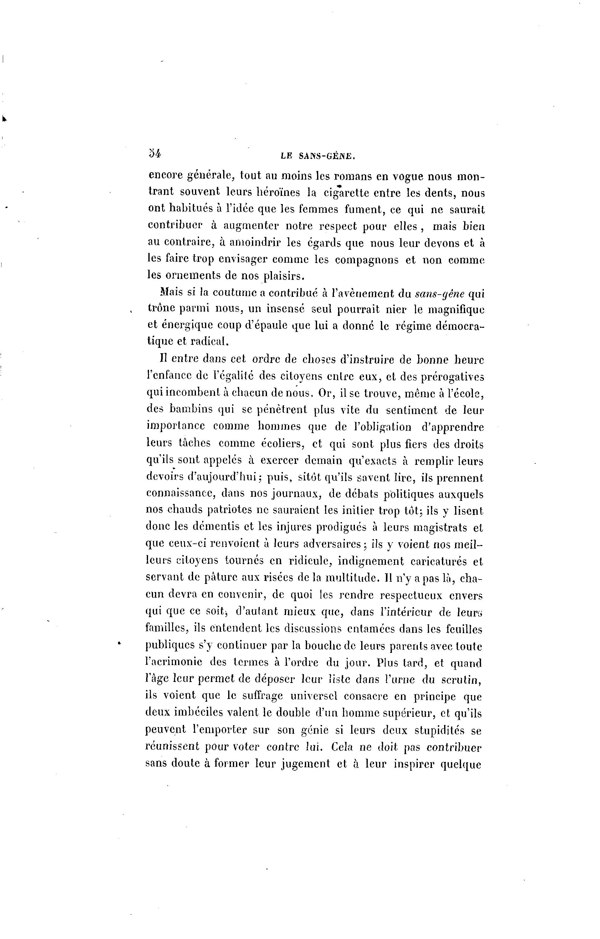 54 LE SANS-GÉ«£. encore générale, tout au moins les romans en vogue nous mon- trant souvent leurs héroïnes la cigarette entre les dents, nous ont habitués à l'idée que les femmes fument, ce qui ne saurait contribuer à augmenter notre respect pour elles , mais bien au contraire, à amoindrir les égards que nous leur devons et à les faire trop envisager comme les compagnons et non comme les ornements de nos plaisirs. Mais si la coutume a contribué à l'avènement du sans-gêne qui trône parmi nous, un insensé seul pourrait nier le magnifique et énergique coup d'épaule que lui a donné le régime démocra- tique et radical. Il entre dans cet ordre de choses d'instruire de bonne heure l'enfance de l'égalité des citoyens entre eux, et des prérogatives qui incombent à chacun de nous. Or, il se trouve, même à l'école, des bambins qui se pénètrent plus vite du sentiment de leur importance comme hommes que de l'obligation d'apprendre leurs tâches comme écoliers, et qui sont plus fiers des droits qu'ils sont appelés à exercer demain qu'exacts à remplir leurs devoirs d'aujourd'hui; puis, sitôt qu'ils savent lire, ils prennent connaissance, dans nos journaux, de débats politiques auxquels nos chauds patriotes ne sauraient les initier trop tôt; ils y lisent donc les démentis et les injures prodigués à leurs magistrats et que ceux-ci renvoient à leurs adversaires ; ils y voient nos meil- leurs citoyens tournés en ridicule, indignement caricaturés et servant de pâture aux risées de la multitude. Il n'y a pas là , cha- cun devra en convenir, de quoi les rendre respectueux envers qui que ce soit; d'autant mieux que, dans l'intérieur de leurs familles, ils entendent les discussions entamées dans les feuilles publiques s'y continuer par la bouche de leurs parents avec toute l'acrimonie des termes à l'ordre du jour. Plus tard, et quand l'âge leur permet de déposer leur liste dans l'urne du scrutin, ils voient que le suffrage universel consacre en principe que deux imbéciles valent le double d'un homme supérieur, et qu'ils peuvent l'emporter sur son génie si leurs deux stupidités se réunissent pour voter contre lui. Cela ne doit pas contribuer sans doute à former leur jugement et à leur inspirer quelque