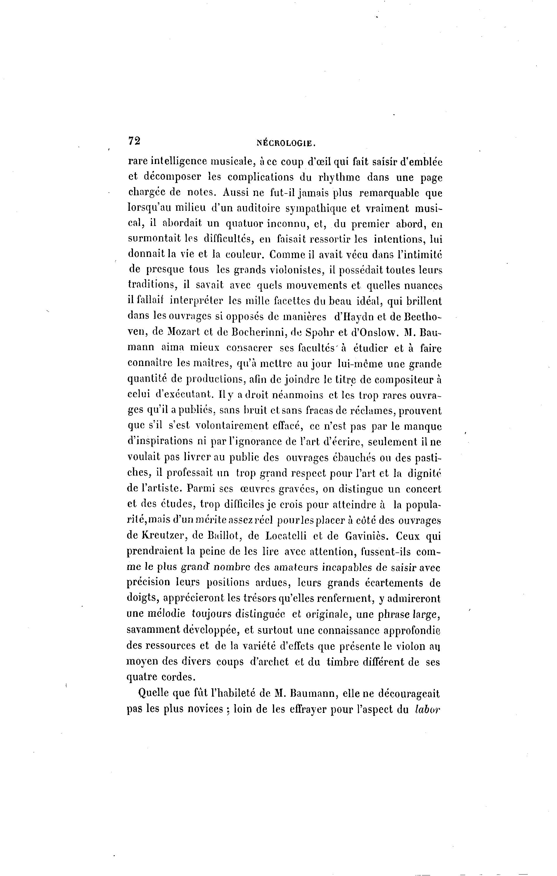 72 NÉCROLOGIE. rare intelligence musicale, à ce coup d'œil qui fait saisir d'emblée et décomposer les complications du rbythme dans une page chargée de notes. Aussi ne fut-il jamais plus remarquable que lorsqu'au milieu d'un auditoire sympathique et vraiment musi- cal, il abordait un quatuor inconnu, et, du premier abord, en surmontait les difficultés, en faisait ressortir les intentions, lui donnait la vie et la couleur. Comme il avait vécu dans l'intimité de presque tous les grands violonistes, il possédait toutes leurs traditions, il savait avec quels mouvements et quelles nuances il fallait interpréter les mille facettes du beau idéal, qui brillent dans les ouvrages si opposés de manières d'Haydn et de Beetho- ven, de Mozart et de Bocherinni, de Spohr et d'Onslow. M. Bau- mann aima mieux consacrer ses facultés'à étudier et à faire connaître les maîtres, qu'à mettre au jour lui-même une grande quantité de productions, afin de joindre le titre de compositeur à celui d'exécutant. Il y adroit néanmoins et les trop rares ouvra- ges qu'il a publiés, sans bruit et sans fracas de réclames, prouvent que s'il s'est volontairement effacé, ce n'est pas par le manque d'inspirations ni par l'ignorance de l'art d'écrire, seulement il ne voulait pas livrer au public des ouvrages ébauchés ou des pasti- ches, il professait un trop grand respect pour l'art et la dignité de l'artiste. Parmi ses œuvres gravées, on distingue un concert et des études, trop difficiles je crois pour atteindre à la popula- rité, mais d'un mérite assez réel pour les placer à côté des ouvrages de Kreutzer, de Baillot, de Locatelli et de Gavinics. Ceux qui prendraient la peine de les lire avec attention, fussent-ils com- me le plus grand* nombre des amateurs incapables de saisir avec précision leurs positions ardues, leurs grands écartements de doigts, apprécieront les trésors qu'elles renferment, y admireront une mélodie toujours distinguée et originale, une phrase large, savamment développée, et surtout une connaissance approfondie des ressources et de la variété d'effets que présente le violon aij moyen des divers coups d'archet et du timbre différent de ses quatre cordes. Quelle que fût l'habileté de M. Baumann, elle ne décourageait pas les plus novices : loin de les effrayer pour l'aspect du labor