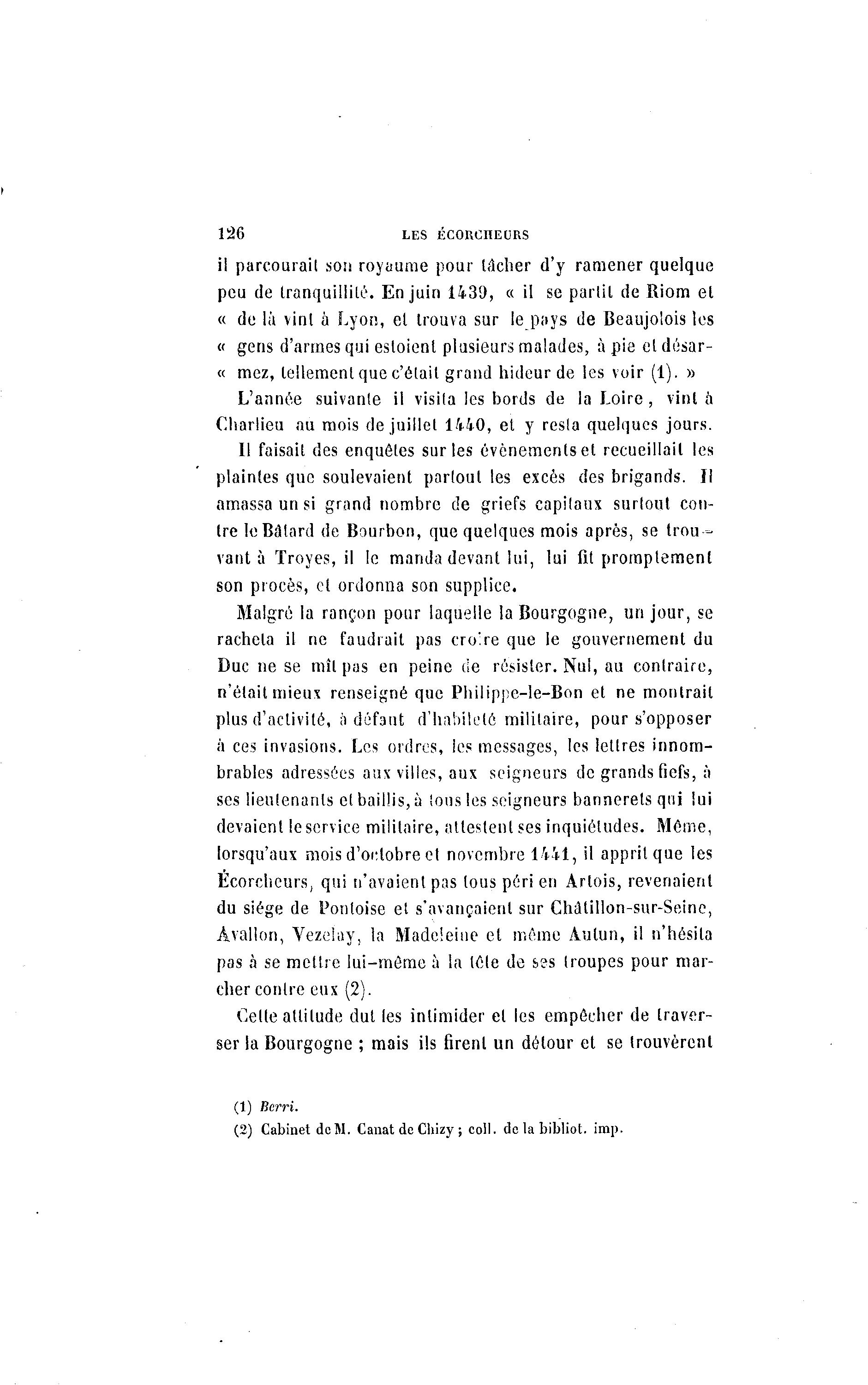 126 LES ÉCORCHEURS il parcourait son royaume pour tâcher d'y ramener quelque peu de tranquillité. En juin 1439, « il se partit de Riom et « de là vint à Lyon, et trouva sur le pays de Beaujolois les « gens d'armes qui esloient plusieurs malades, à pie et désar- « mez, tellement que c'était grand hideur de les voir (1). » L'année suivante il visila les bords de la Loire , vint à Cbarlieu au mois de juillet 1440, et y resta quelques jours. Il faisait des enquêtes sur les événements et recueillait les plaintes que soulevaient partout les excès des brigands. Il amassa un si grand nombre de griefs capitaux surtout con- tre le Bâtard de Bourbon, que quelques mois après, se trou- vant à Troyes, il le manda devant lui, lui fit promptement son procès, et ordonna son supplice. Malgré la rançon pour laquelle la Bourgogne, un jour, se racheta il ne faudrait pas croire que le gouvernement du Duc ne se mît pas en peine de résister. Nul, au contraire, n'était mieux renseigné que Philippe-le-Bon et ne montrait plus d'activité, à défaut d'habileté militaire, pour s'opposer à ces invasions. Les ordres, les messages, les lettres innom- brables adressées aux villes, aux seigneurs de grands fiefs, à ses lieutenants et baillis, à ions les seigneurs bannerets qui lui devaient le service militaire, attestent ses inquiétudes. Môme, lorsqu'aux mois d'octobre et novembre 1441, il apprit que les Écorclicurs, qui n'avaient pas tous péri en Artois, revenaient du siège de Ponloise et s'avançaient sur Châtillon-sur-Seine, Âvallon, Vezelay, la Madeleine et même Autun, il n'hésita pas à se mettre lui-môme à la tôle de ses troupes pour mar- cher contre eux (2). Celle altitude dut les intimider et les empocher de traver- ser la Bourgogne ; mais ils firent un détour et se trouvèrent (1) Barri. (2) Cabinet de M. Canat de Cliizy ; coll. de la bibliot. imp.