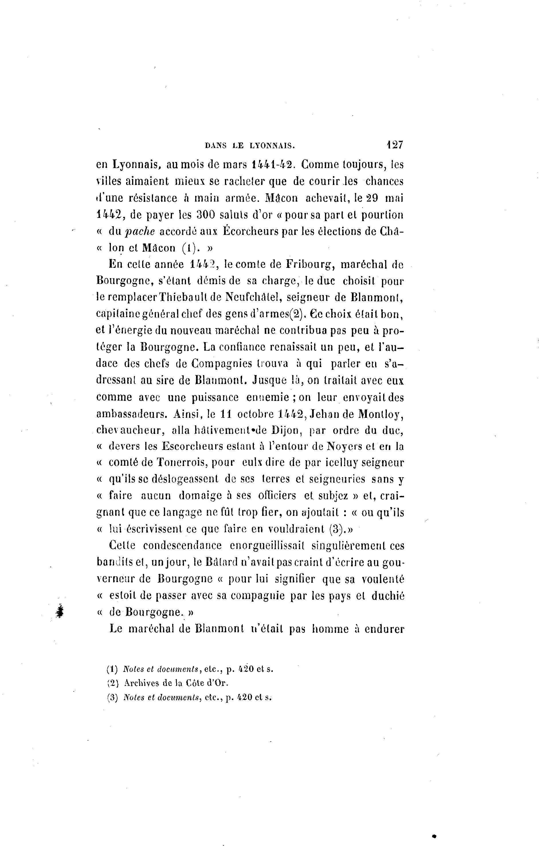 DANS LE LYONNAIS. 127 en Lyonnais, au mois de mars 1441-42. Comme toujours, les villes aimaient mieux se racheler que de courir les chances d'une résistance a main armée. Mâcon achevait, le "29 mai 1442, de payer les 300 saluls d'or «poursa pari et pourlion « du pache accordé aux Écorcheurs par les élections de Châ- « Ion et Mâcon (l). » En cette année 144:?, le comte de Fribourg, maréchal de Bourgogne, s'étant démis de sa charge, le duc choisit pour le remplacerThiebault de Neufchalel, seigneur de Blanmonl, capilainegônôralchef des gensd'armes(2). Ce choix était bon, et l'énergie du nouveau maréchal ne contribua pas peu à pro- téger la Bourgogne. La confiance renaissait un peu, et l'au- dace des chefs de Compagnies trouva à qui parler en s'u- drcssanl au sire de Blanmonl. Jusque là , on traitait avec eux comme avec une puissance emiemie;on leur envoyait des ambassadeurs. Ainsi, le 11 octobre 1442, Jehan de Montloy, chevaucheur, alla hâtivement»de Dijon, par ordre du duc, « devers les Escorcheurs estant à l'entour de Noyers et en la « comté de Tonerrois, pour eulx dire de par icelluy seigneur « qu'ils se déslogeassent de ses terres et seigneuries sans y « faire aucun domaige à ses officiers et subjez » et, crai- gnant que ce langage ne fût trop fier, on ajoutait : « ou qu'ils « lui éscrivissent ce que faire en voudraient (3).» Celle condescendance enorgueillissait singulièrement ces bandits et, un jour, le Bâtard n'avait pas craint d'écrire au gou- verneur de Bourgogne « pour lui signifier que sa voulenté « estoit de passer avec sa compagnie par les pays et duchié « de Bourgogne. » Le maréchal de Blanmonl n'était pas homme à endurer (1) Noies et documents, etc., p. 420 et s. (2) Archives de la Côte d'Or. (3) Notes et documents, etc., p. 420 cl s.