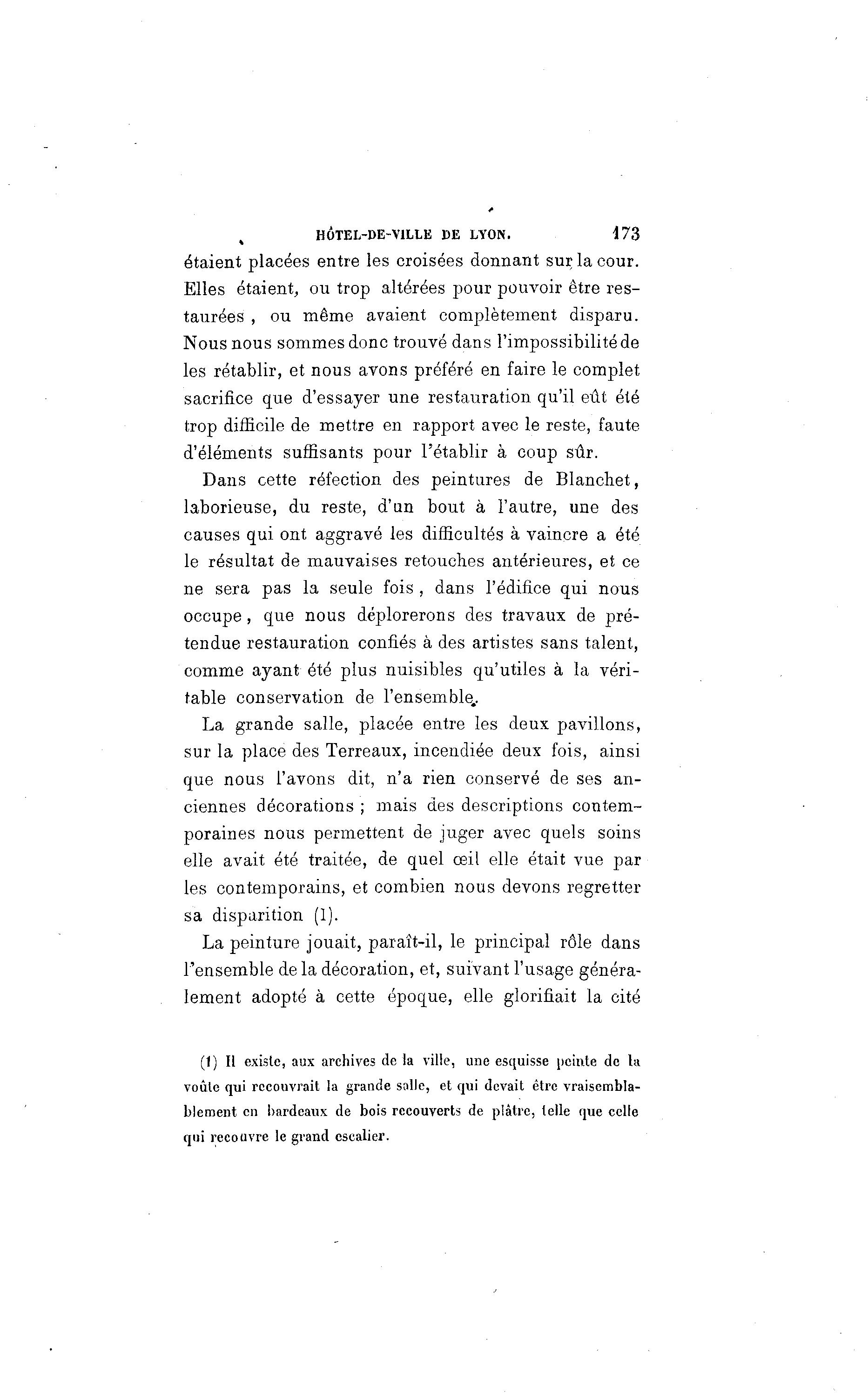 HÔTEL-DE-VILLE DE LYOPJ. 173 étaient placées entre les croisées donnant sur la cour. Elles étaient, ou trop altérées pour pouvoir être res- taurées , ou même avaient complètement disparu. Nous nous sommes donc trouvé dans l'impossibilité de les rétablir, et nous avons préféré en faire le complet sacrifice que d'essayer une restauration qu'il eût été trop difficile de mettre en rapport avec le reste, faute d'éléments suffisants pour l'établir à coup sûr. Dans cette réfection des peintures de Blanchet, laborieuse, du reste, d'un bout à l'autre, une des causes qui ont aggravé les difficultés à vaincre a été le résultat de mauvaises retouches antérieures, et ce ne sera pas la seule fois , dans l'édifice qui nous occupe, que nous déplorerons des travaux de pré- tendue restauration confiés à des artistes sans talent, comme ayant été plus nuisibles qu'utiles à la véri- table conservation de l'ensemble.. La grande salle, placée entre les deux pavillons, sur la place des Terreaux, incendiée deux fois, ainsi que nous l'avons dit, n'a rien conservé de ses an- ciennes décorations ; mais des descriptions contem- poraines nous permettent de juger avec quels soins elle avait été traitée, de quel œil elle était vue par les contemporains, et combien nous devons regretter sa disparition (1). La peinture jouait, paraît-il, le principal rôle dans l'ensemble de la décoration, et, suivant l'usage généra- lement adopté à cette époque, elle glorifiait la cité (1) Il existe, aux archives de la ville, une esquisse pointe de la voûte qui recouvrait la grande salle, et qui devait être vraisembla- blement en bardeaux de bois recouverts de plâtre, telle que celle qui recouvre le grand escalier.