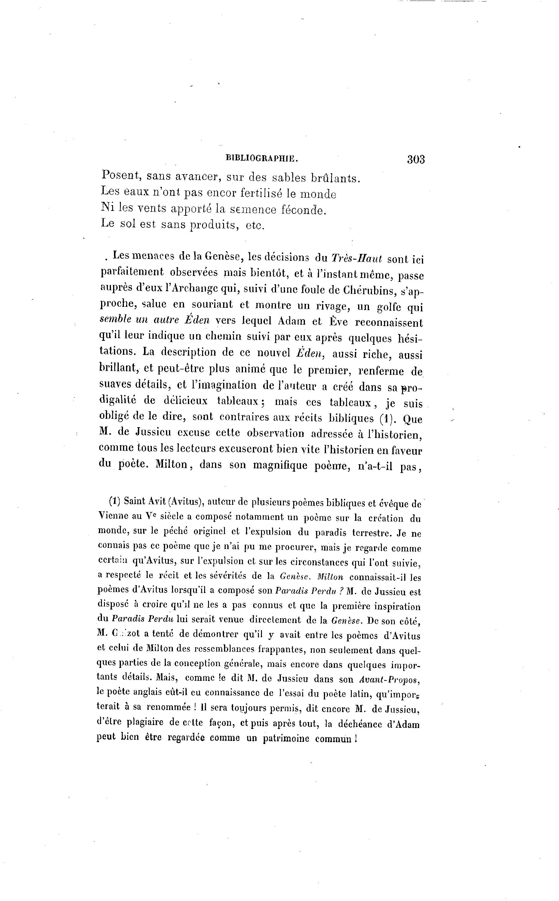 BIBLIOGRAPHIE. 303 Posent, sans avancer, sur des sables brûlants Les eaux n'ont pas encor fertilisé le monde Ni les vents apporté la semence féconde. Le sol est sans produits, etc. Les menaces de la Genèse, les décisions du Très-Haut sont ici parfaitement observées mais bientôt, et à l'instant même, passe auprès d'eux l'Archange qui, suivi d'une foule de Chérubins, s'ap- proche, salue en souriant et montre un rivage, un golfe qui semble un autre Eden vers lequel Adam et Lve reconnaissent qu'il leur indique un chemin suivi par eux après quelques hési- tations. La description de ce nouvel Eden, aussi riche, aussi brillant, et peut-être plus animé que le premier, renferme de suaves détails, et l'imagination de l'auteur a créé dans sa pro- digalité de délicieux tableaux ; mais ces tableaux, je suis obligé de le dire, sont contraires aux récits bibliques (1). Que M. de Jussicu excuse cette observation adressée à l'historien, comme tous les lecteurs excuseront bien vite l'historien en faveur du poète. Milton, dans son magnifique poème, n'a-t-il pas, (1) Saint Avit (Avitus), auteur de plusieurs poèmes bibliques et évèque de Vienne au Ve siècle a composé notamment un poème sur la création du monde, sur le péché originel et l'expulsion du paradis terrestre. Je ne connais pas ce poème que je n'ai pu me procurer, mais je regarde comme certain qu'Avitus, sur l'expulsion et sur les circonstances qui l'ont suivie, a respecté le récit et les sévérités de la Genèse. Milton connaissait-il les poèmes d'Avitus lorsqu'il a composé son Paradis Perdu ? M. do Jussicu est disposé à croire qu'il ne les a pas connus et que la première inspiration du Paradis Perdu lui serait venue directement de la Genèse. De son côté, M. G.;'zot a tenté de démontrer qu'il y avait entre les poèmes d'Avitus et celui de Milton des ressemblances frappantes, non seulement dans quel- ques parties de la conception générale, mais encore dans quelques impor- tants détails. Mais, comme !e dit M. de Jussicu dans son Avant-Propos, le poète anglais eût-il eu connaissance de l'essai du poète latin, qu'impor s terait à sa renommée ! Il sera toujours permis, dit encore M. de Jussicu, d'être plagiaire de celte façon, et puis après tout, la déchéance d'Adam peut bien être regardée comme un patrimoine commun !
