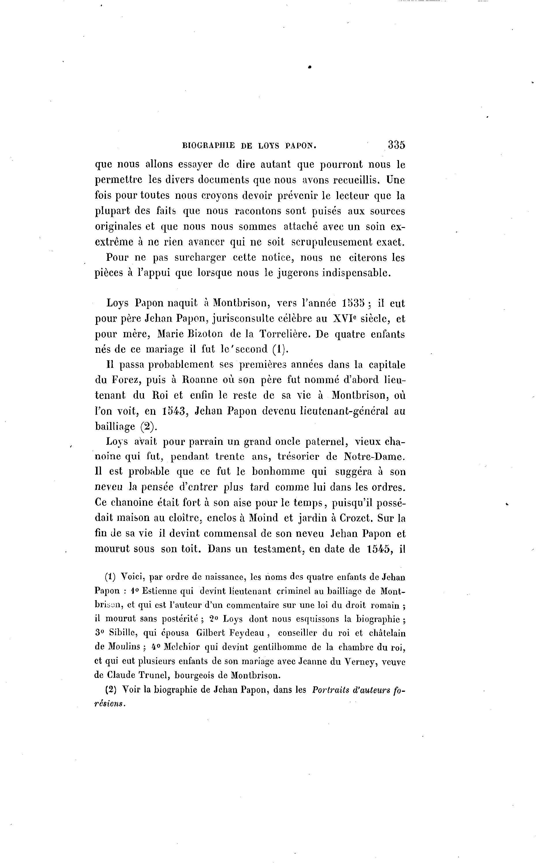 BIOGRAPHIE DE LOYS PAPON. 335 que nous allons essayer de dire autant que pourront nous le permettre les divers documents que nous avons recueillis. Une fois pour toutes nous croyons devoir prévenir le lecteur que la plupart des faits que nous racontons sont puisés aux sources originales et que nous nous sommes attaché avec un soin ex- extrême à ne rien avancer qui ne soit scrupuleusement exact. Pour ne pas surcharger cette notice, nous ne citerons les pièces à l'appui que lorsque nous le jugerons indispensable. Loys Papon naquit à Montbrison, vers l'année 1535 ; il eut pour père Jehan Papon, jurisconsulte célèbre au XVIe siècle, et pour mère, Marie Bizoton de la Torrelière. De quatre enfants nés de ce mariage il fut le'second (1). Il passa probablement ses premières années dans la capitale du Forez, puis à Roanne où son père fut nommé d'abord lieu- tenant du Roi et enfin le reste de sa vie à Montbrison, où l'on voit, en 1543, Jehan Papon devenu lieutenant-général au bailliage (2). Loys avait pour parrain un grand oncle paternel, vieux cha- noine qui fut, pendant trente ans, trésorier de Notre-Dame. Il est probable que ce fut le bonhomme qui suggéra à son neveu la pensée d'entrer plus tard comme lui dans les ordres. Ce chanoine était fort à son aise pour le temps, puisqu'il possé- dait maison au cloître, enclos à Moind et jardin à Crozct. Sur la fin de sa vie il devint commensal de son neveu Jehan Papon et mourut sous son toit. Dans un testament, en date de 1545, il (1) Voici, par ordre de naissance, les noms des quatre enfants de Jehan Papon : 1° Estienne qui devint lieutenant criminel au bailliage de Mont- brison, et qui est l'auteur d'un commentaire sur une loi du droit romain ; il mourut sans postérité ; 2° Loys dont nous esquissons la biographie ; 3° Sibille, qui épousa Gilbert Feydeau , conseiller du roi et châtelain de Moulins ; 4° Melchior qui devint gentilhomme de la chambre du roi, et qui eut plusieurs enfants de son mariage avec Jeanne du Verney, veuve de Claude Trunel, bourgeois de Montbrison. (2) Voir la biographie de Jehan Papon, dans les Portraits d'auteurs fo- résiens.