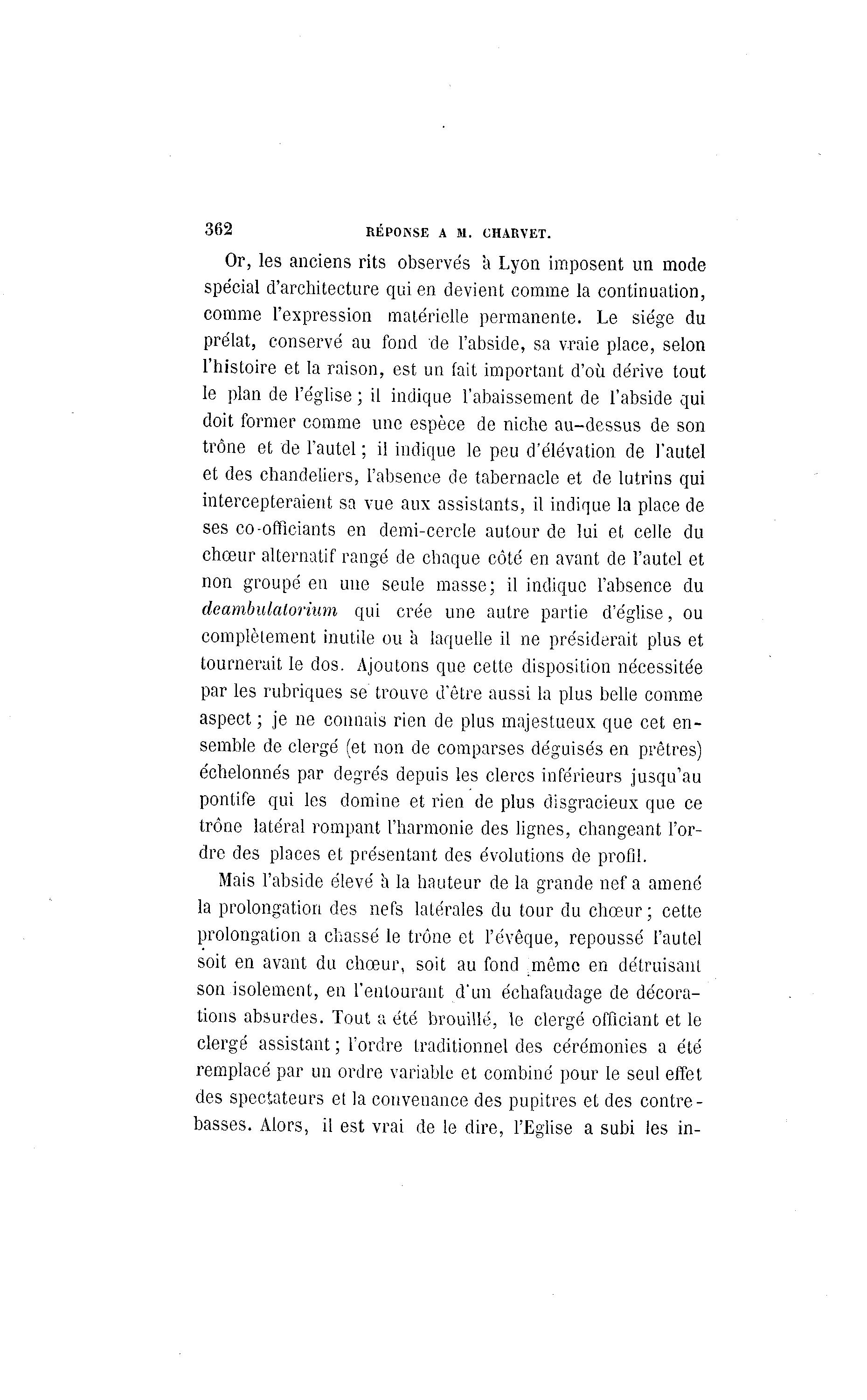 362 RÉPONSE A M. CHARVET. Or, les anciens rits observés a Lyon imposent un mode spécial d'architecture qui en devient comme la continuation, comme l'expression matérielle permanente. Le siège du prélat, conservé au fond de l'abside, sa vraie place, selon l'histoire et la raison, est un fait important d'où dérive tout le plan de l'église ; il indique l'abaissement de l'abside qui doit former comme une espèce de niche au-dessus de son trône et de l'autel ; il indique le peu d'élévation de l'autel et des chandeliers, l'absence de tabernacle et de lutrins qui intercepteraient sa vue aux assistants, il indique la place de ses co-officiants en demi-cercle autour de lui et celle du chœur alternatif rangé de chaque côté en avant de l'autel et non groupé en une seule masse; il indique l'absence du deambulatorium qui crée une autre partie d'église, ou complètement inutile ou à laquelle il ne présiderait plus et tournerait le dos. Ajoutons que cette disposition nécessitée par les rubriques se trouve d'être aussi la plus belle comme aspect ; je ne connais rien de plus majestueux que cet en- semble de clergé (et non de comparses déguisés en prêtres) échelonnés par degrés depuis les clercs inférieurs jusqu'au pontife qui les domine et rien de plus disgracieux que ce trône latéral rompant l'harmonie des lignes, changeant l'or- dre des places et présentant des évolutions de profil. Mais l'abside élevé à la hauteur de la grande nef a amené la prolongation des nefs latérales du tour du chœur ; cette prolongation a chassé le trône et l'évêque, repoussé l'autel soit en avant du chœur, soit au fond nième en détruisant son isolement, en l'entourant d'un échafaudage de décora- tions absurdes. Tout a été brouillé, le clergé officiant et le clergé assistant ; l'ordre traditionnel des cérémonies a été remplacé par un ordre variable et combiné pour le seul effet des spectateurs et la convenance des pupitres et des contre- basses. Alors, il est vrai de le dire, l'Eglise a subi les in-