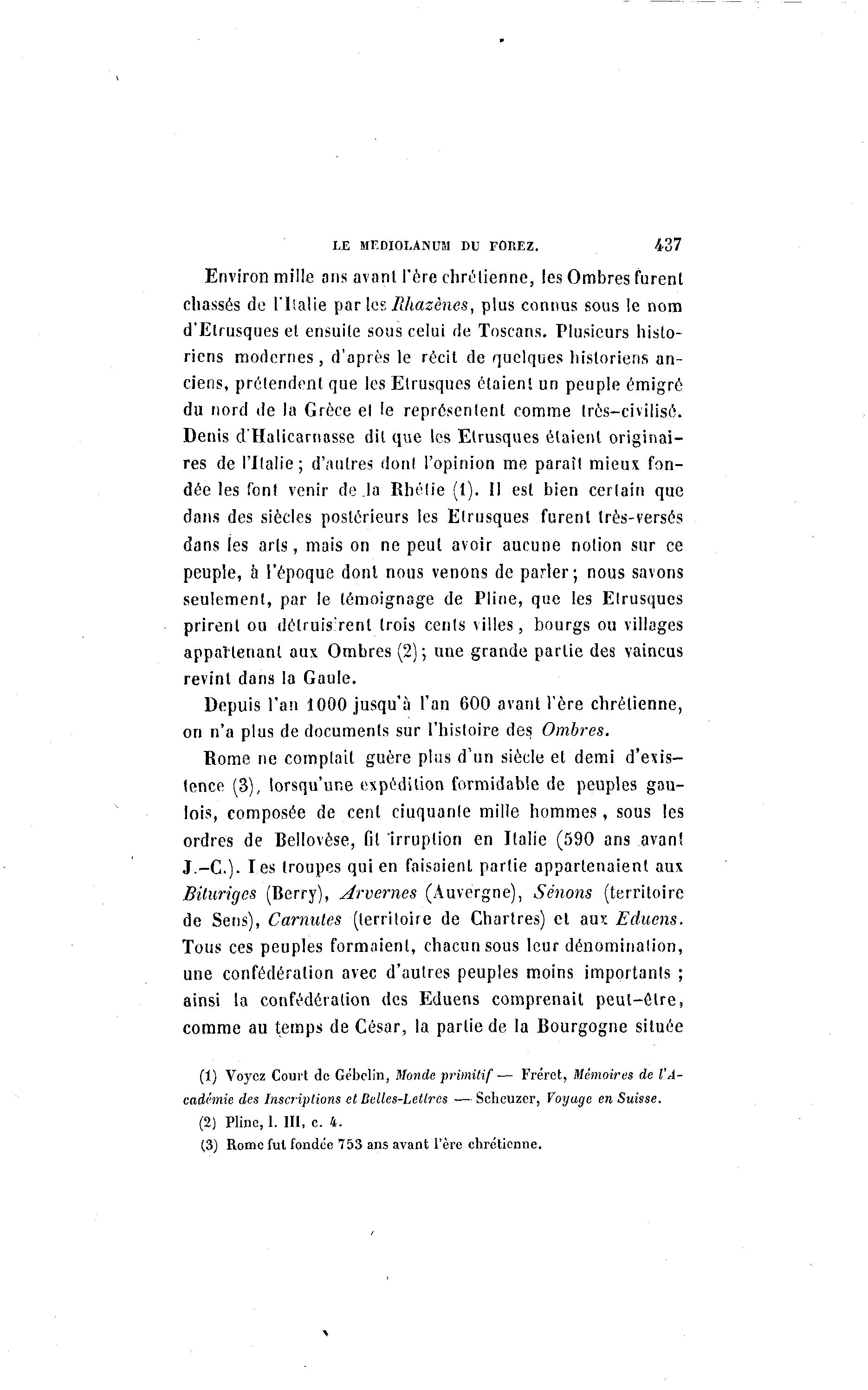 LE Mr.DIOLANOSl DU FOREZ. 437 Environ mille ans avant l'ère chrétienne, les Ombres furent chassés de l'Italie par les Rhazènes, plus connus sous le nom d'Etrusques et ensuite sous celui de Toscans. Plusieurs histo- riens modernes, d'après le récit de quelques historiens an- ciens, prétendent que les Etrusques étaient un peuple émigré du nord de la Grèce el le représentent comme très-civilisé. Denis d'Halicamasse dit que les Etrusques étaient originai- res de l'Italie; d'autres dont l'opinion me paraît mieux fon- dée les font venir de la Rhélie (1). 11 est bien cerlain que dans des siècles postérieurs les Etrusques furent très-versés dans les arls, mais on ne peut avoir aucune notion sur ce peuple, à l'époque dont nous venons de parler; nous savons seulement, par le témoignage de Pline, que les Elrusques prirent ou détruisirent trois cents villes, bourgs ou villages appartenant aux Ombres (2) ; une grande partie des vaincus revint dans la Gaule. Depuis l'an 1000 jusqu'à l'an 600 avant l'ère chrétienne, on n'a plus de documents sur l'histoire des Ombres. Rome ne comptait guère plus d'un siècle et demi d'exis- tence (3), lorsqu'une expédition formidable de peuples gau- lois, composée de cent ciuquanle mille hommes, sous les ordres de Bellovèse, fit "irruption en Italie (590 ans avant J.-C.). les troupes qui en faisaient partie appartenaient aux Biluriges (Berry), Arvernes (Auvergne), Sénons (territoire de Sens), Carnutes (territoire de Chartres) et aux Eduens. Tous ces peuples formaient, chacun sous leur dénomination, une confédération avec d'autres peuples moins importants ; ainsi la confédération des Eduens comprenait peut-être, comme au temps de César, la partie de la Bourgogne située (1) Voyez Court de Gébclin, Monde primitif— Fréret, Mémoires de l'A- cadémie des Inscriptions et Belles-Lettres — Scheuzcr, Voyage en Suisse. (2) Pline, 1. III, c. 4. (3) Rome fui fondée 753 ans avant l'ère chrétienne.