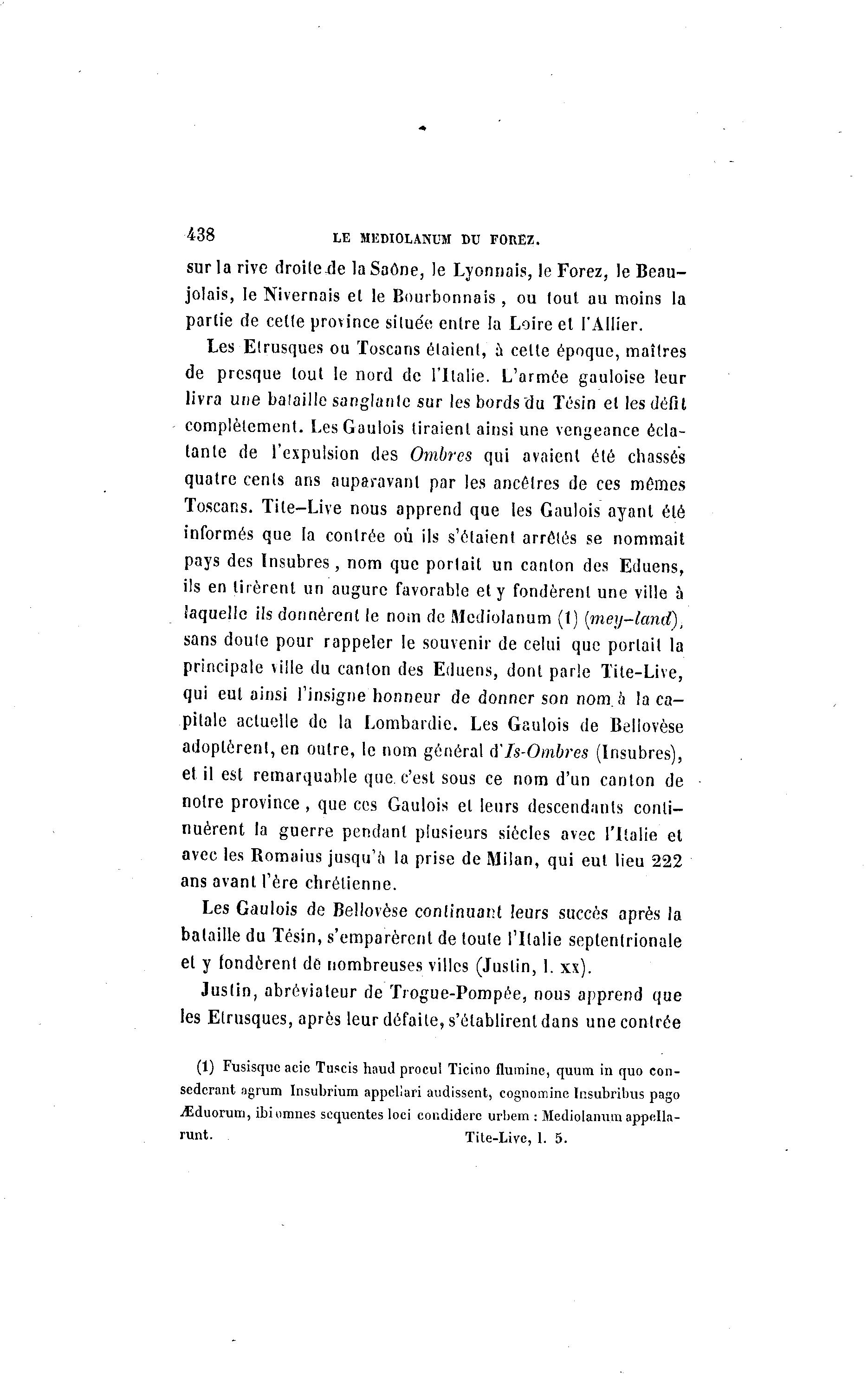 438 LE MKDIOLANUM BU FOREZ. sur la rive droite.de la Saône, le Lyonnais, le Forez, le Beau- jolais, le Nivernais et le Bourbonnais, ou tout au moins la partie de cette province situe'e entre la Loire et l'Allier. Les Etrusques ou Toscans étaient, à cette époque, maîtres de presque tout le nord de l'Italie. L'armée gauloise leur livra une bataille sanglante sur les bords du ïésin et les défit complètement. Les Gaulois tiraient ainsi une vengeance écla- tante de l'expulsion des Ovibres qui avaient été chassés quatre cents ans auparavant par les ancêtres de ces mêmes Toscans. Tite-Live nous apprend que les Gaulois ayant été informés que la contrée où ils s'étaient arrêtés se nommait pays des Insubres, nom que porlait un canton des Eduens, ils en tirèrent un augure favorable et y fondèrent une ville à laquelle ils donnèrent le nom de Mediolanum (1) (mey-land), sans doute pour rappeler le souvenir de celui que portait la principale ville du canton des Eduens, dont parle Tite-Live, qui eut ainsi l'insigne honneur de donner son nom. a la ca- pitale actuelle de la Lombardie. Les Gaulois de Bellovèse adoptèrent, en outre, le nom général d'Is-Ombres (Insubres), et il est remarquable que c'est sous ce nom d'un canton de notre province , que ces Gaulois et leurs descendants conti- nuèrent la guerre pendant plusieurs siècles avec l'Italie et avec les Romaius jusqu'à la prise de Milan, qui eut lieu 222 ans avant l'ère chrétienne. Les Gaulois de Bellovèse continuant leurs succès après la bataille du Tésin, s'emparèrent de toute l'Italie septentrionale et y fondèrent de nombreuses villes (Justin, 1. xx). Justin, abréviateur de Trogue-Pompèe, nous apprend que les Etrusques, après leur défaite, s'établirent dans une contrée (1) Fusisquc acic Tuscis haud procul Ticino flumine, quum in quo con- sederant agrum Insubrium appeliari audissent, cognomine Insubribus pago -iDduorum, ibiumnes sequentes loci condiderc urbem : Mediolamim appella- runt. Tite-Live, 1. 5.