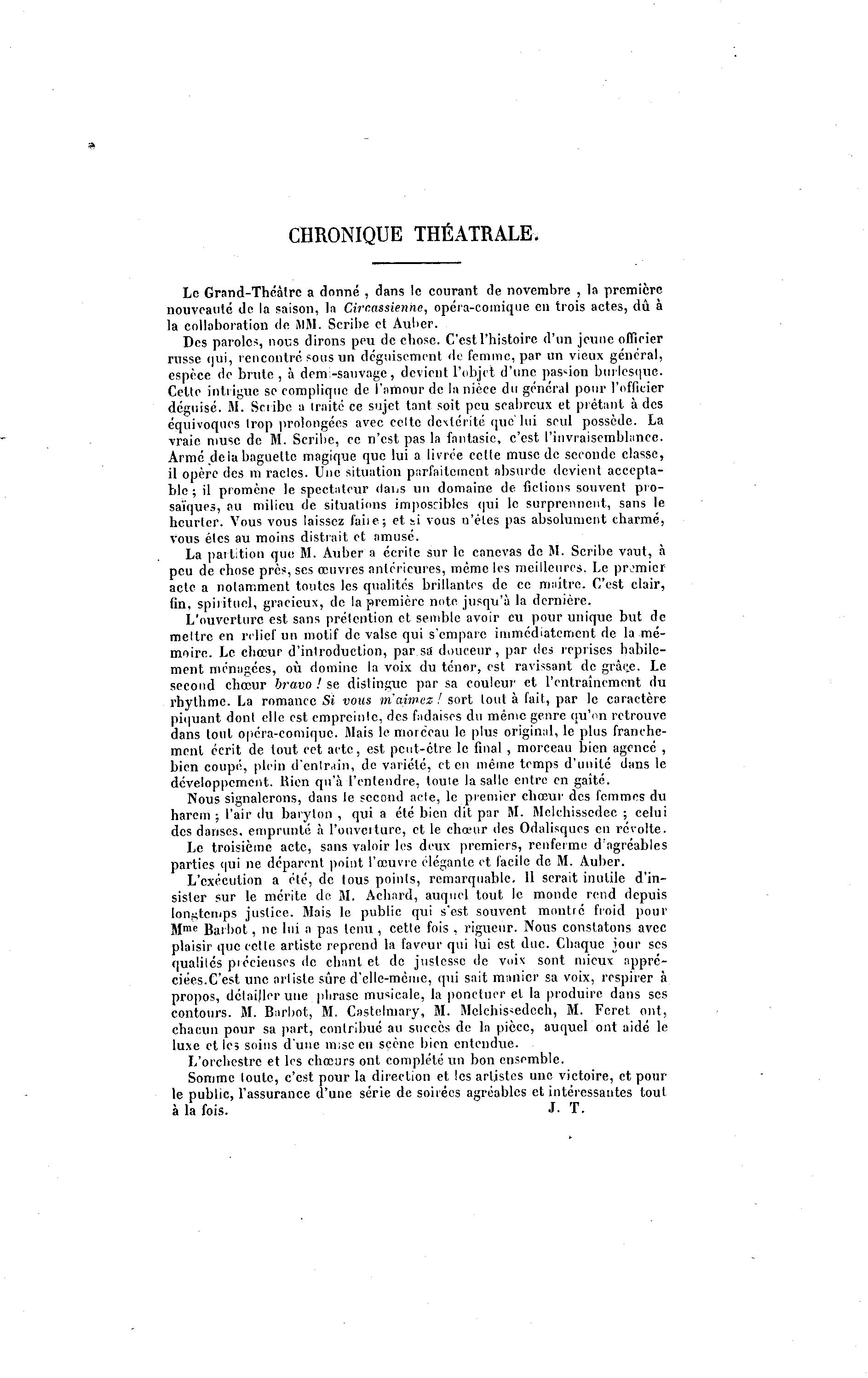 CHRONIQUE THÉÂTRALE, Le Grand-Théà lrc a donné , dans le courant de novembre , la première nouveauté de la saison, la Circassienne, opéra-comique en trois actes, dû à la collaboration de JIM. Scribe et Auber. Des paroles, nous dirons peu de chose. C'est l'histoire d'un jcxine officier russe qui, rencontré sous un déguisement de femme, par un vieux général, espèce de brute , à dem:-sauvage, devient l'objet d'une passion burlesque. Celte intrigue se complique de l'amour de la nièce du général pour l'officier déguisé. M. Scribe a traité ce sujet tant soit peu scabreux et prêtant à des équivoques trop prolongées avec celte dextérité que'lui seul possède. La vraie muse de M. Scribe, ce n'est pas la fantasie, c'est l'invraisemblance. Armé de ia baguette magique que lui a livrée cette musc de seconde classe, il opère des m racles. Une situation parfaitement absurde devient accepta- ble ; il promène le spectateur daijs un domaine de fictions souvent pro- saïques, au milieu de situations imposables qui le surprennent, sans le heurter. Vous vous laissez faiie; et si vous n'êtes pas absolument charmé, vous êtes au moins distrait et amusé. La partition que M. Auber a écrite sur le canevas de M. Scribe vaut, à peu de chose près, ses œuvres antérieures, même les meilleures. Le promicr acte a notamment tontes les qualités brillantes de ce maître. C'est clair, fin, spirituel, gracieux, de la première note jusqu'à la dernière. L'ouverture est sans prétention et semble avoir eu pour unique but de meltrc en relief un motif de valse qui s'empare immédiatement de la mé- moire. Le chœur d'introduction, par sa douceur, par i\a reprises habile- ment ménagées, où domine la voix du ténor, est ravissant de grà ç_e. Le second choeur bravo ! se distingue par sa couleur et l'entraînement du rhythme. La romance Si vous m'aimez! sort tout à fait, par le caractère piquant dont elle est empreinte, des fadaises du même genre qu'on retrouve dans tout opéra-comique. Mais le morceau le plus original, le plus franche- ment écrit de tout cet acte, est peut-être le final , morceau bien agencé , bien coupé, plein d'entrain, de variété, et en même temps d'unité dans le développement. Rien qu'à l'entendre, toute la salle entre en gaîté. Nous signalerons, dans le second acte, le premier chœur des femmes du harem ; l'air du baryton , qui a été bien dit par M. Melchissedec ; celui des danses, emprunté à l'onvciturc, et le chœur des Odalisques en révolte. Le troisième acte, sans valoir les deux premiers, renferme d'agréables parties qui ne déparent point l'œuvre élégante et facile de M. Auber. L'exécution a été, de tous points, remarquable. 11 serait inutile d'in- sister sur le mérite de M. Achard, auquel tout le monde rend depuis longtemps justice. Mais le public qui s'est souvent montré froid pour jjme Bai |>ot, ne lui a pas tenu , cette fois , rigueur. Nous constatons avec plaisir que cette artiste reprend la faveur qui lui est due. Chaque jour ses qualités précieuses de chant et de justesse de voix sont mieux appré- ciées.C'est une artiste sûre d'elle-même, qui sait manier sa voix, respirer à propos, détailler une plirase musicale, la ponctuer et la produire dans ses contours. M. Barbot, M. Castelmary, M. Mclchis*edcch, M. Feret ont, chacun pour sa part, contribué au succès de la pièce, auquel ont aidé le luxe et les soins d'une mise en scène bien entendue. L'orchestre et les chœurs ont complété un bon ensemble. Somme toute, c'est pour la direction et les artistes une victoire, et pour le public, l'assurance d'une série de soirées agréables et intéressantes tout à la fois. J. T.