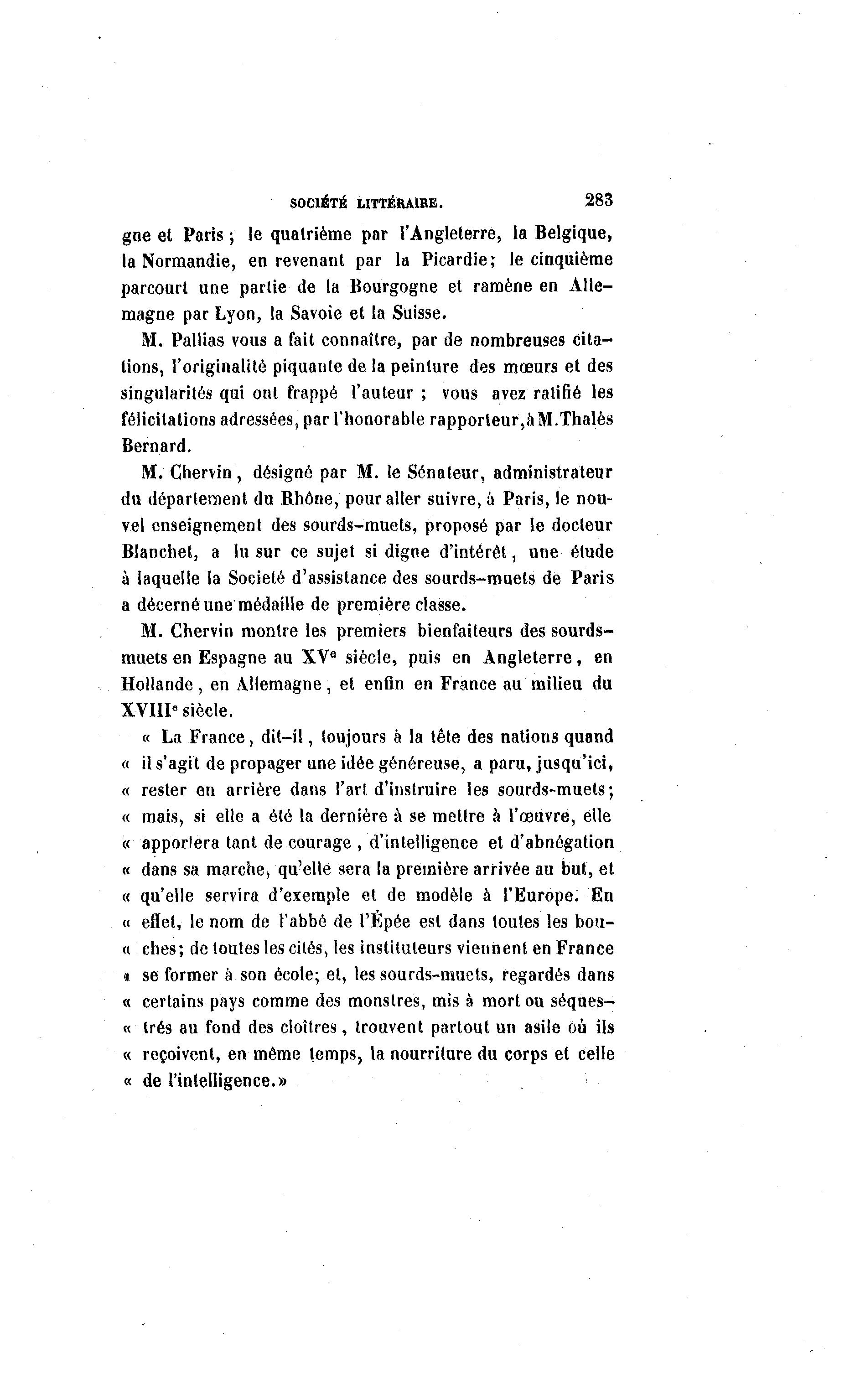 SOCIÉTÉ LITTÉRAIBE. 283 gne et Paris ; le quatrième par l'Angleterre, la Belgique, la Normandie, en revenant par la Picardie; le cinquième parcourt une partie de la Bourgogne et ramène en Alle- magne par Lyon, la Savoie et la Suisse. M. Pallias vous a fait connaître, par de nombreuses cita- lions, l'originalité piquante de la peinture des mœurs et des singularités qui ont frappé l'auteur ; vous avez ratifié les félicitations adressées, par l'honorable rapporteur,à M.Thaïes Bernard. M. Chervin, désigné par M. le Sénateur, administrateur du déparlement du Rhône, pour aller suivre, à Paris, le nou- vel enseignement des sourds-muets, proposé par le docteur Blanchet, a lit sur ce sujet si digne d'intérêt, une étude à laquelle la Société d'assistance des sourds-muets de Paris a décerné une médaille de première classe. M. Chervin montre les premiers bienfaiteurs des sourds- muets en Espagne au XVe siècle, puis en Angleterre, en Hollande, en Allemagne, et enfin en France au milieu du XVIIIe siècle. « La France, dit-il, toujours à la tête des nations quand « il s'agit de propager une idée généreuse, a paru, jusqu'ici, « rester en arrière dans l'art d'instruire les sourds-muets; « mais, si elle a été la dernière à se mettre à l'œuvre, elle « apportera tant de courage , d'intelligence et d'abnégation « dans sa marche, qu'elle sera la première arrivée au but, et « qu'elle servira d'exemple et de modèle à l'Europe. En « effet, le nom de l'abbé de l'Ëpée est dans toutes les bon- « ches; de toutes les cités, les instituteurs viennent en France i se former à son école; et, les sourds-muets, regardés dans « certains pays comme des monstres, mis à mort ou séques- « très au fond des cloîtres, trouvent partout un asile où ils « reçoivent, en même temps, la nourriture du corps et celle « de l'intelligence.»