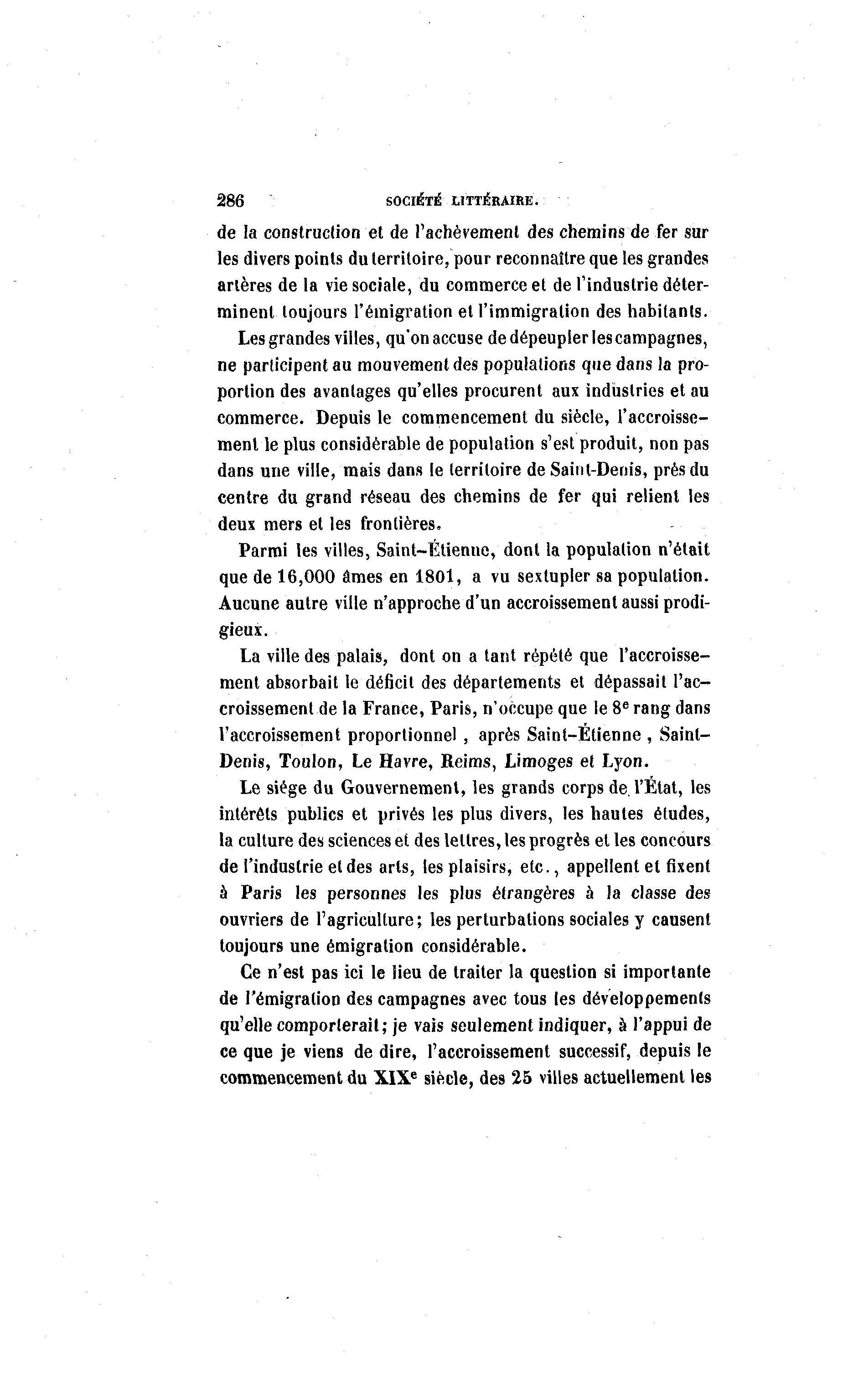 286 SOCIÉTÉ LITTÉRAIRE. de la construction et de l'achèvement des chemins de fer sur les divers points du territoire, pour reconnaître que les grandes artères de la vie sociale, du commerce et de l'industrie déter- minent toujours l'émigration et l'immigration des habitants. Les grandes villes, qu'on accuse de dépeupler les campagnes, ne participent au mouvement des populations que dans la pro- portion des avantages qu'elles procurent aux industries et au commerce. Depuis le commencement du siècle, l'accroisse- ment le plus considérable de population s'est produit, non pas dans une ville, mais dans le territoire de Saint-Denis, près du centre du grand réseau des chemins de fer qui relient les deux mers et les frontières. Parmi les villes, Saint-Étienne, dont la population n'était que de 16,000 âmes en 1801, a vu sextupler sa population. Aucune autre ville n'approche d'un accroissement aussi prodi- gieux. La ville des palais, dont on a tant répété que l'accroisse- ment absorbait le déficit des départements et dépassait l'ac- croissement de la France, Paris, n'occupe que le 8e rang dans l'accroissement proportionnel , après Saint-Etienne , Saint- Denis, Toulon, Le Havre, Reims, Limoges et Lyon. Le siège du Gouvernement, les grands corps de, l'État, les intérêts publics et privés les plus divers, les hautes éludes, la culture des sciences et des lettres, les progrès et les concours de l'industrie et des arts, les plaisirs, etc., appellent et fixent à Paris les personnes les plus étrangères à la classe des ouvriers de l'agriculture ; les perturbations sociales y causent toujours une émigration considérable. Ce n'est pas ici le lieu de traiter la question si importante de l'émigration des campagnes avec tous les développements qu'elle comporterait; je vais seulement indiquer, à l'appui de ce que je viens de dire, l'accroissement successif, depuis le commencement du XIXe siècle, des 25 villes actuellement les